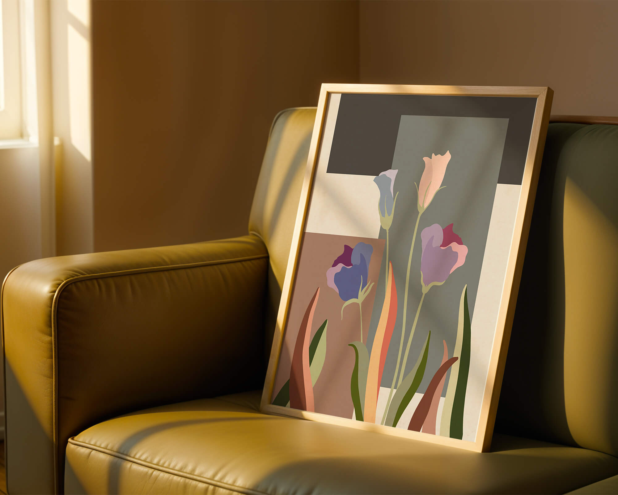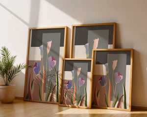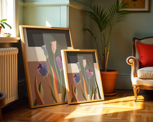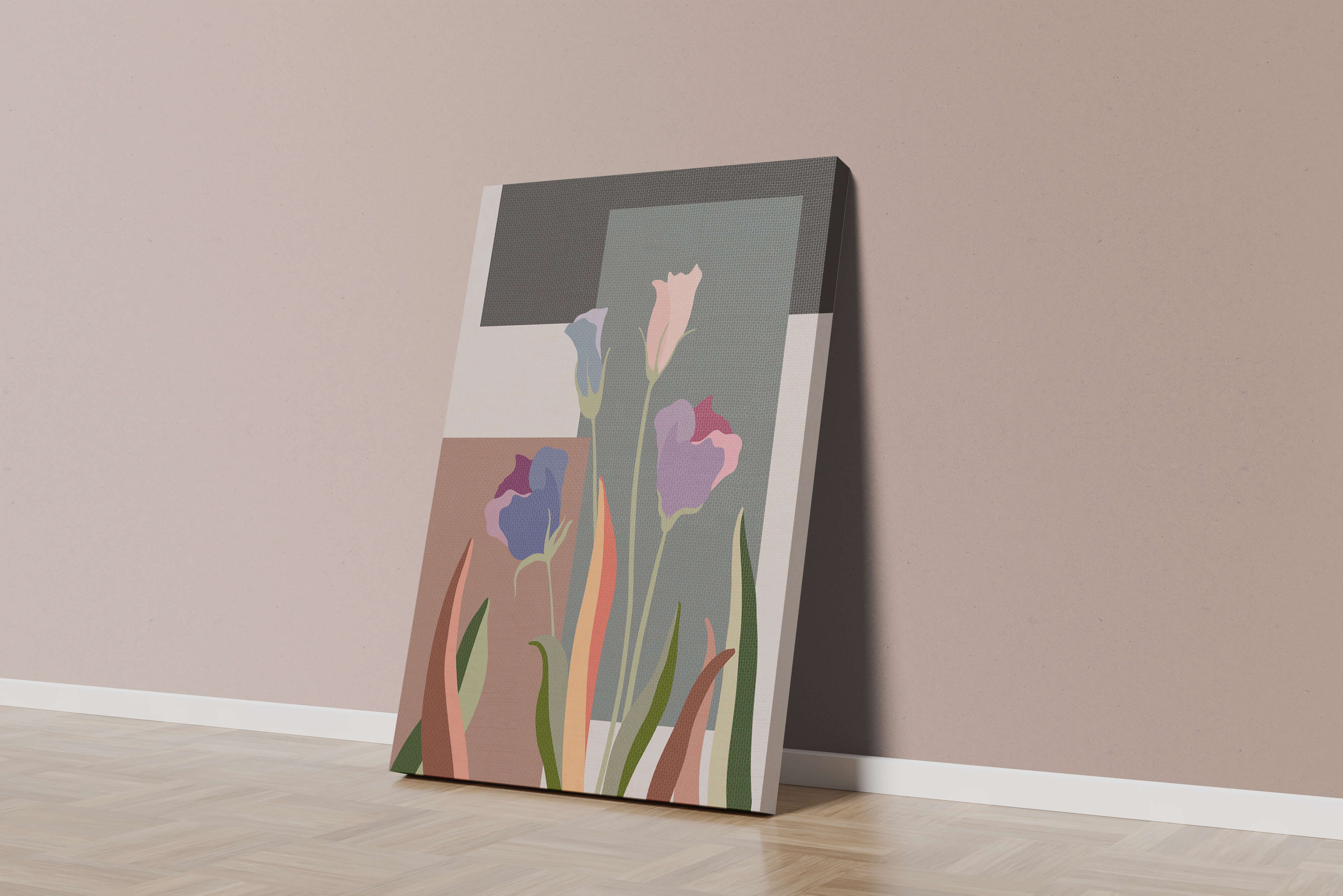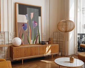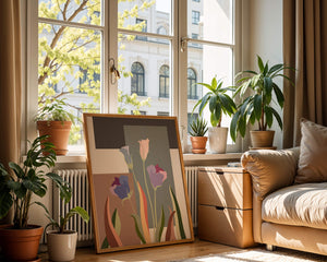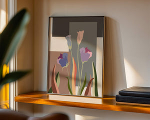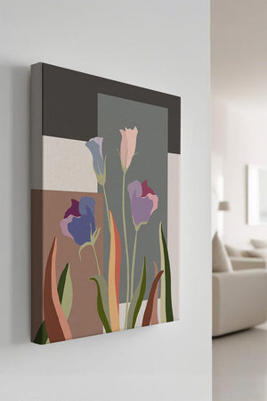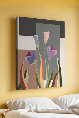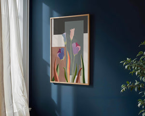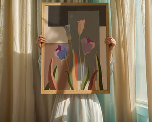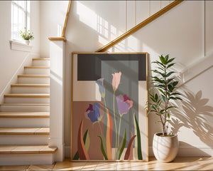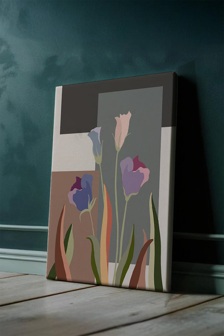 The image presents an intriguing blend of abstract floral elements with vibrant geometric shapes. The flowers are depicted with soft, pastel tones that elegantly contrast against the muted shades of the background. This art piece seamlessly merges natural beauty with modern design elements, making it a striking addition to any space.