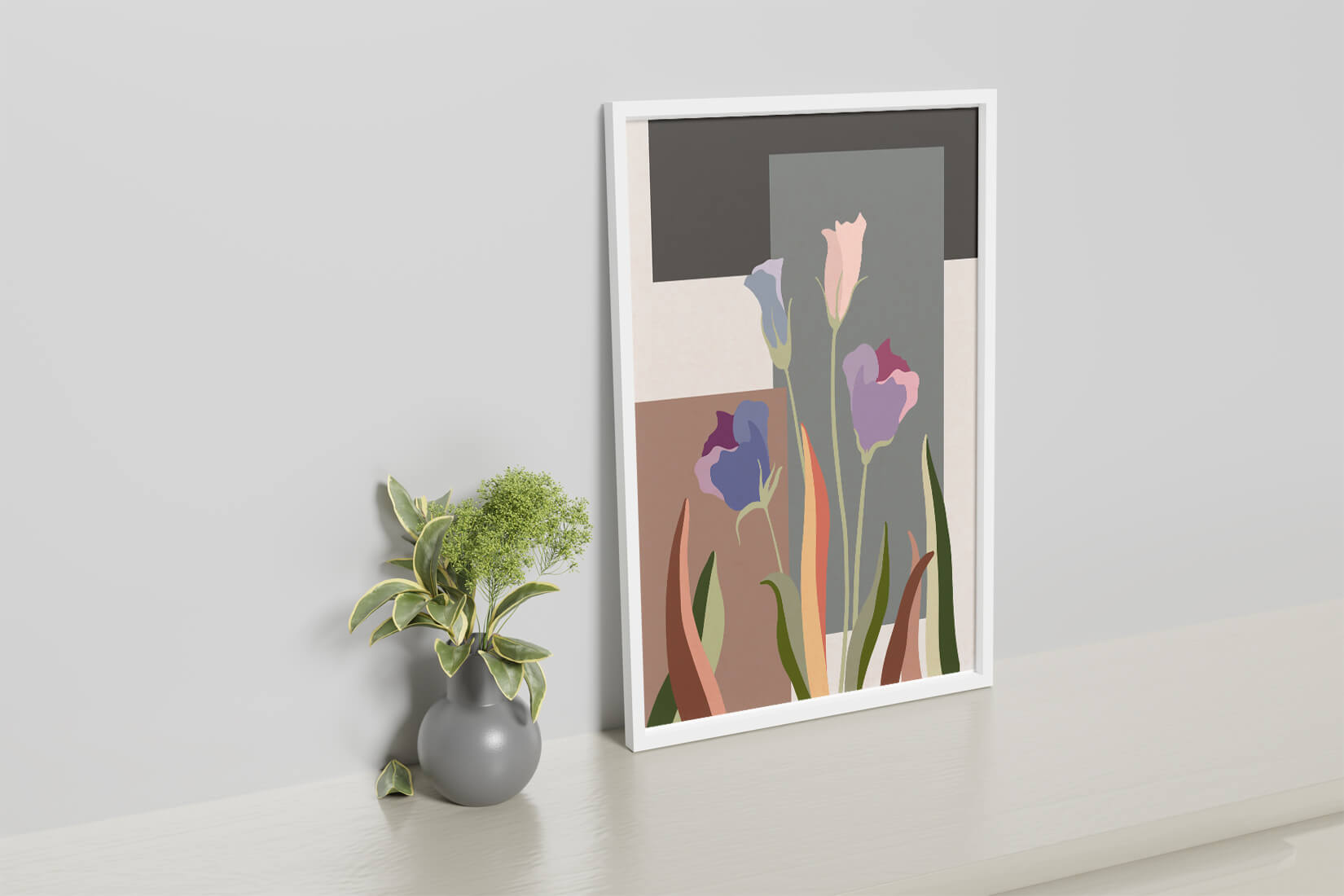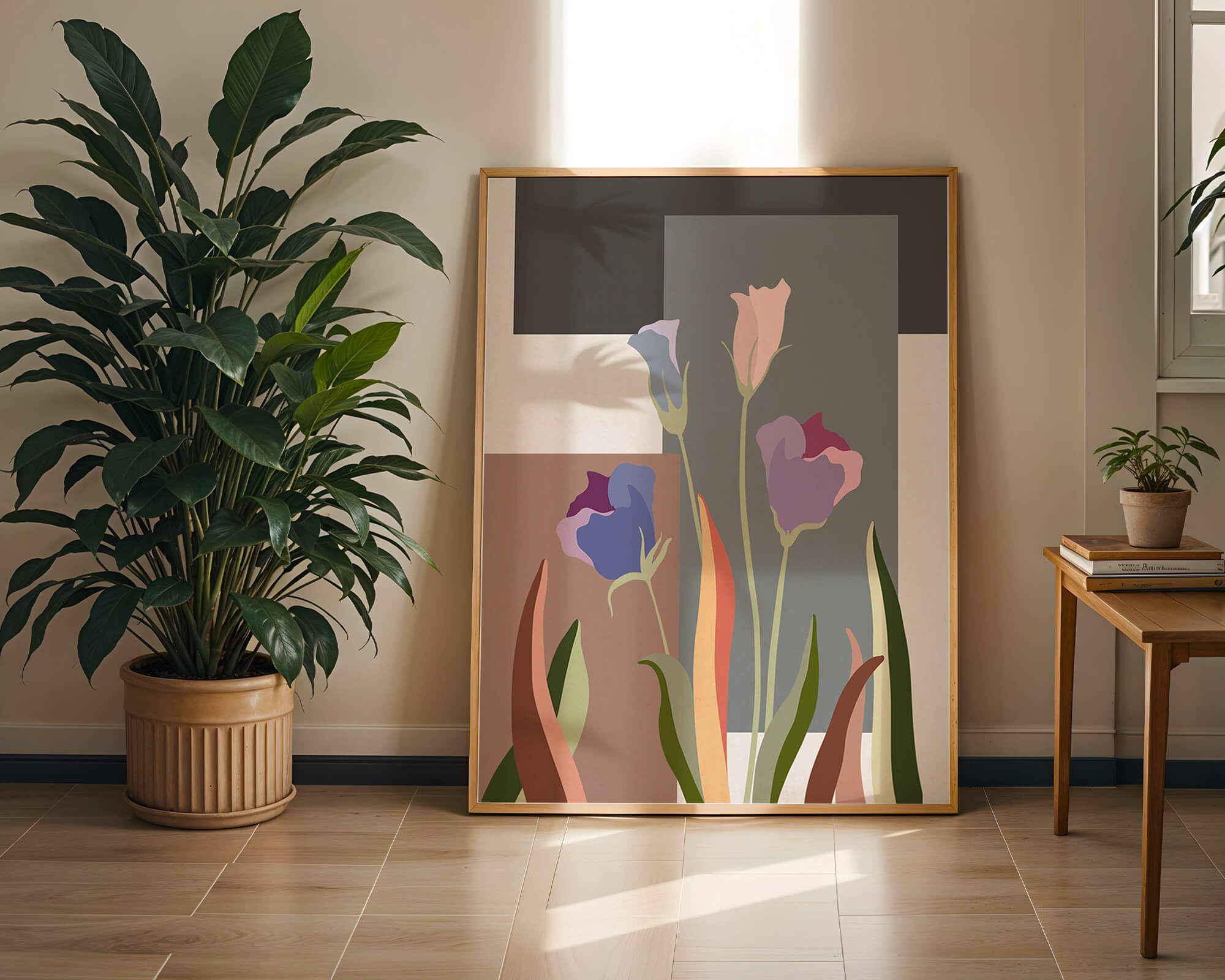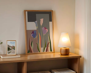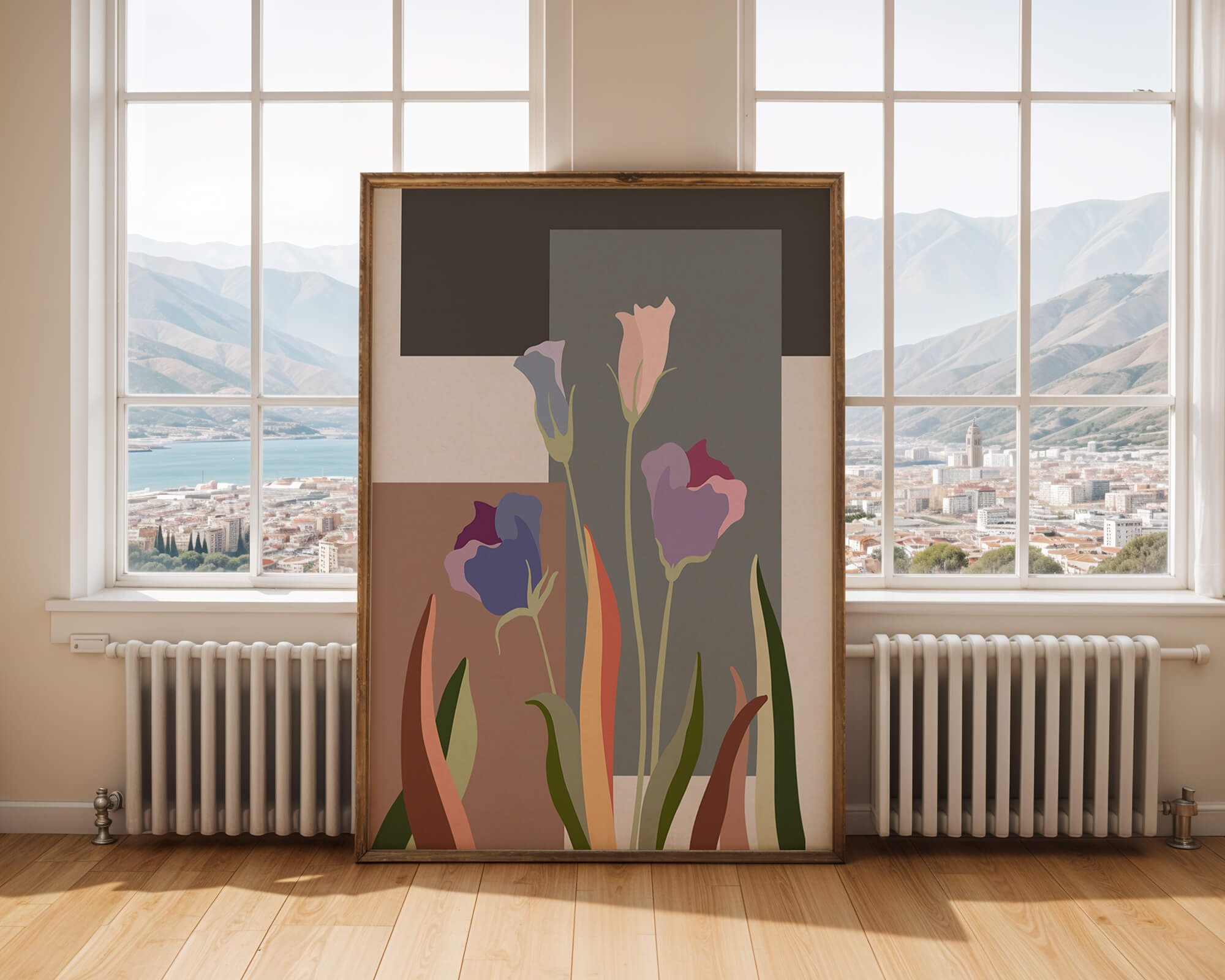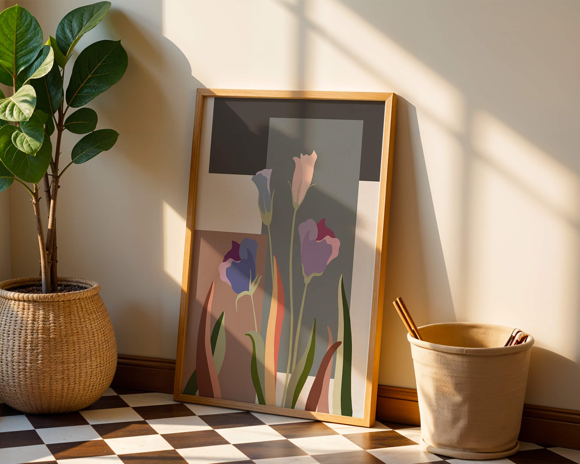 The image presents an intriguing blend of abstract floral elements with vibrant geometric shapes. The flowers are depicted with soft, pastel tones that elegantly contrast against the muted shades of the background. This art piece seamlessly merges natural beauty with modern design elements, making it a striking addition to any space.