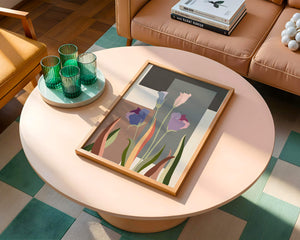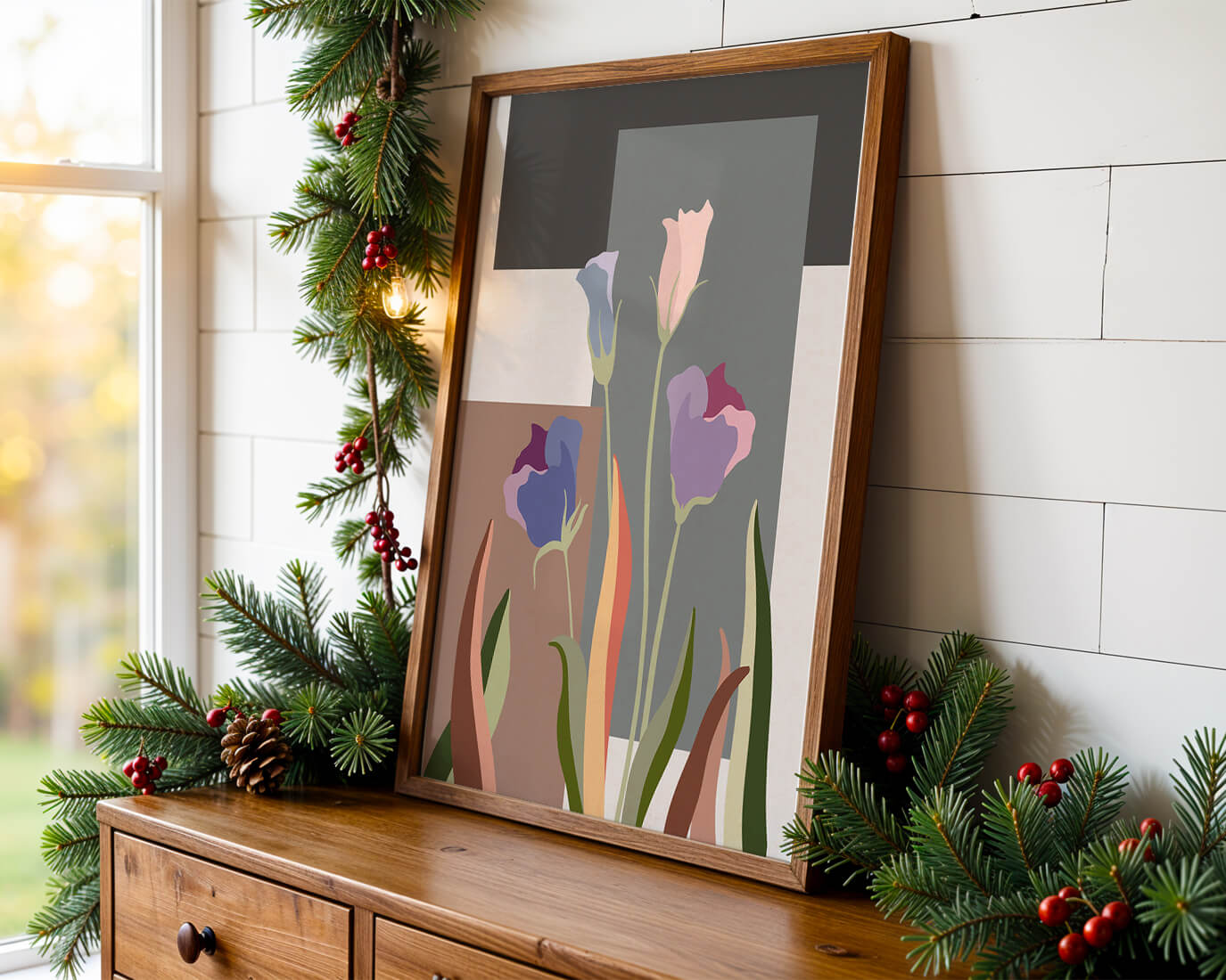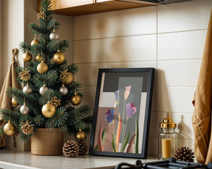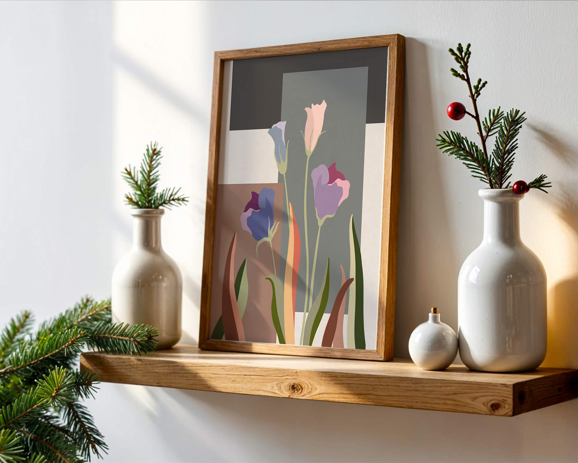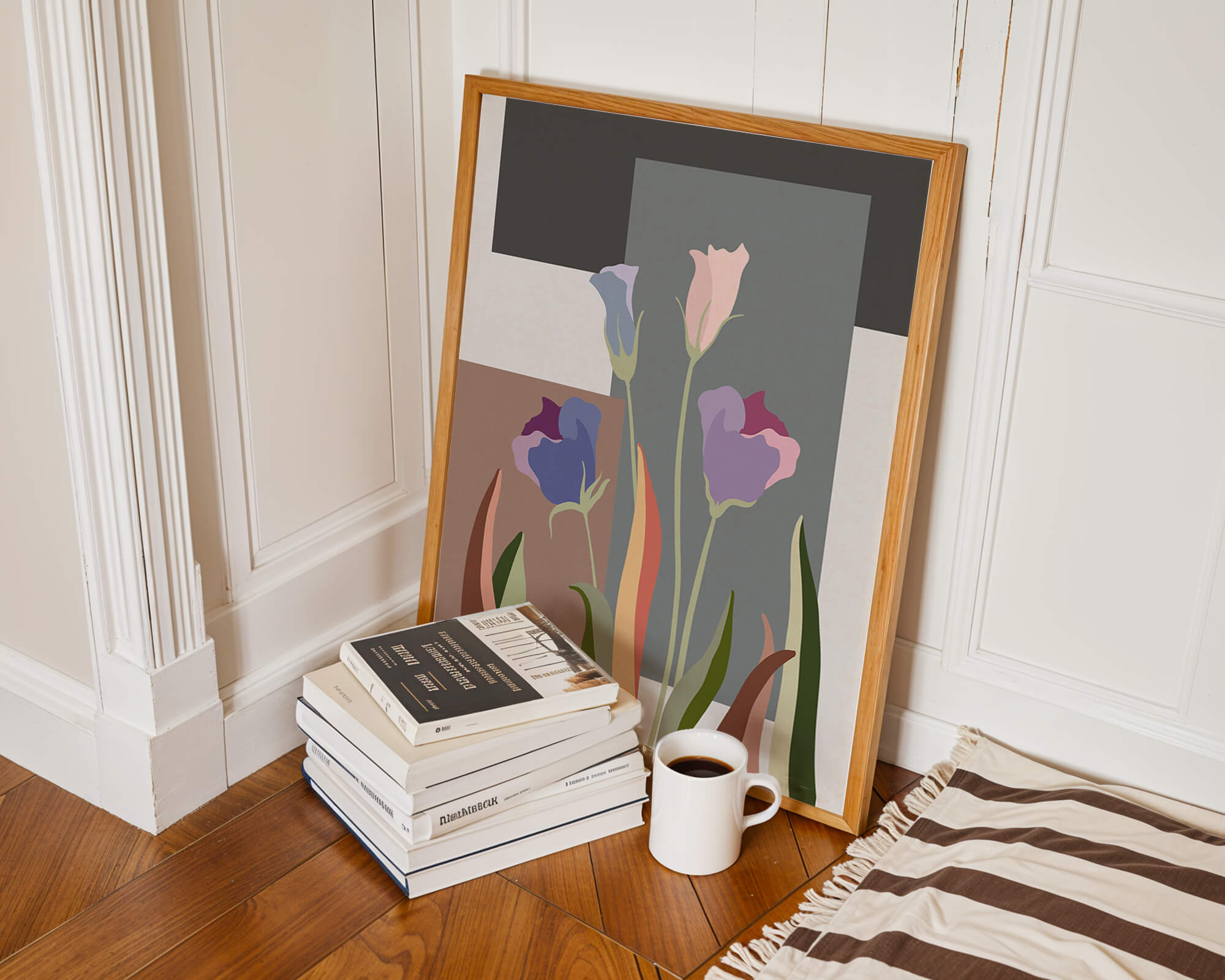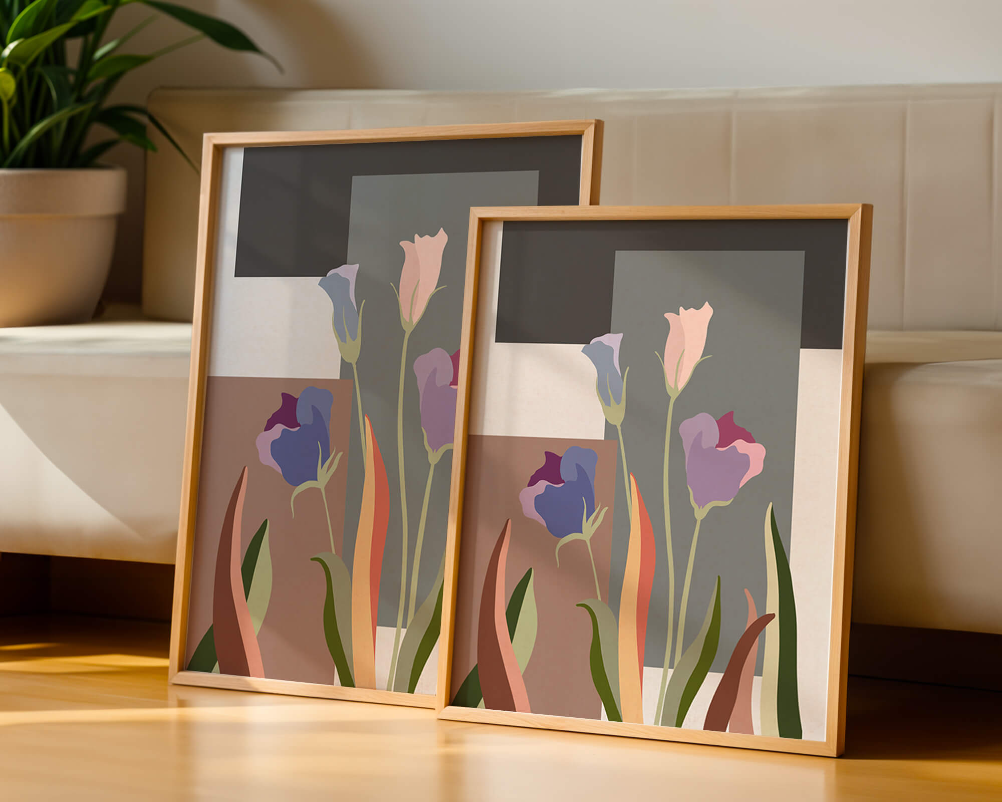 The image presents an intriguing blend of abstract floral elements with vibrant geometric shapes. The flowers are depicted with soft, pastel tones that elegantly contrast against the muted shades of the background. This art piece seamlessly merges natural beauty with modern design elements, making it a striking addition to any space.
