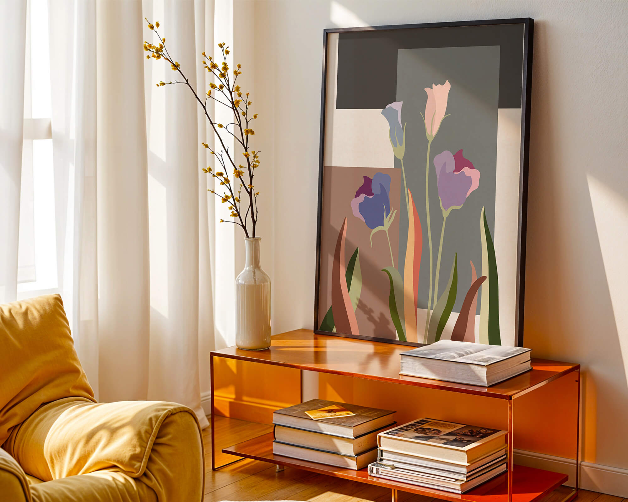 The compositions clean lines and smooth transitions between colors highlight the minimalist style, while the incorporation of bold geometrical forms adds a contemporary twist. Perfect for those who appreciate art that brings together nature’s grace with modern aesthetics, this piece adds a sense of tranquility and sophistication to any environment.