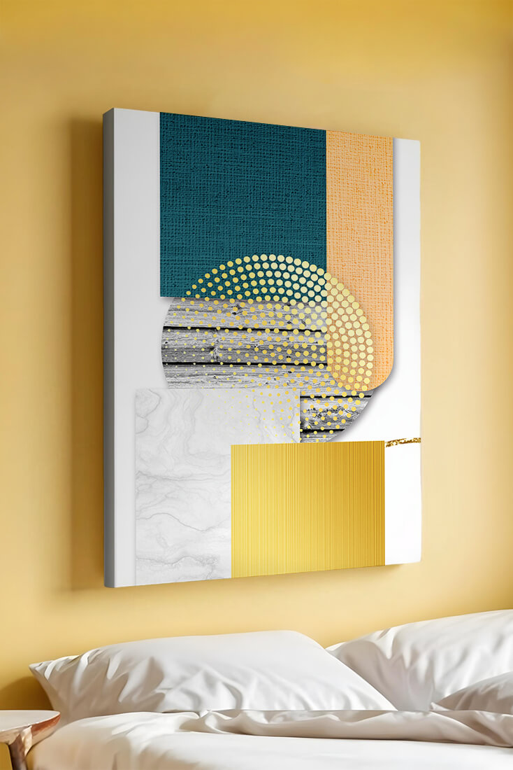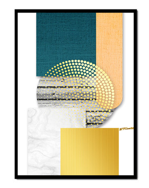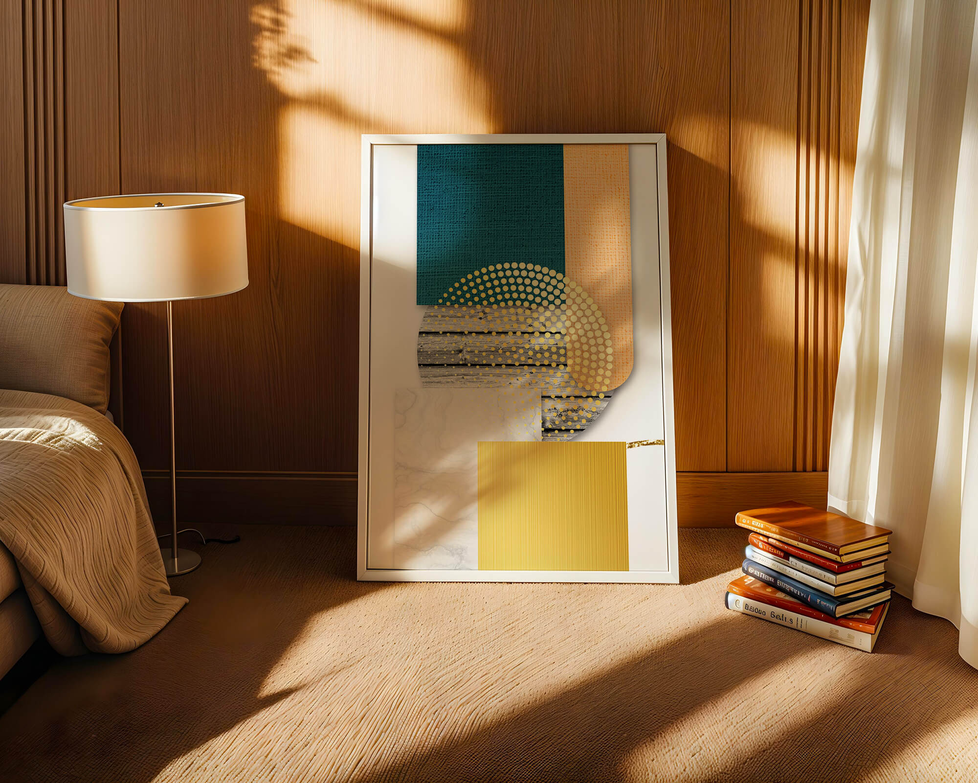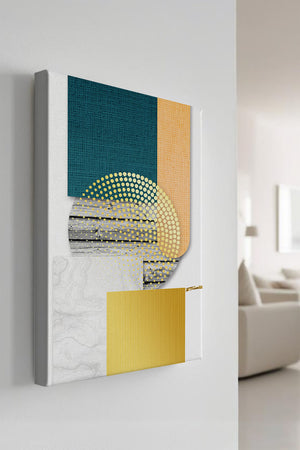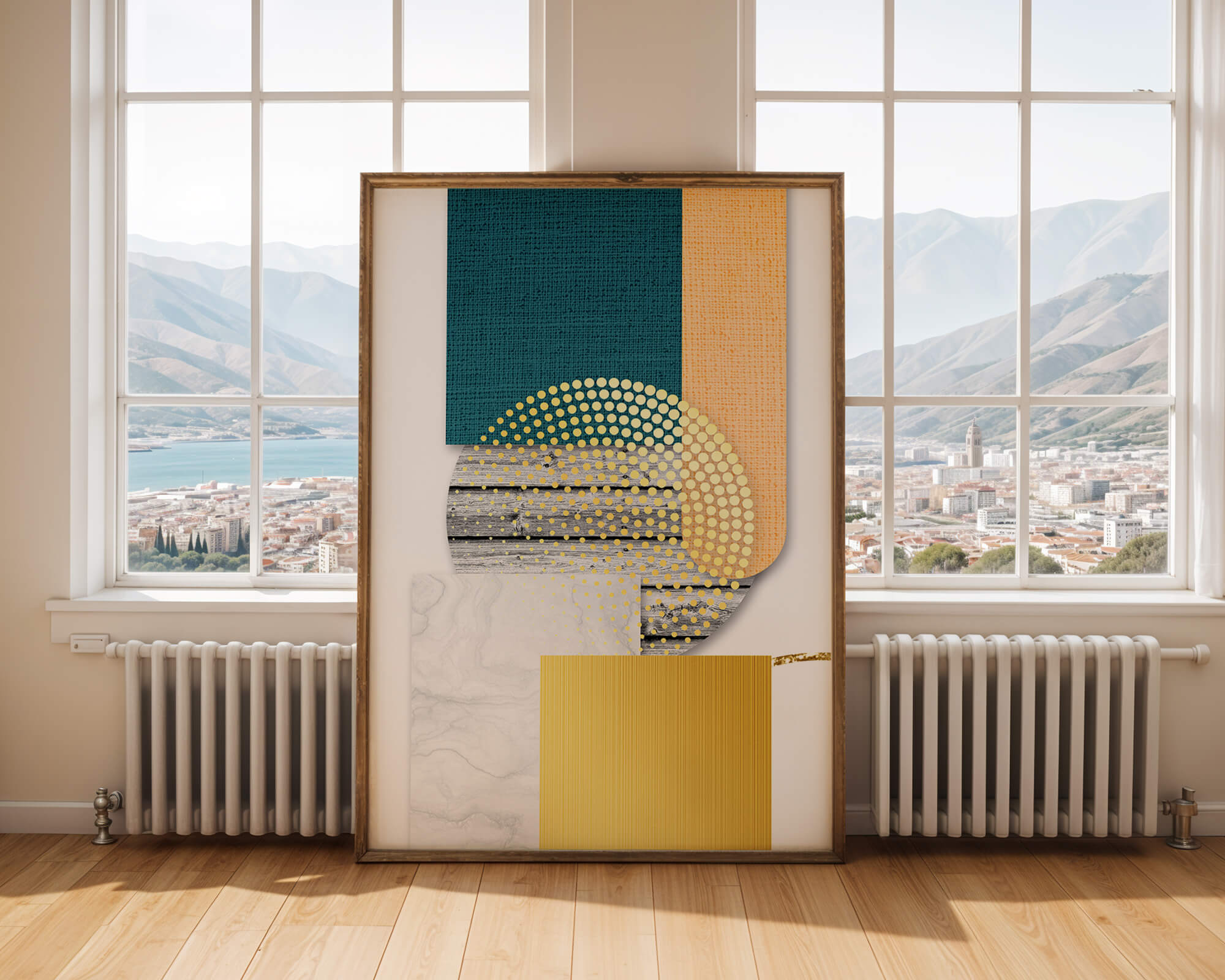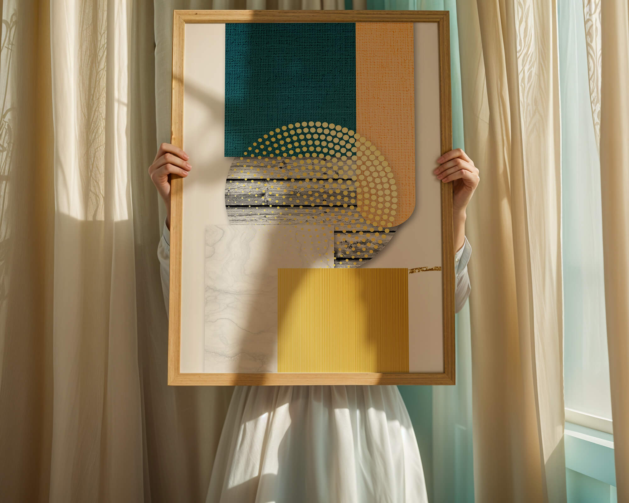 Дизайн демонстрирует сочетание текстур, включая бирюзовый участок, подобный тканому материалу, деревянный элемент с золотыми точками и поверхность, похожую на мрамор, с золотыми оттенками. Эти текстуры создают роскошное ощущение, которое может улучшить любое жилое пространство, добавляя штрих утонченности и элегантности. Смелое использование геометрических форм и взаимодействие цветов делают это изображение идеальным для современных и актуальных интерьеров. Идеально подходит для офиса, гостиной или любого пространства, которое стремится сочетать стиль с художественным вкусом, этот элемент воплощает суть современных дизайнерских тенденций.