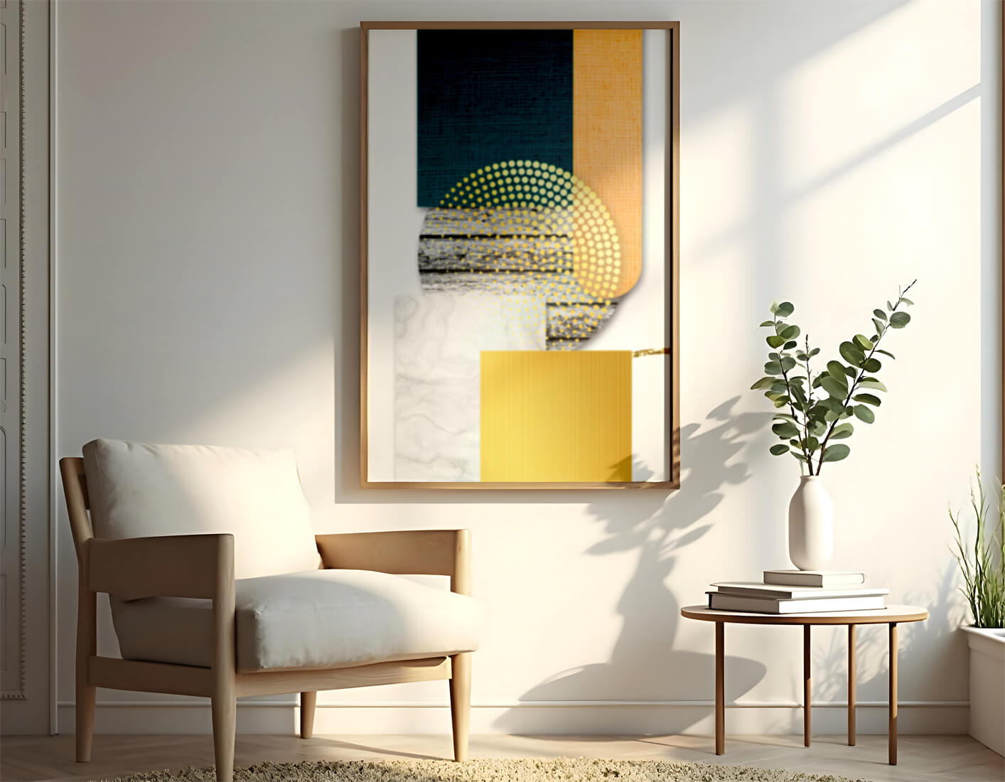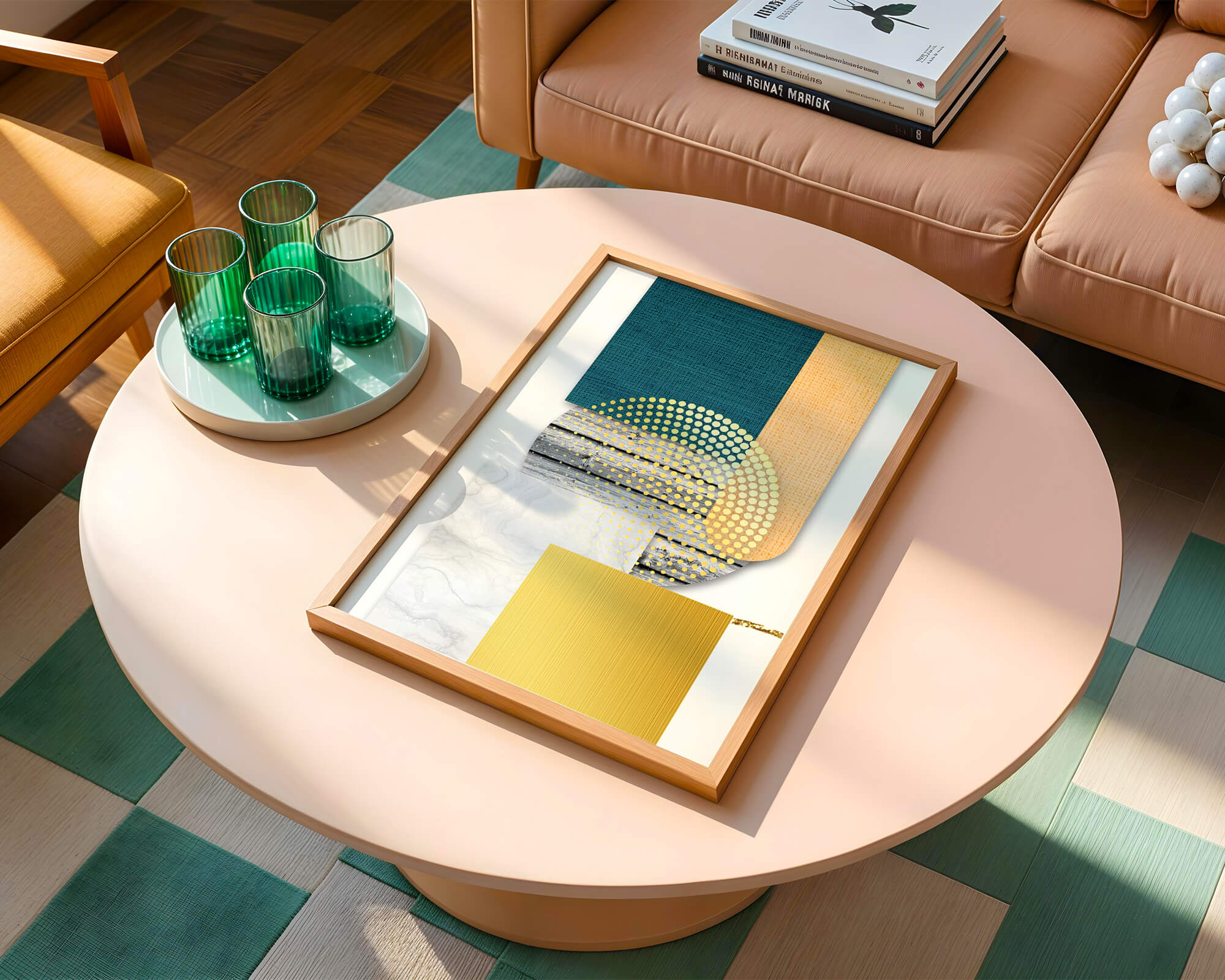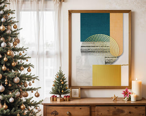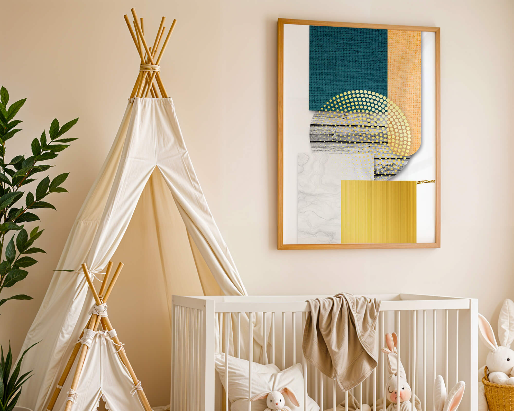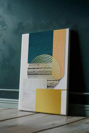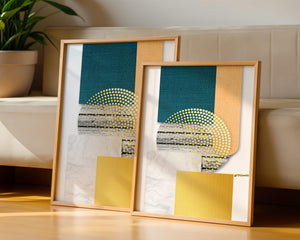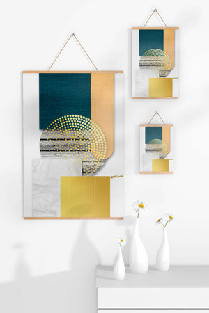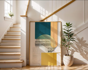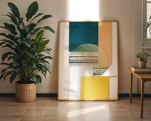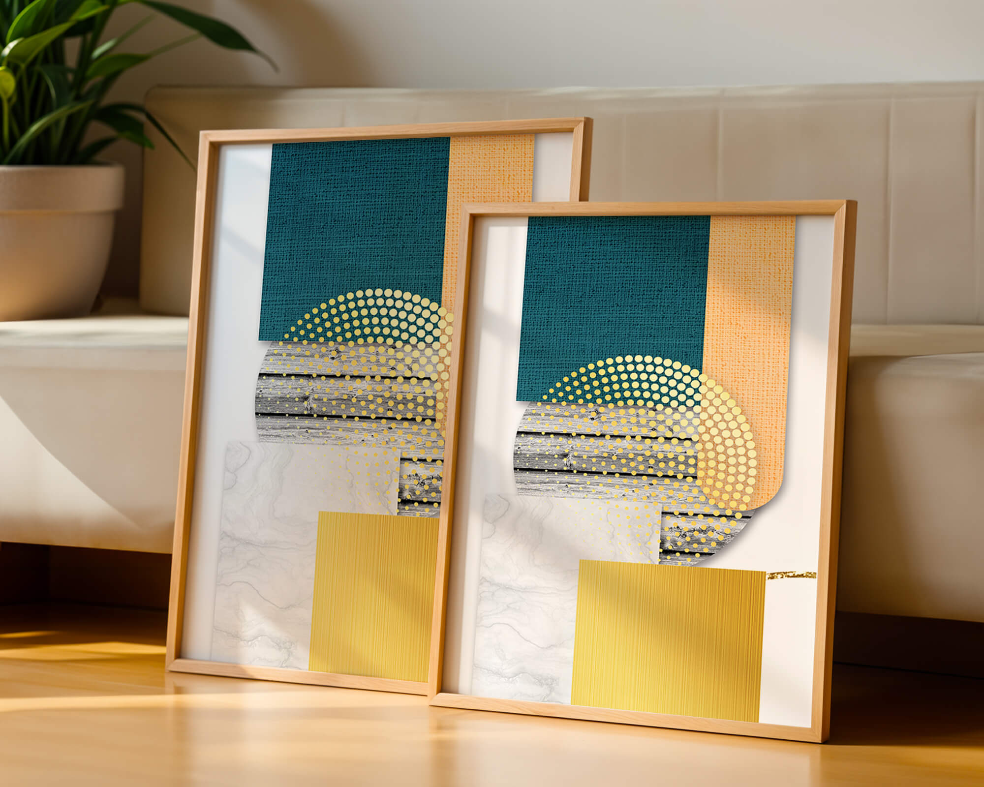 Дизайн демонстрирует сочетание текстур, включая бирюзовый участок, подобный тканому материалу, деревянный элемент с золотыми точками и поверхность, похожую на мрамор, с золотыми оттенками. Эти текстуры создают роскошное ощущение, которое может улучшить любое жилое пространство, добавляя штрих утонченности и элегантности. Смелое использование геометрических форм и взаимодействие цветов делают это изображение идеальным для современных и актуальных интерьеров. Идеально подходит для офиса, гостиной или любого пространства, которое стремится сочетать стиль с художественным вкусом, этот элемент воплощает суть современных дизайнерских тенденций.