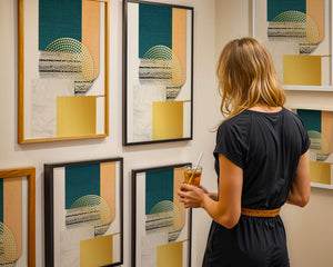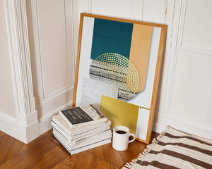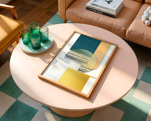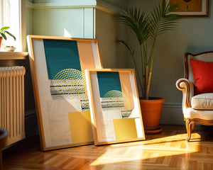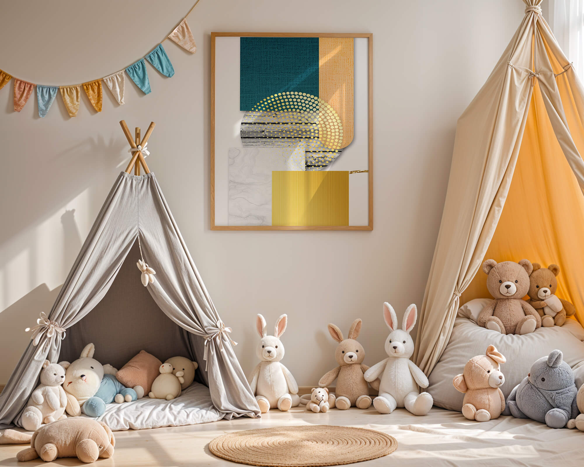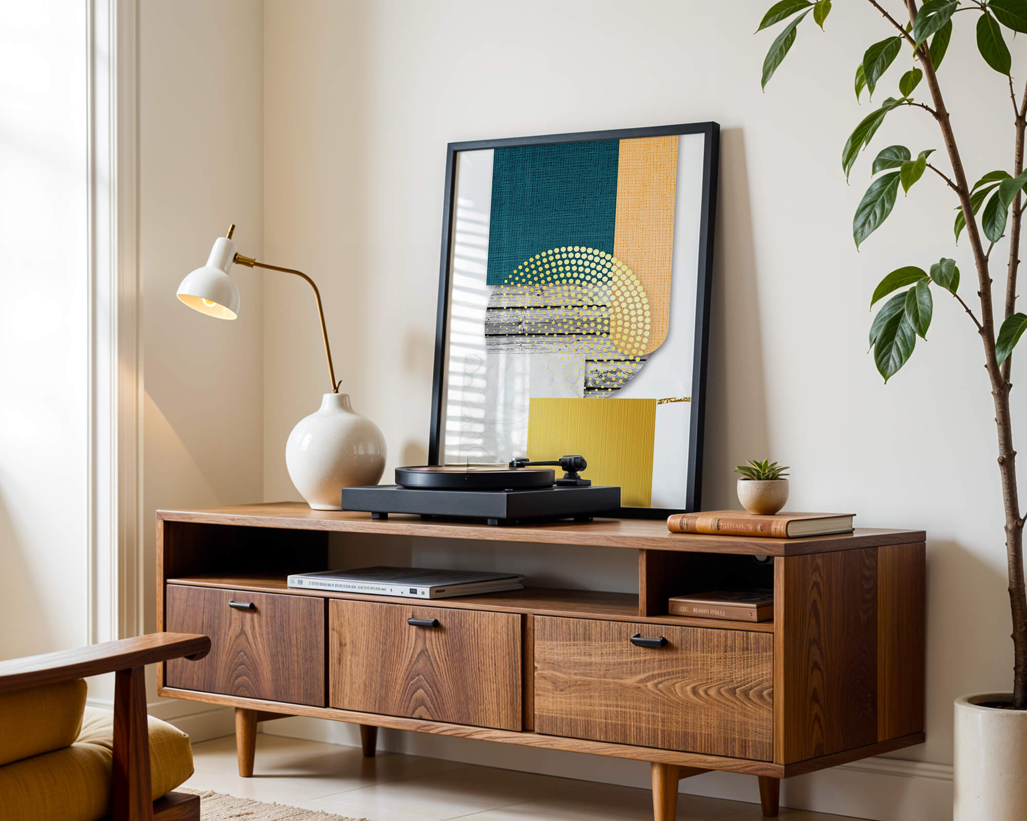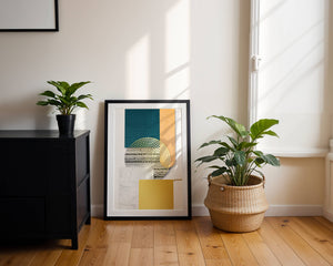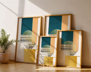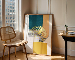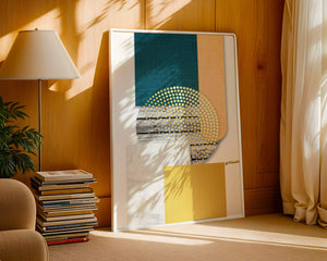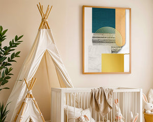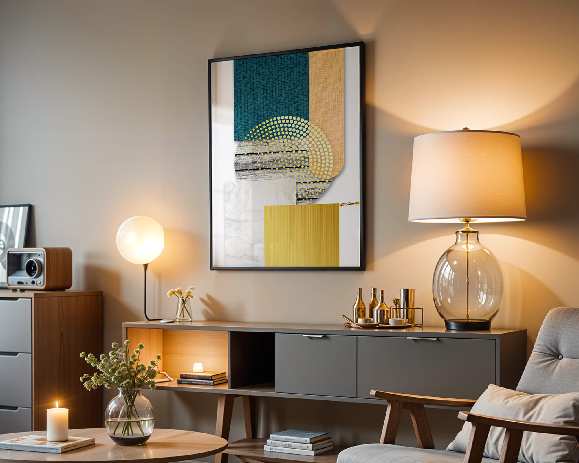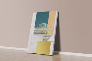 Дизайн демонстрирует сочетание текстур, включая бирюзовый участок, подобный тканому материалу, деревянный элемент с золотыми точками и поверхность, похожую на мрамор, с золотыми оттенками. Эти текстуры создают роскошное ощущение, которое может улучшить любое жилое пространство, добавляя штрих утонченности и элегантности. Смелое использование геометрических форм и взаимодействие цветов делают это изображение идеальным для современных и актуальных интерьеров. Идеально подходит для офиса, гостиной или любого пространства, которое стремится сочетать стиль с художественным вкусом, этот элемент воплощает суть современных дизайнерских тенденций.