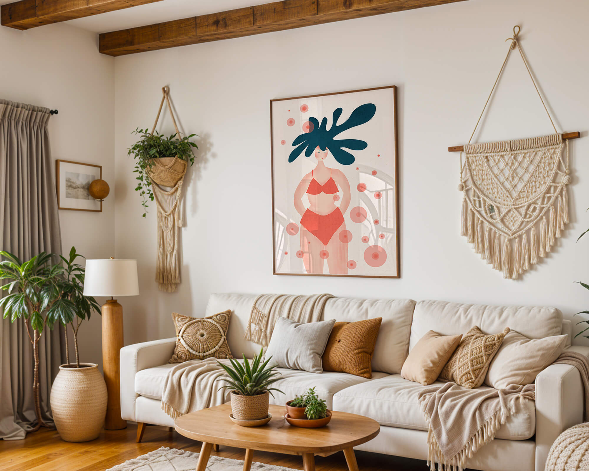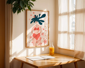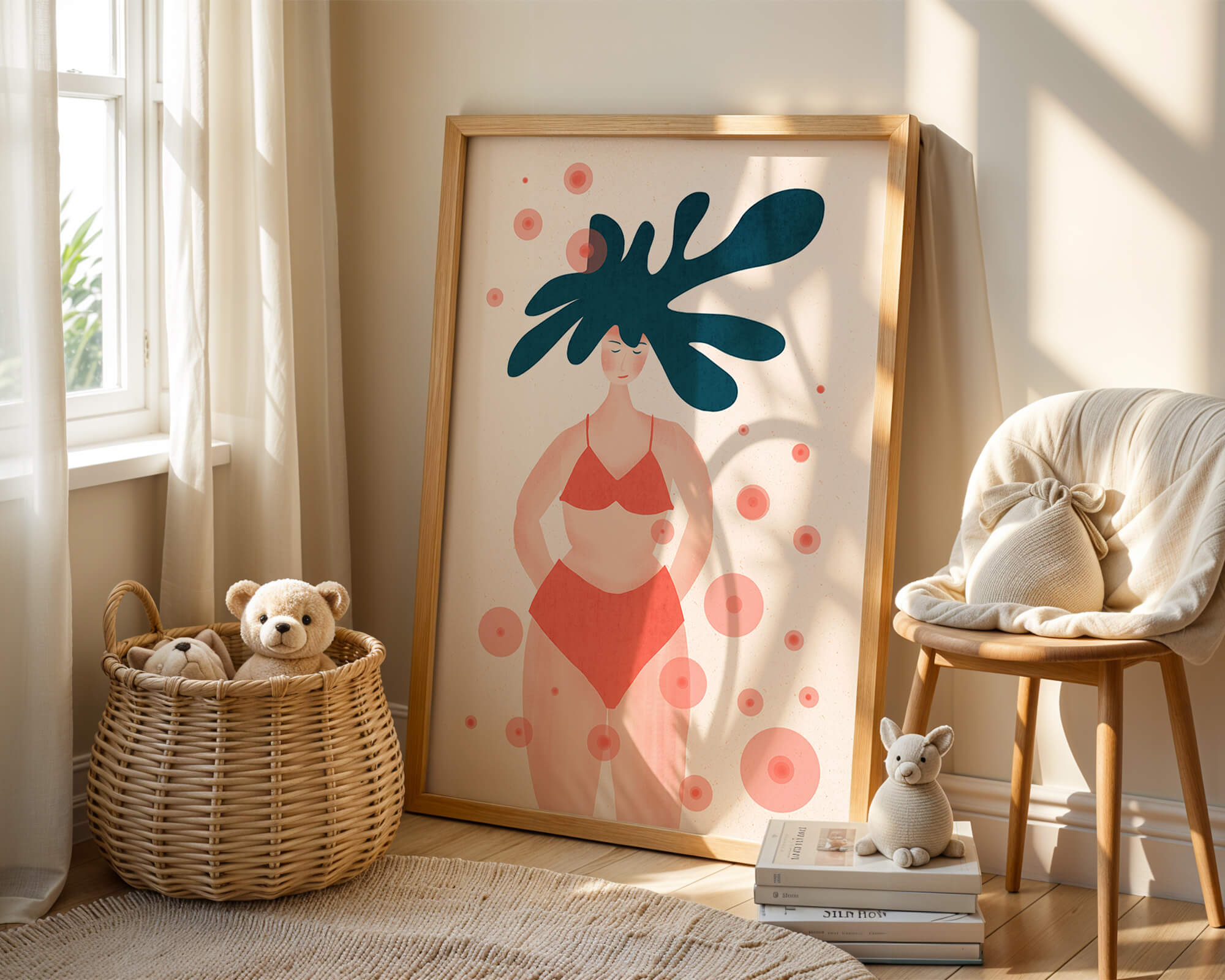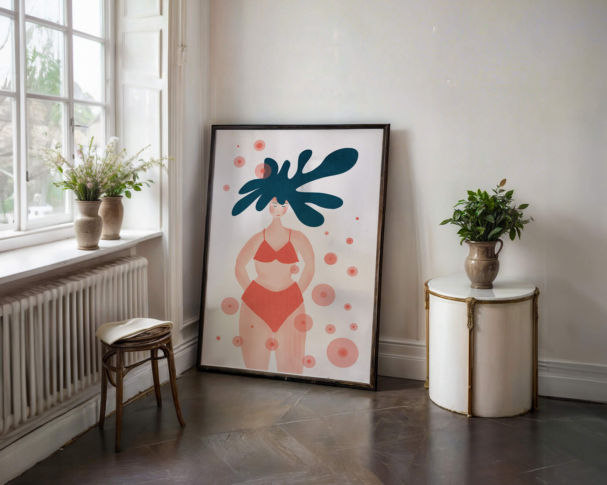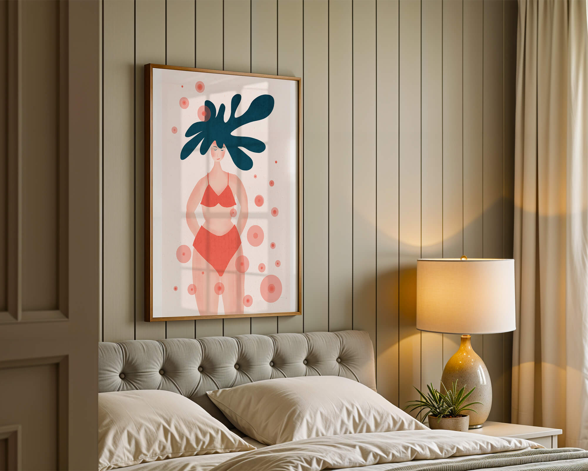 Это произведение является поразительным представлением современного абстрактного искусства, объединяя элементы моды и креативности. Женщина, изображенная на картине, носит простой, но яркий купальник, привлекающий внимание своим насыщенным красным цветом. Её поза излучает уверенность и изящество, стоя среди различных круговых узоров, которые добавляют глубину композиции. Наиболее привлекательной особенностью иллюстрации являются волосы женщины, оформленные в воображаемую и сюрреалистическую форму. Волосы не только обрамляют её лицо, но и становятся центральным художественным элементом, захватывающим воображение зрителя. Это произведение успешно сочетает элементы минимализма с яркими цветами, создавая визуально впечатляющий образ, который отражает темы красоты, современности и индивидуальности.| Тип |