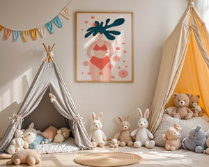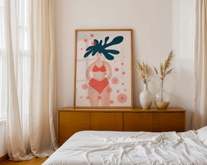 Захватывающая абстрактная иллюстрация, изображающая женщину в красном купальнике, отличающуюся уникальным и креативным дизайном прически, добавляющим художественный шарм композиции.
