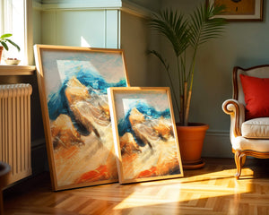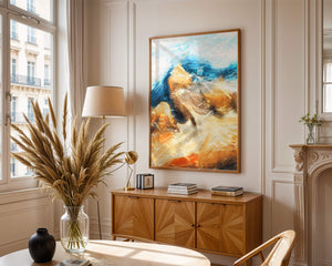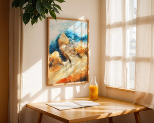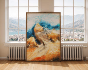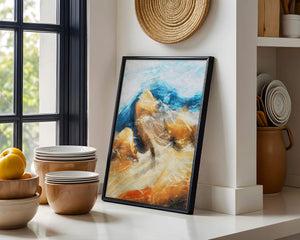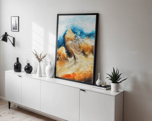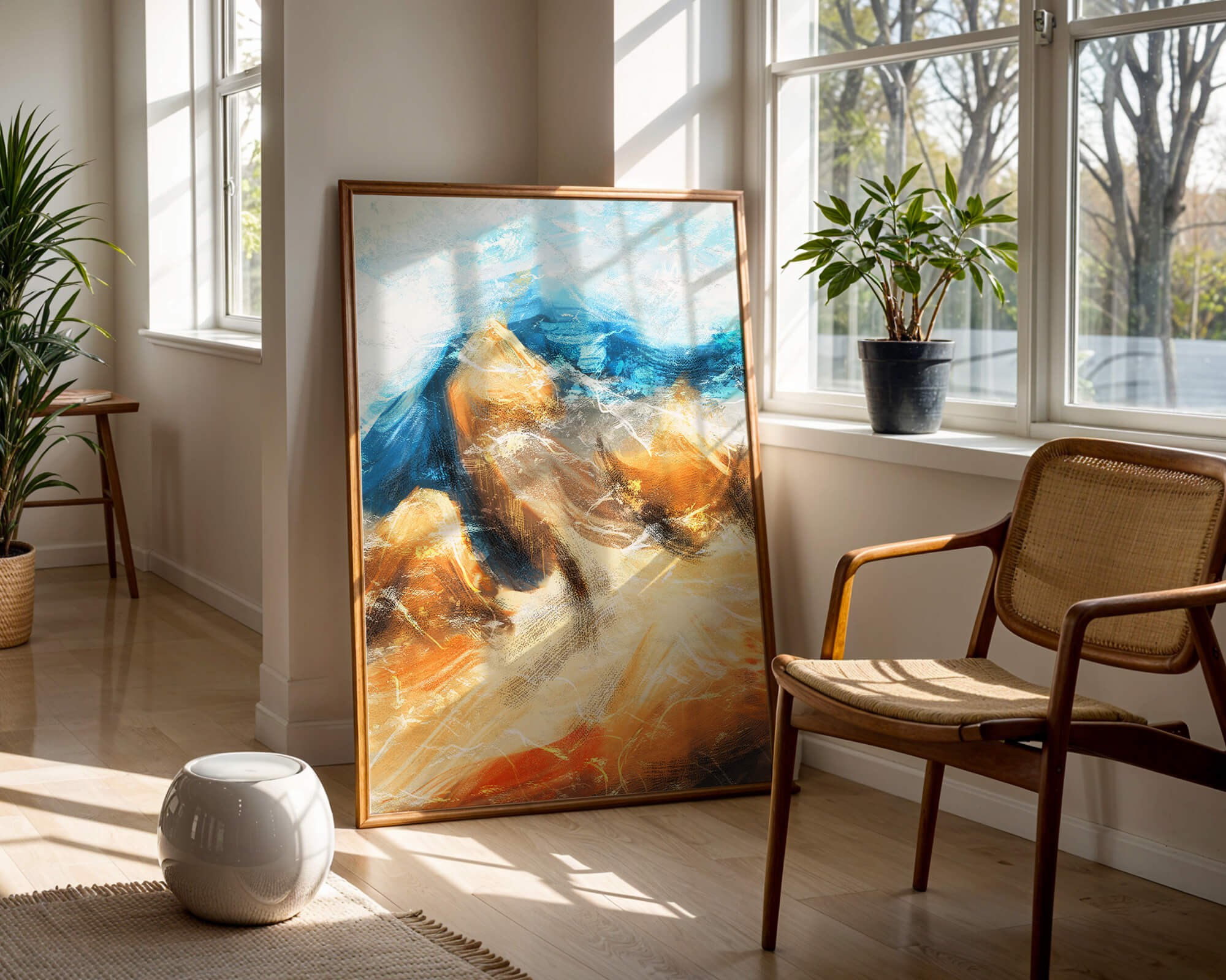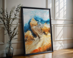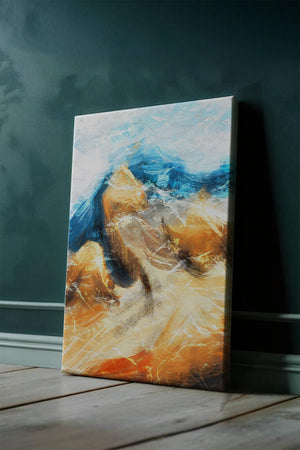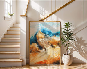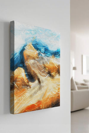 Эта абстрактная картина представляет собой захватывающую смесь синих и золотых оттенков, напоминающую пейзаж. Изображение вызывает чувство движения и плавности благодаря своим динамичным мазкам и элегантной композиции.