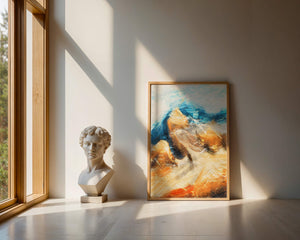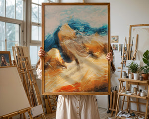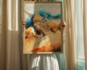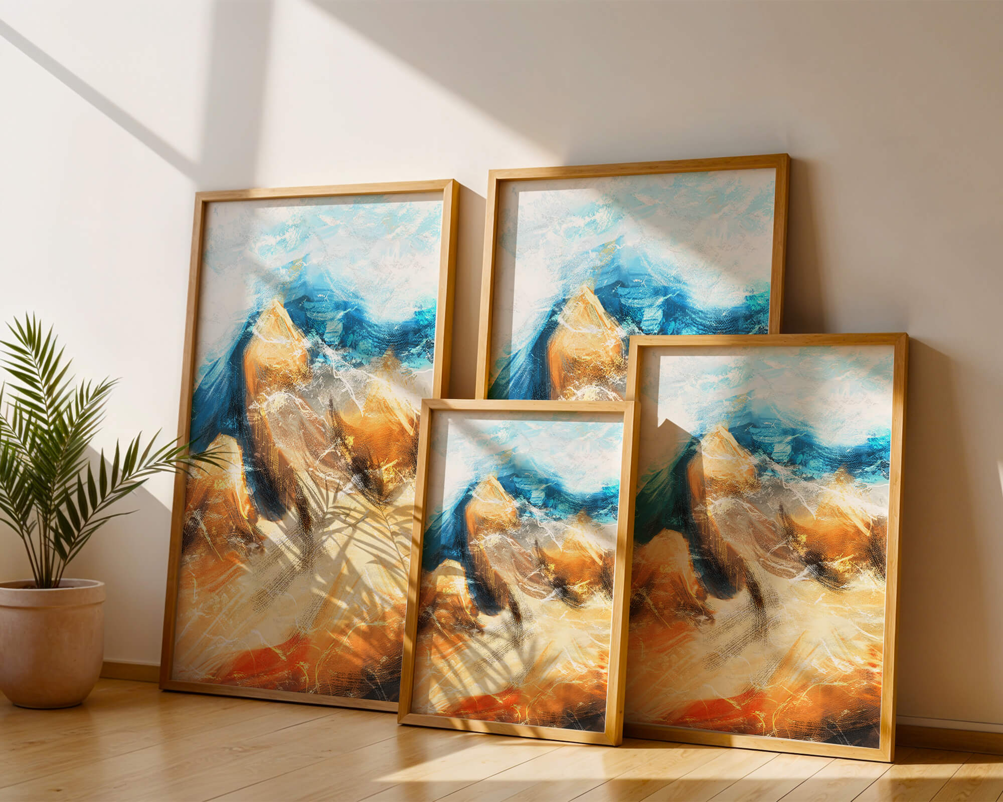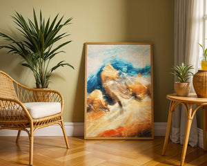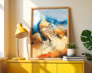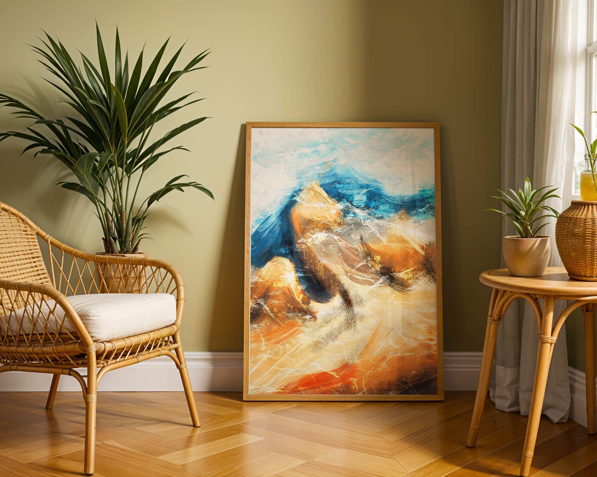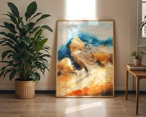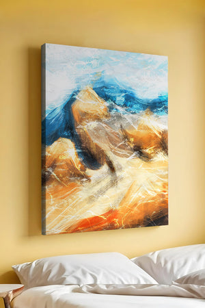Картина привлекает зрителя своей яркой цветовой палитрой, где глубокие синие цвета контрастируют с теплыми золотыми и песчаными земляными тонами. Этот контраст создает ощущение глубины и пространства, будто смотрите на морской пейзаж в яркий солнечный день. Текстура добавляет выразительность, усиливая современную эстетику произведения искусства. Идеально подходит для современного жилого или офисного пространства, это произведение искусства привносит нотку элегантности и намек на природу в интерьер. Динамичная композиция и плавность мазков передают чувство энергии и жизни, делая его привлекательным произведением для любого любителя искусства или энтузиаста интерьерного дизайна.| Тип |