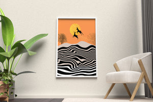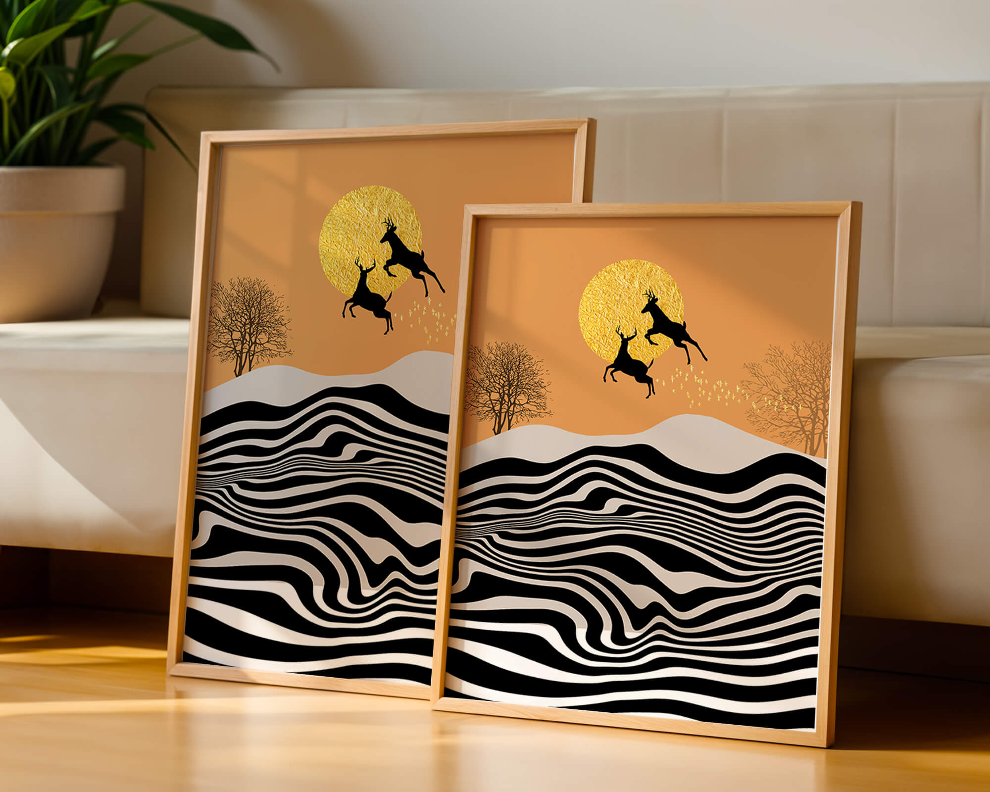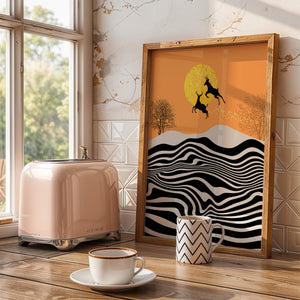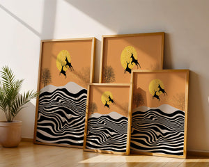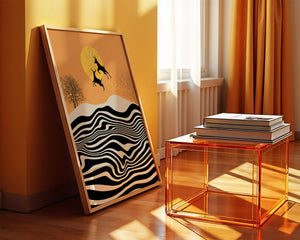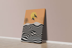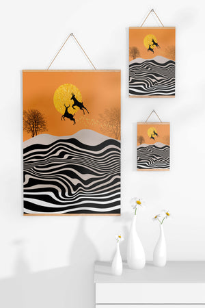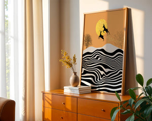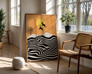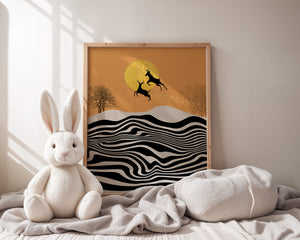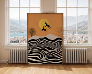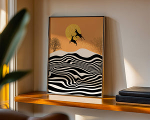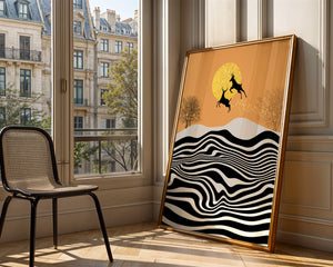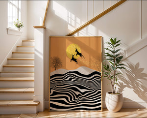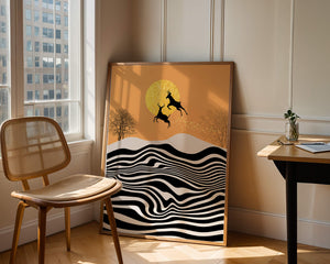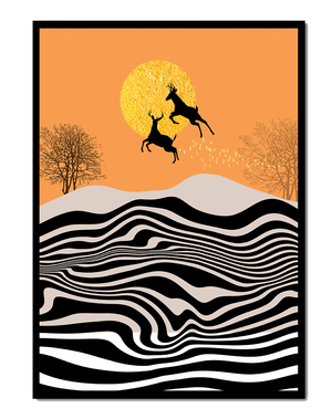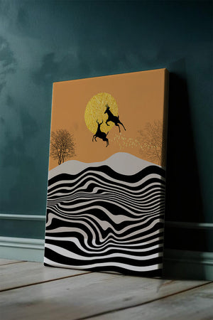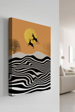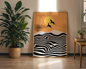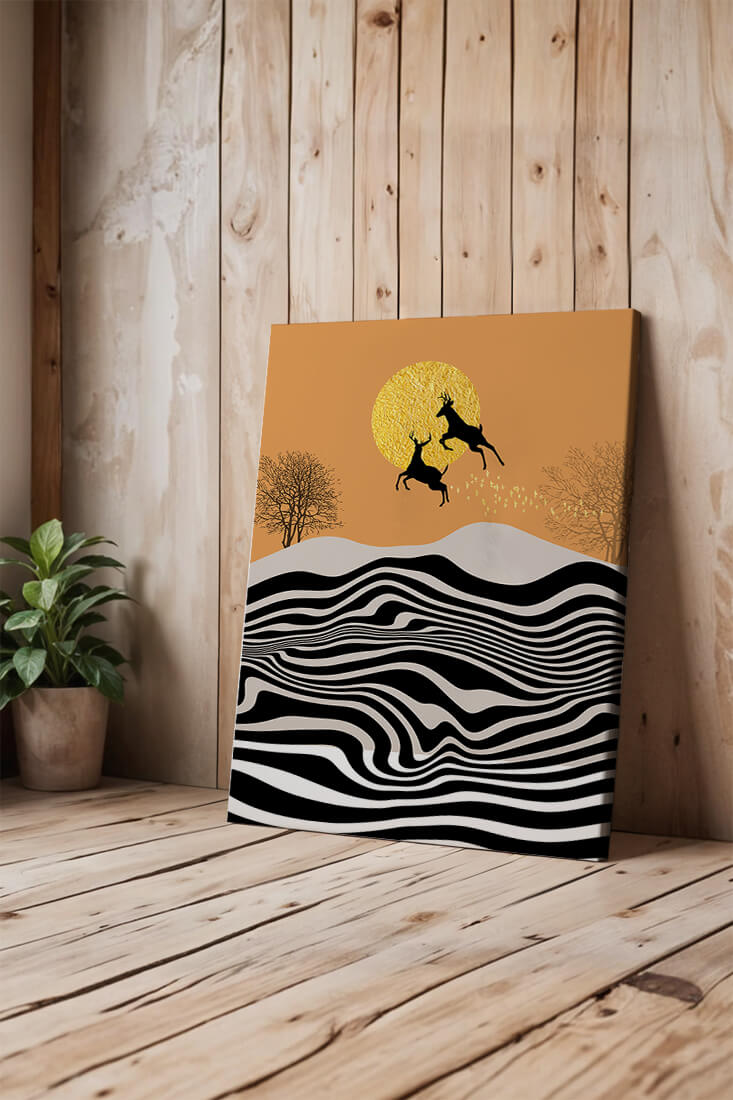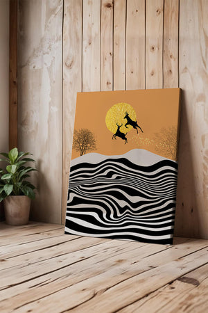 Это завораживающее изображение представляет абстрактный пейзаж, где два оленя грациозно прыгают на фоне золотого солнца. Сцена выполнена в современном стиле с сильным контрастом, включает черно-белые волнообразные узоры и силуэты оленей в прыжке.## Уникальное сочетание природы и современного искусства. Смелые волнистые полосы на переднем плане создают эффект динамичного движения, привлекая взгляд по всему пейзажу. Эти плавные узоры контрастируют с плотными черными силуэтами оленей, подчёркивая их живые очертания, когда они парят через насыщенную атмосферу. Золотое солнце не только служит ярким центром композиции, но и придаёт произведению ощущение тепла и роскоши. По бокам сцены — строгие, голые деревья, что добавляет штрих реализма в эту в остальном минималистичную интерпретацию природы. Сочетание современного дизайна с природными элементами делает это произведение идеальным выбором для тех, кто хочет добавить в своё жилое пространство нотку изысканности и элегантности. Будь то в гостиной, спальне или детской комнате