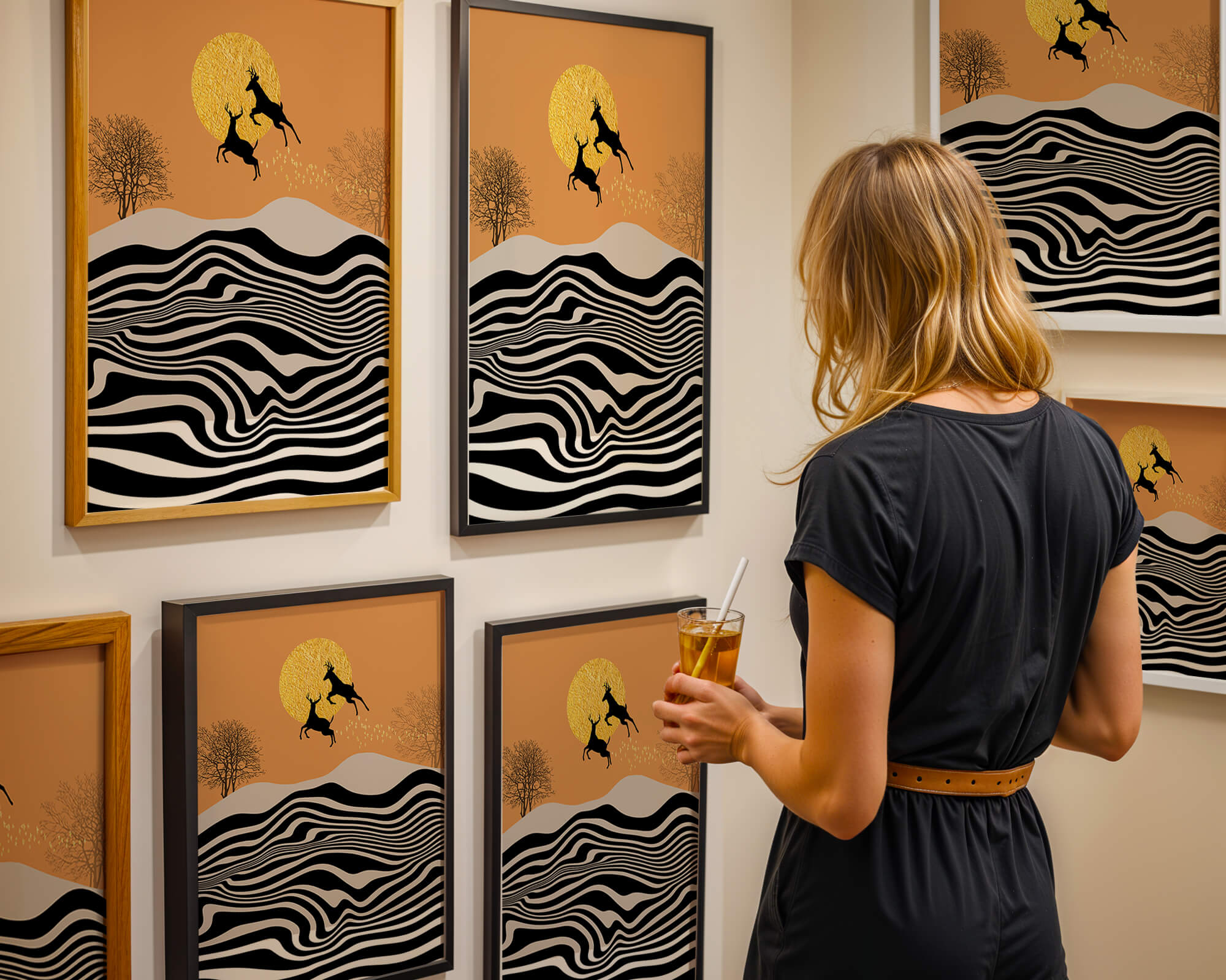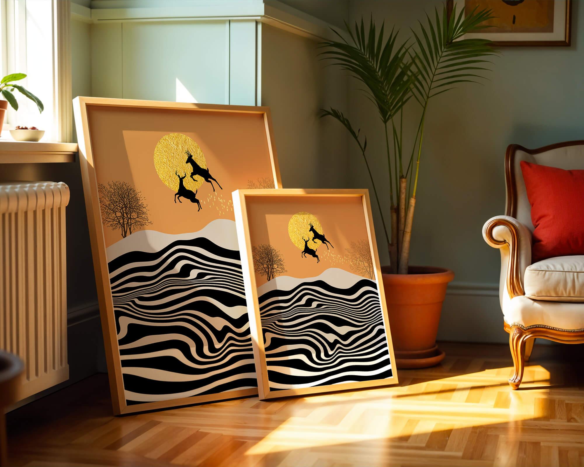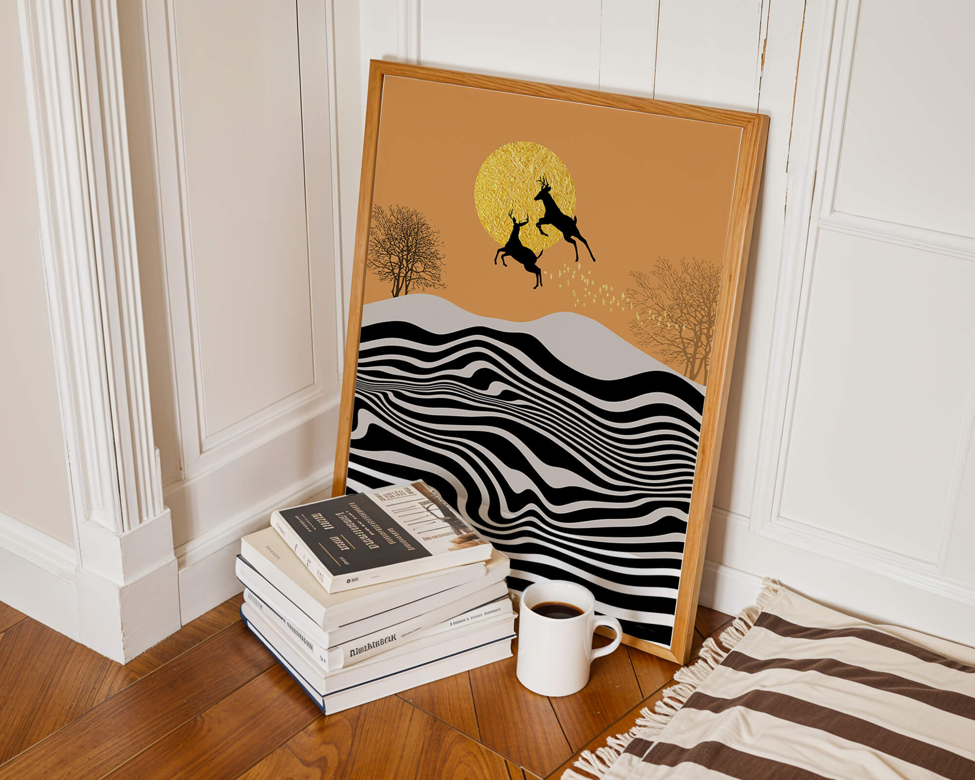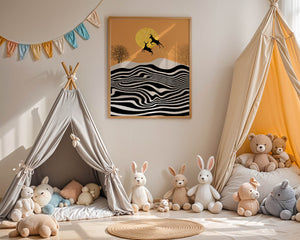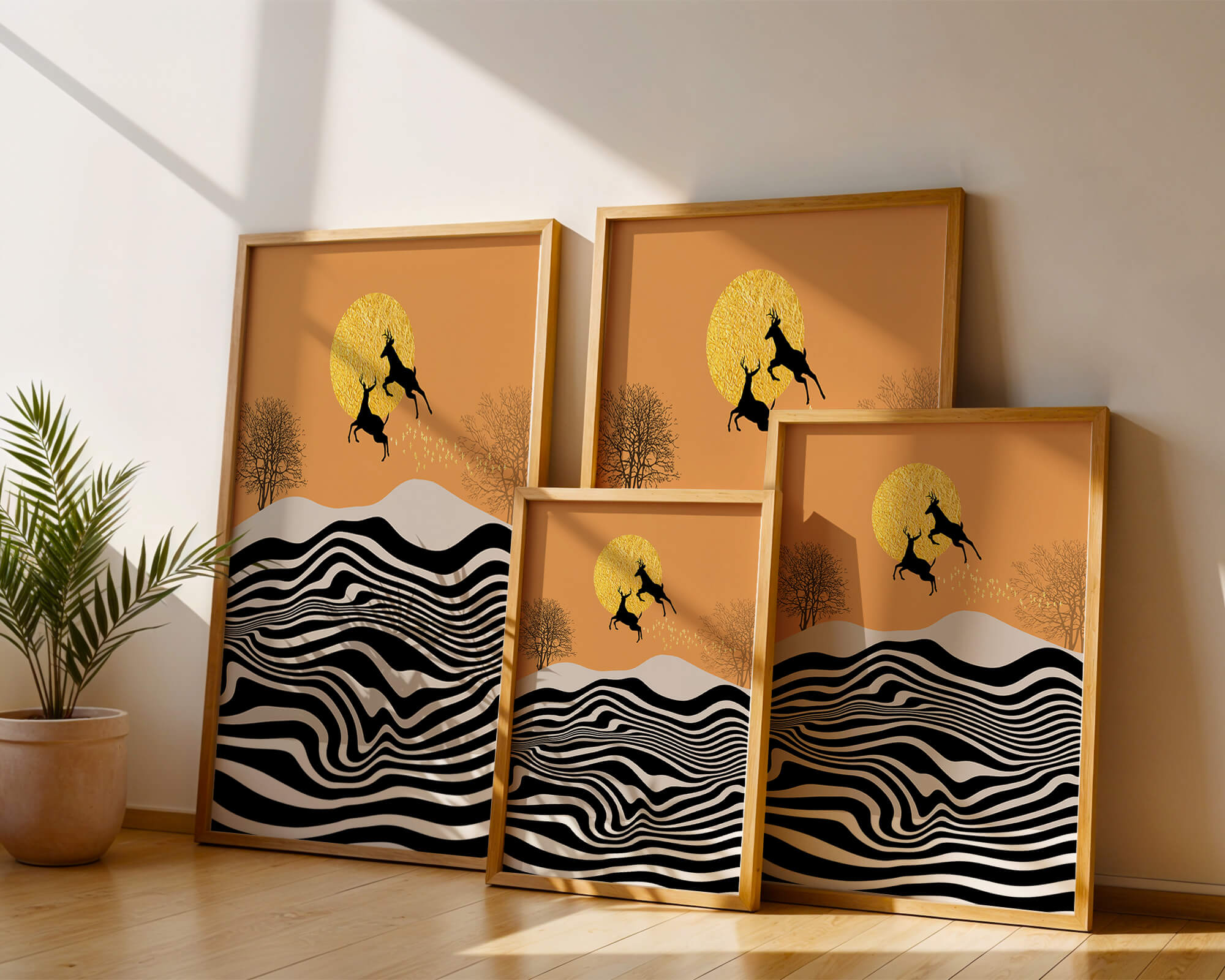 Это завораживающее изображение представляет абстрактный пейзаж, где два оленя грациозно прыгают на фоне золотого солнца. Сцена выполнена в современном стиле с сильным контрастом, включает черно-белые волнообразные узоры и силуэты оленей в прыжке.## Уникальное сочетание природы и современного искусства. Смелые волнистые полосы на переднем плане создают эффект динамичного движения, привлекая взгляд по всему пейзажу. Эти плавные узоры контрастируют с плотными черными силуэтами оленей, подчёркивая их живые очертания, когда они парят через насыщенную атмосферу. Золотое солнце не только служит ярким центром композиции, но и придаёт произведению ощущение тепла и роскоши. По бокам сцены — строгие, голые деревья, что добавляет штрих реализма в эту в остальном минималистичную интерпретацию природы. Сочетание современного дизайна с природными элементами делает это произведение идеальным выбором для тех, кто хочет добавить в своё жилое пространство нотку изысканности и элегантности. Будь то в гостиной, спальне или детской комнате