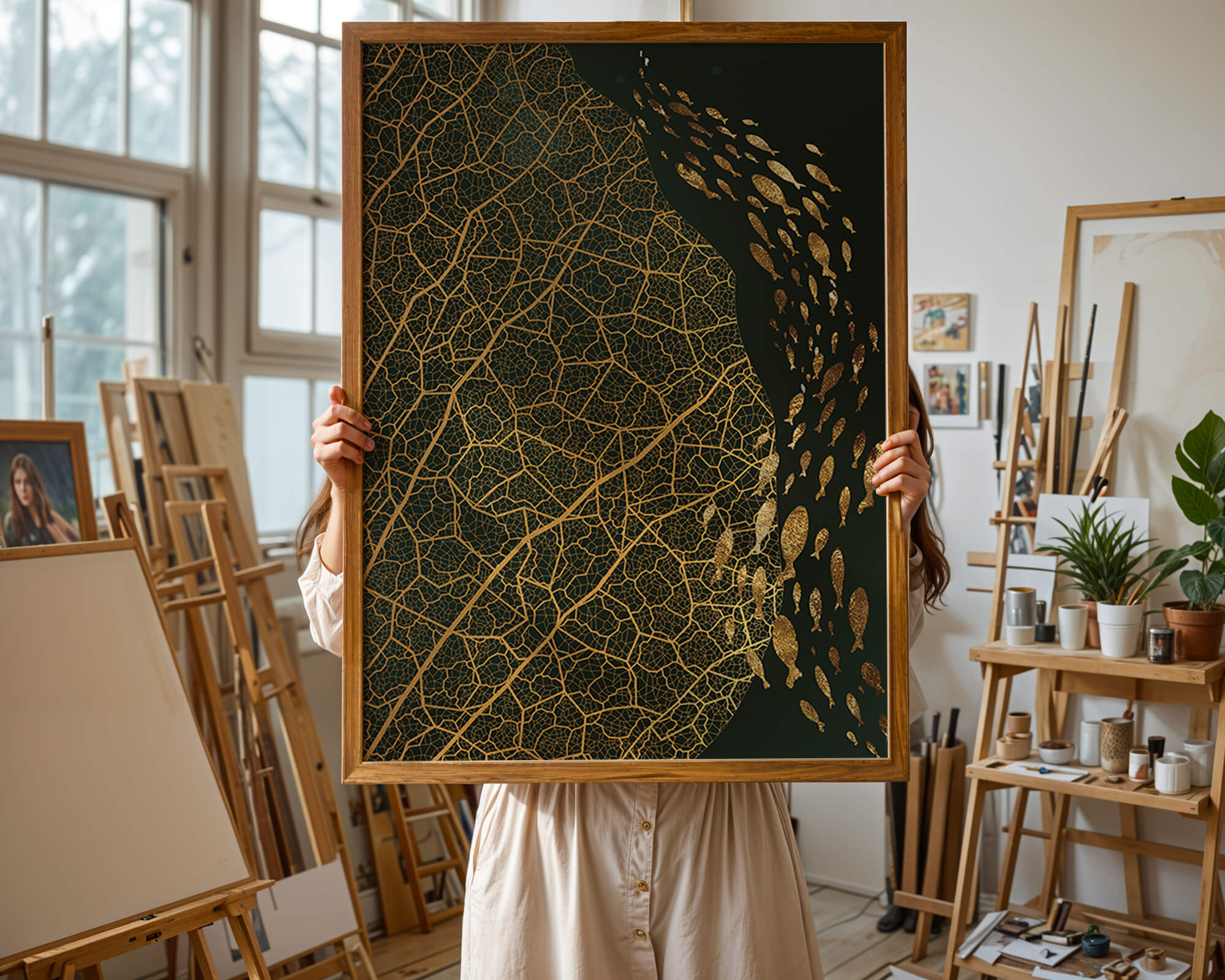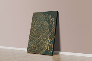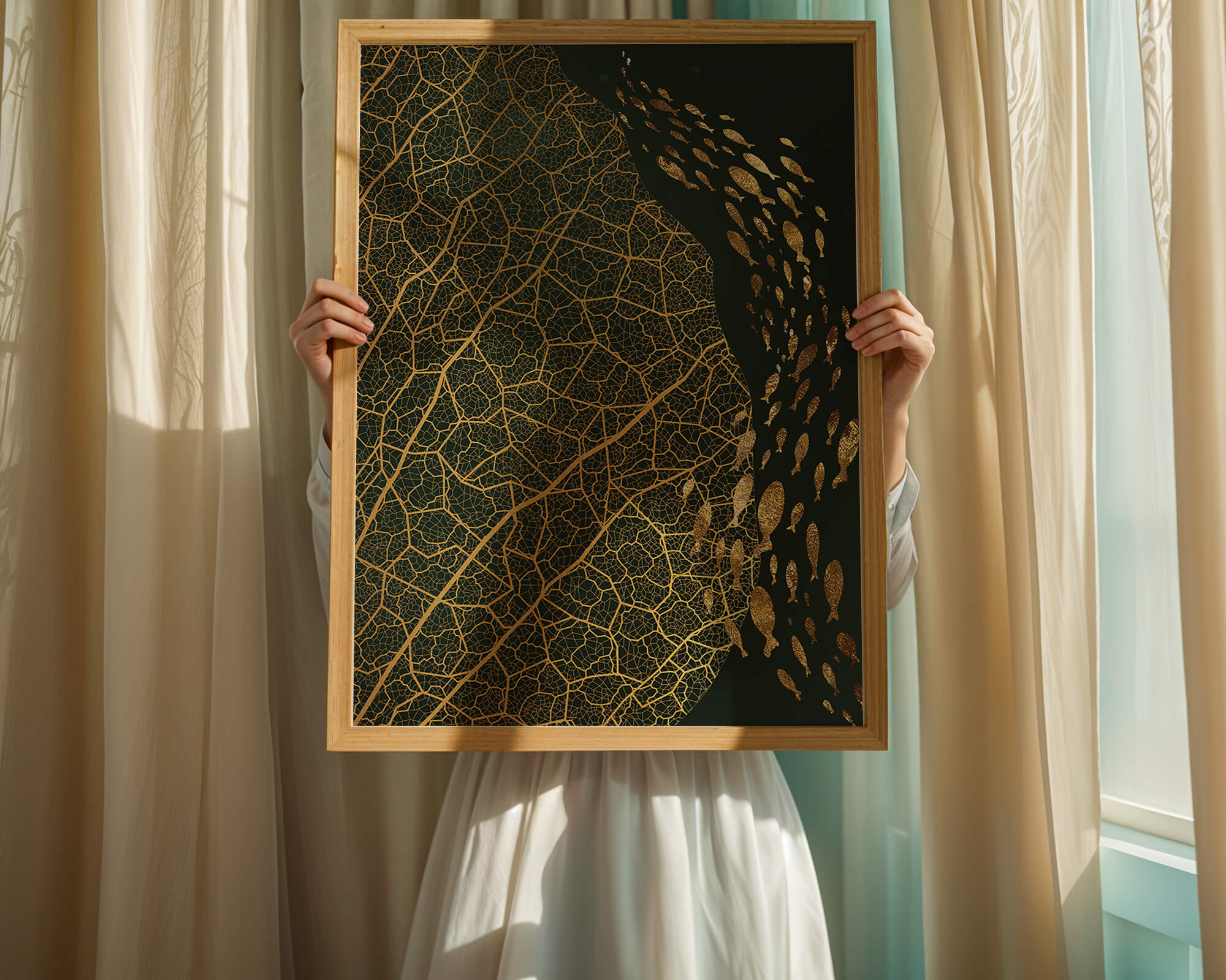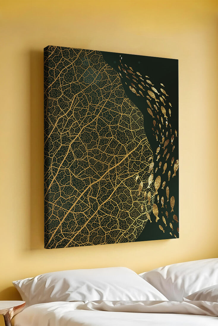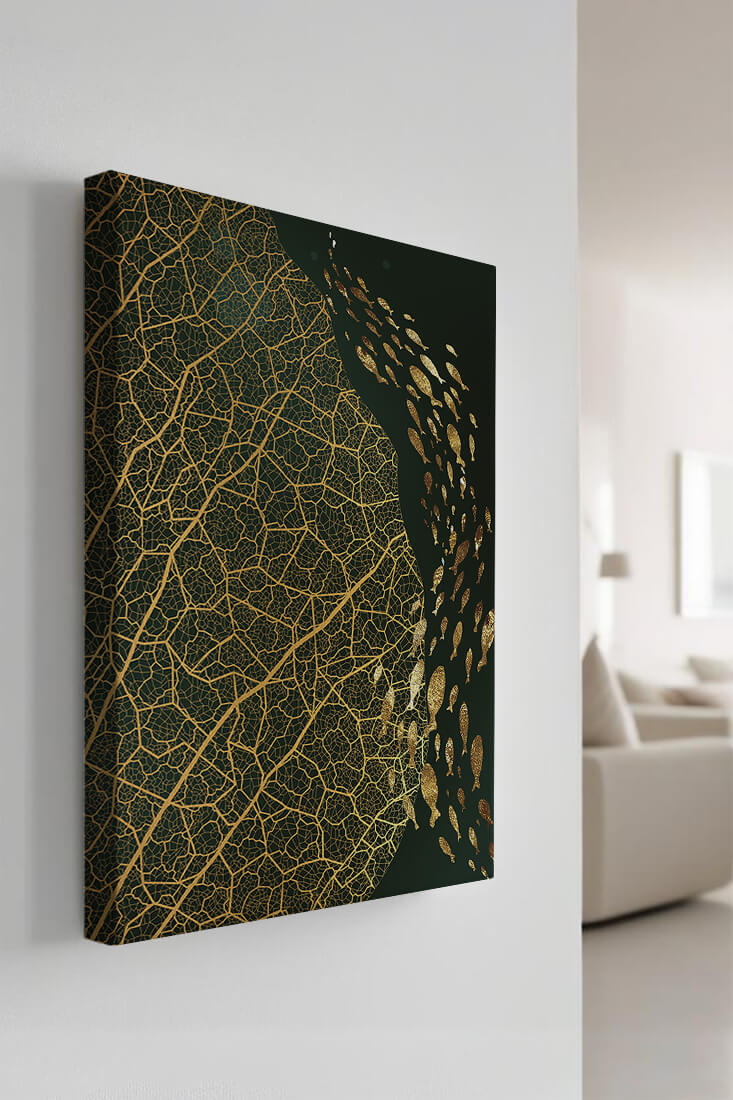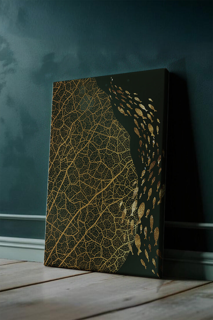 Это произведение искусства представляет собой захватывающее сочетание природных и абстрактных элементов. Дизайн переплетает замысловатые узоры листьев с тонкими силуэтами рыб, плавающих по холсту, создавая гармоничное сочетание природы и художественности.