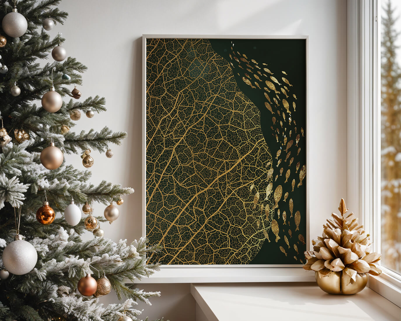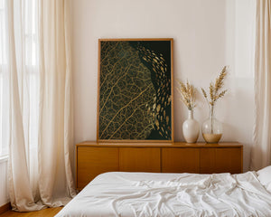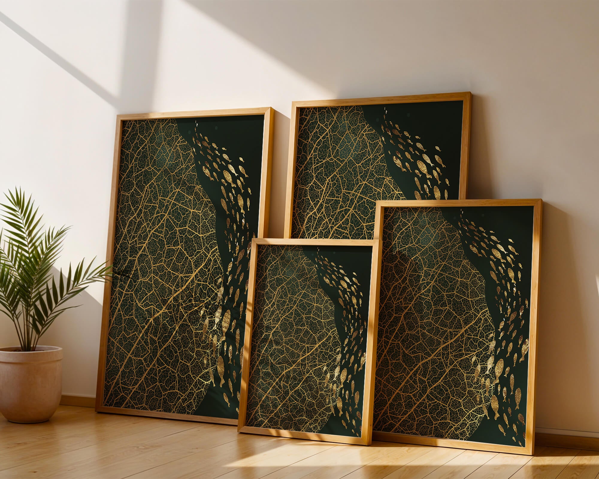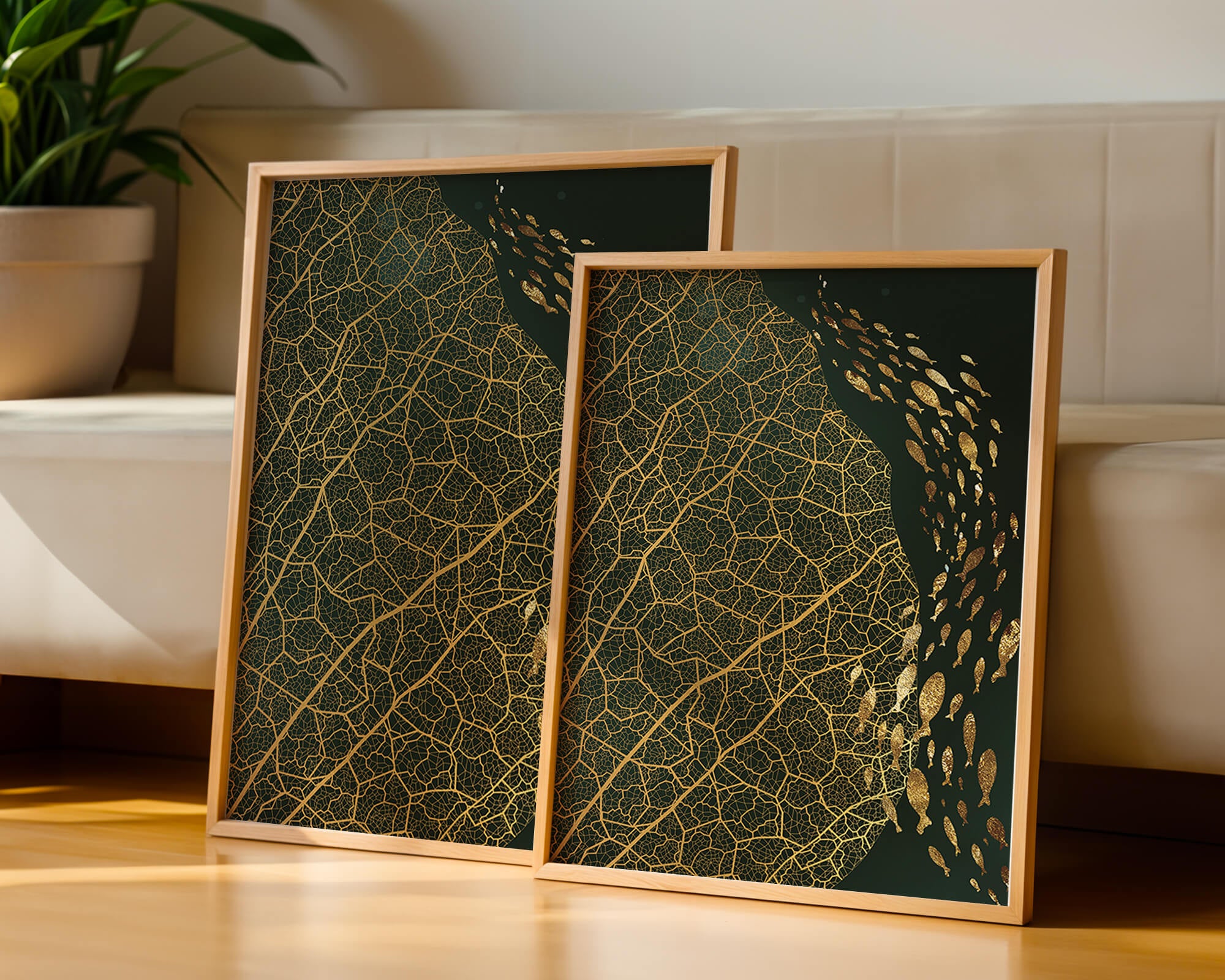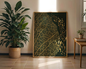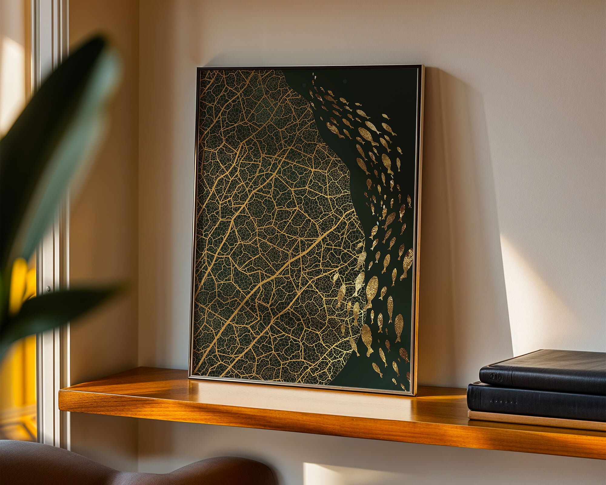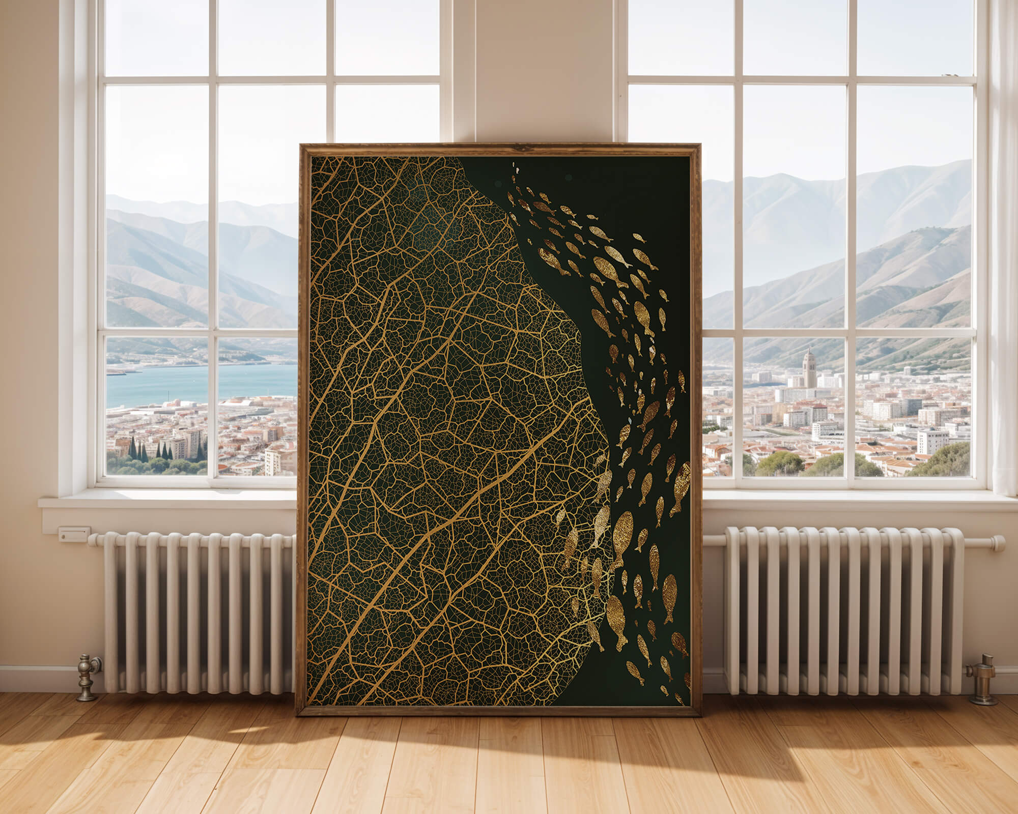 Это произведение искусства представляет собой захватывающее сочетание природных и абстрактных элементов. Дизайн переплетает замысловатые узоры листьев с тонкими силуэтами рыб, плавающих по холсту, создавая гармоничное сочетание природы и художественности.