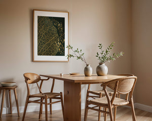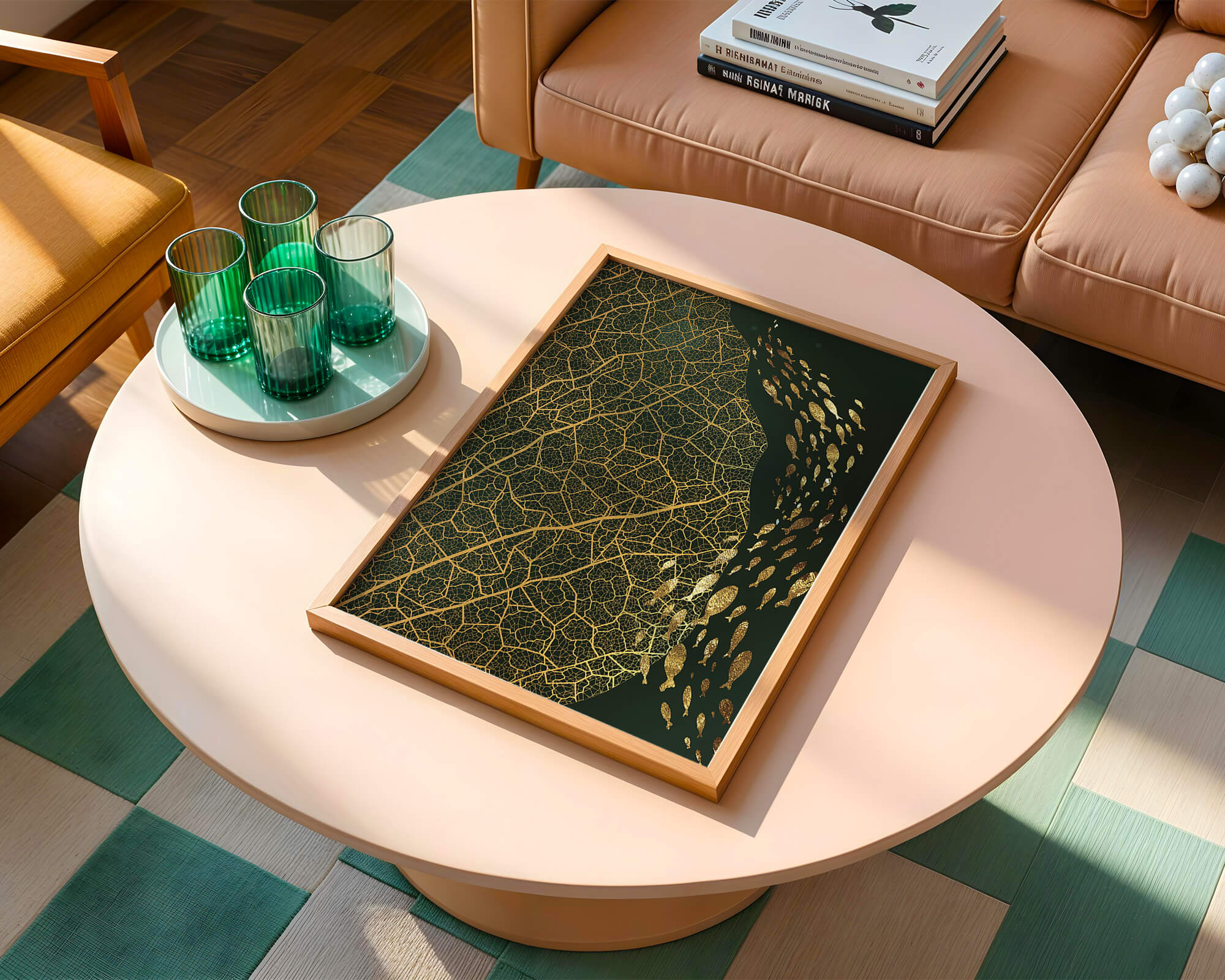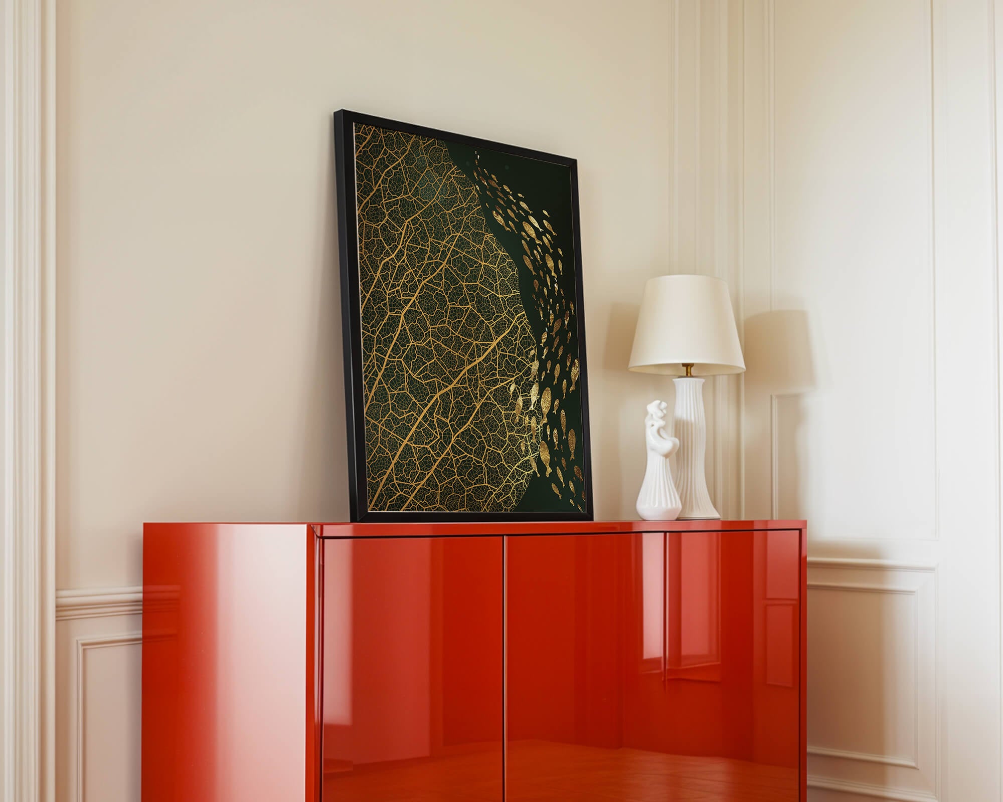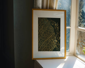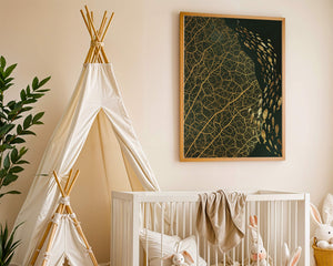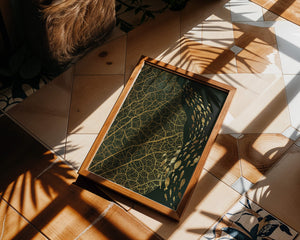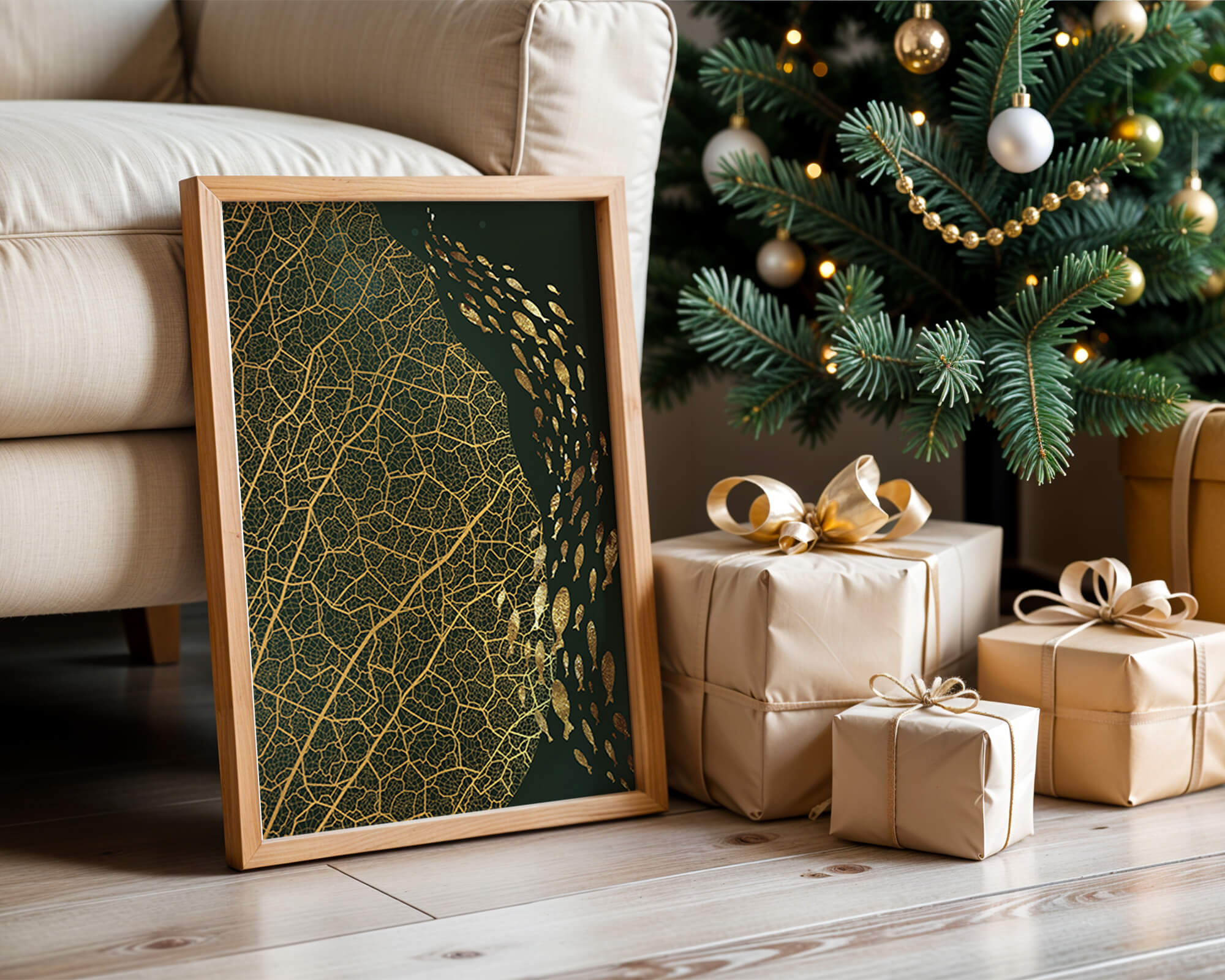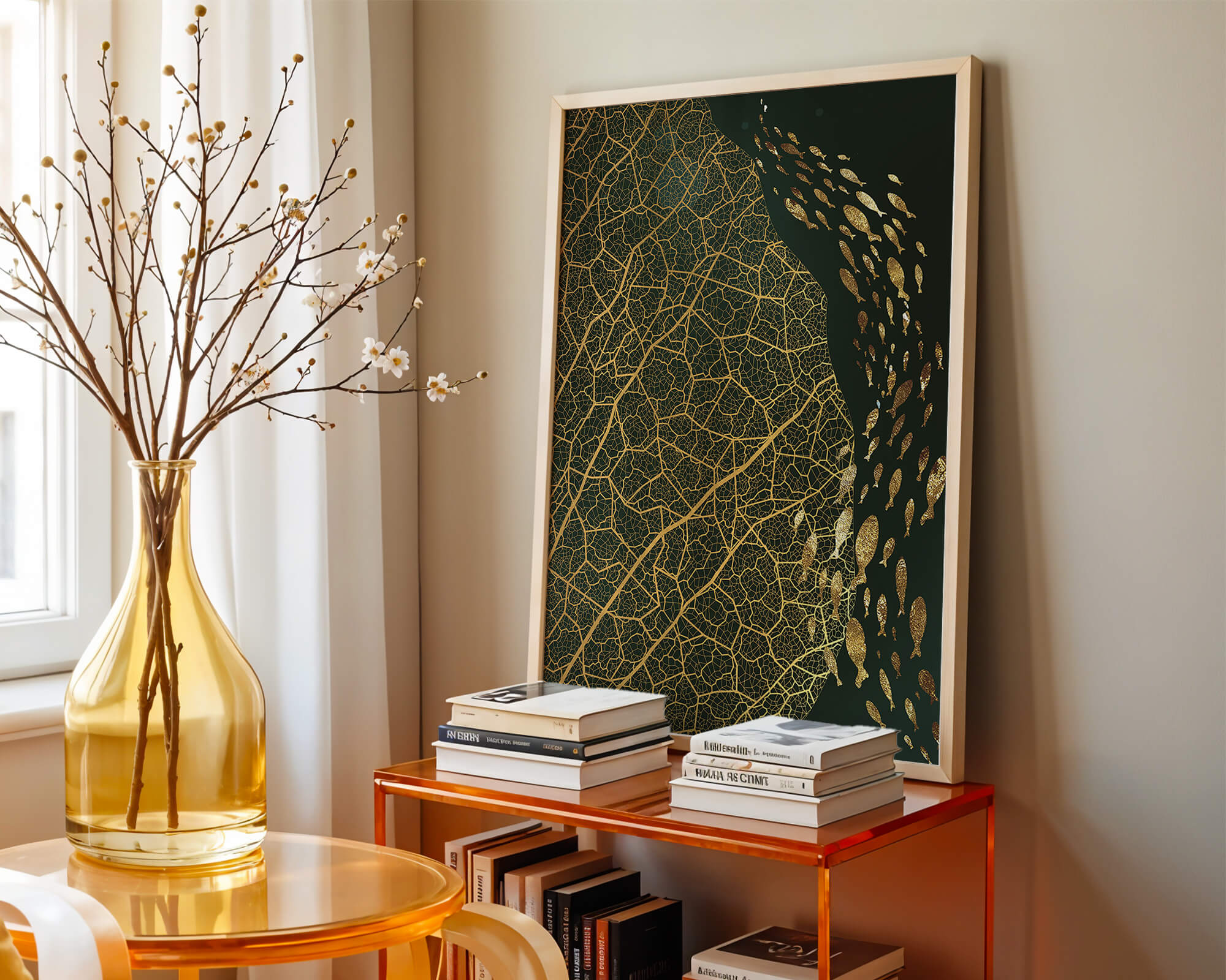 Это произведение искусства представляет собой захватывающее сочетание природных и абстрактных элементов. Дизайн переплетает замысловатые узоры листьев с тонкими силуэтами рыб, плавающих по холсту, создавая гармоничное сочетание природы и художественности.