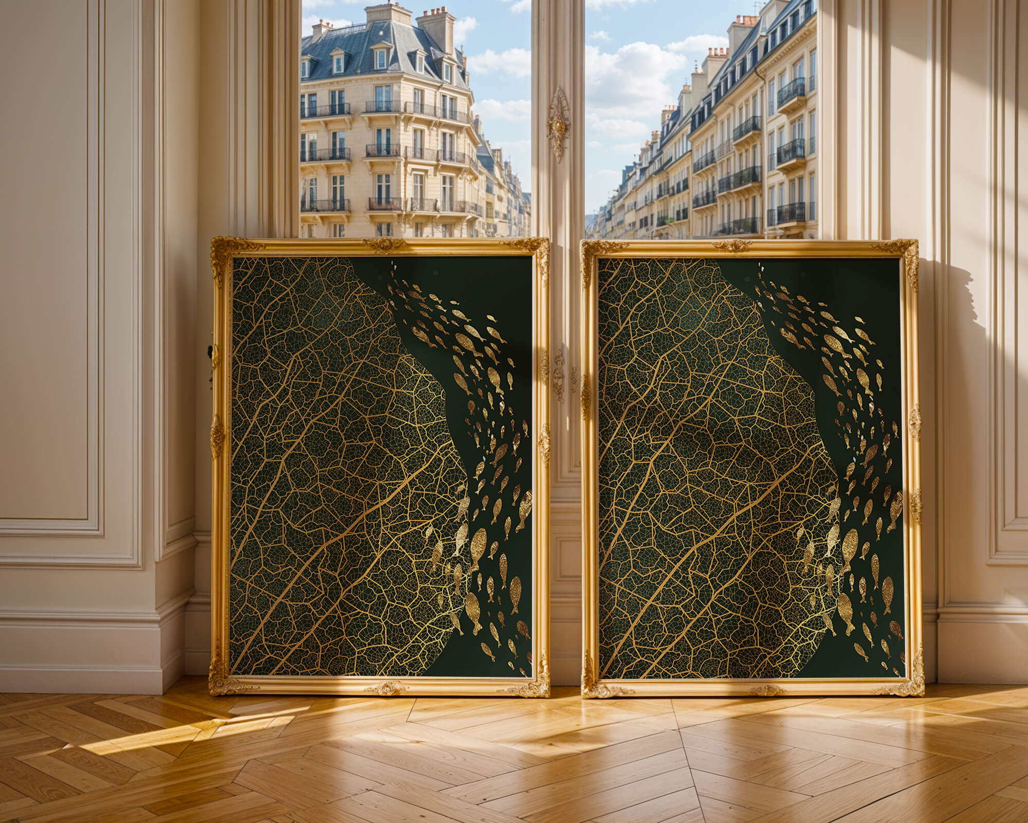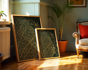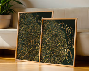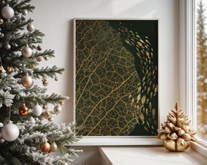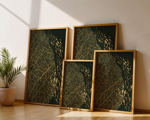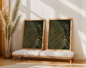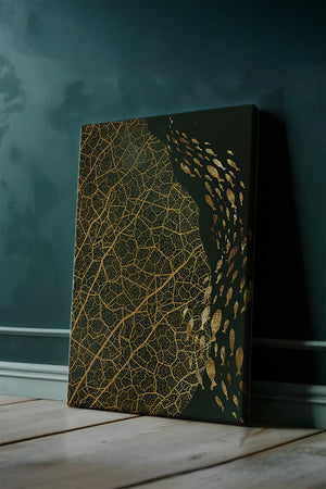 Левая сторона изображения доминируется детализированным геометрическим узором, похожим на жилки листа, выполненным в темно-коричневой и черной палитре. Эти органические формы создают завораживающую текстуру, которая привлекает зрителя в сложности природных дизайнов. Справа изображение показывает множество силуэтов рыб, движущихся грациозно, контрастируя со статичностью узора листа. Плавное движение рыб добавляет динамичный элемент к статической красоте листа, символизируя баланс между движением и неподвижностью. Идеально подходит для современных жилых пространств или офисов, это произведение искусства служит началом для обсуждений, добавляя изысканность и утонченность в декор.| Тип |