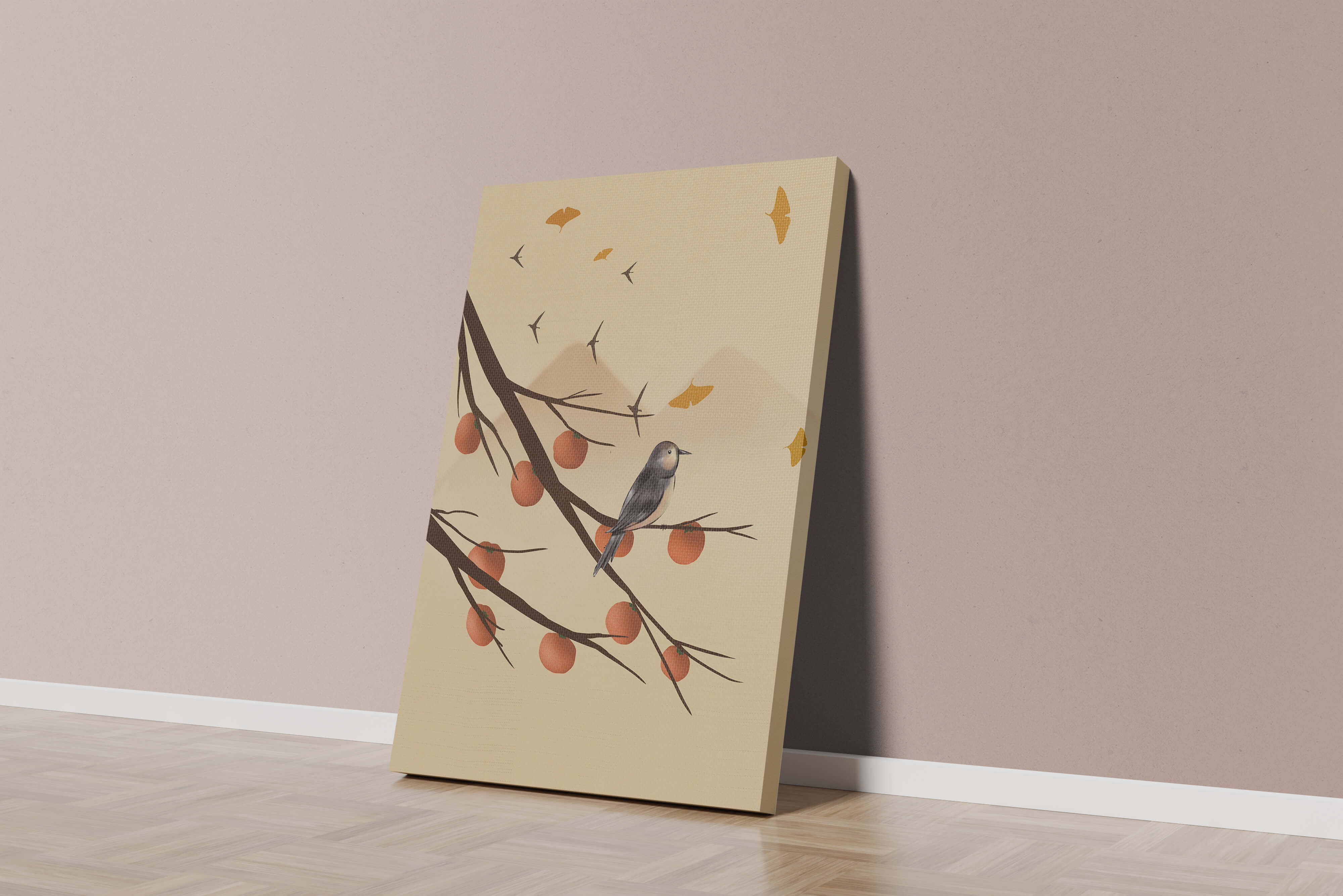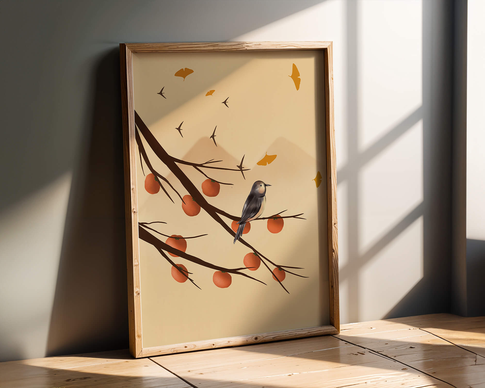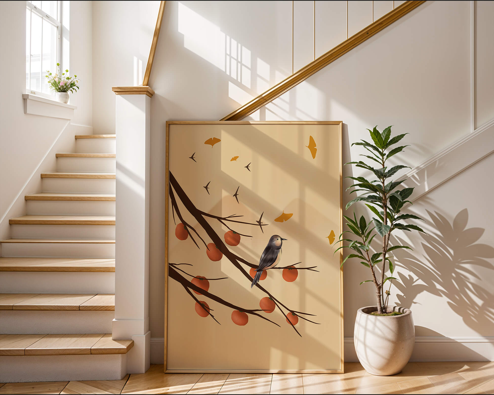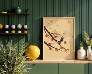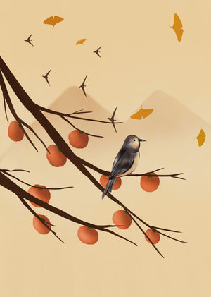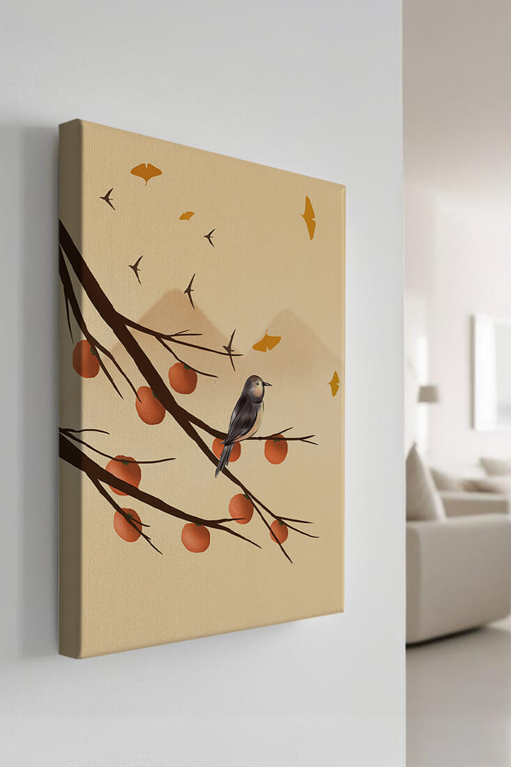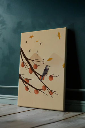Это изображение запечатлело спокойную и элегантную сцену птицы, сидящей на ветке, увешанной красными плодами. Фон украшен стилизованными летящими листьями, создающими атмосферную сцену.