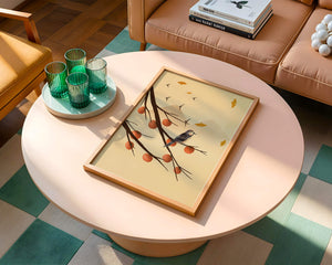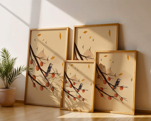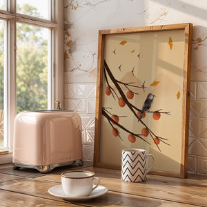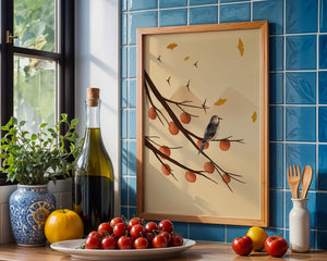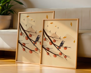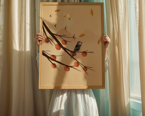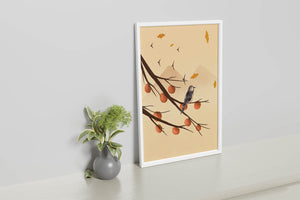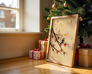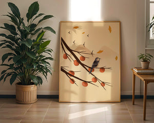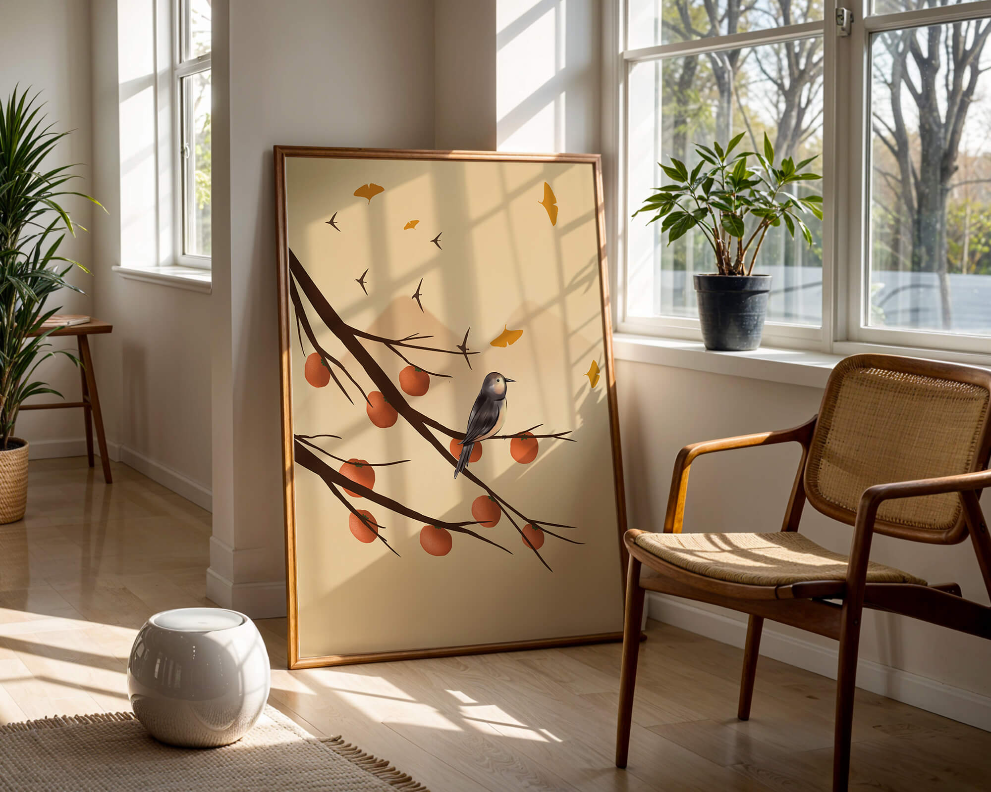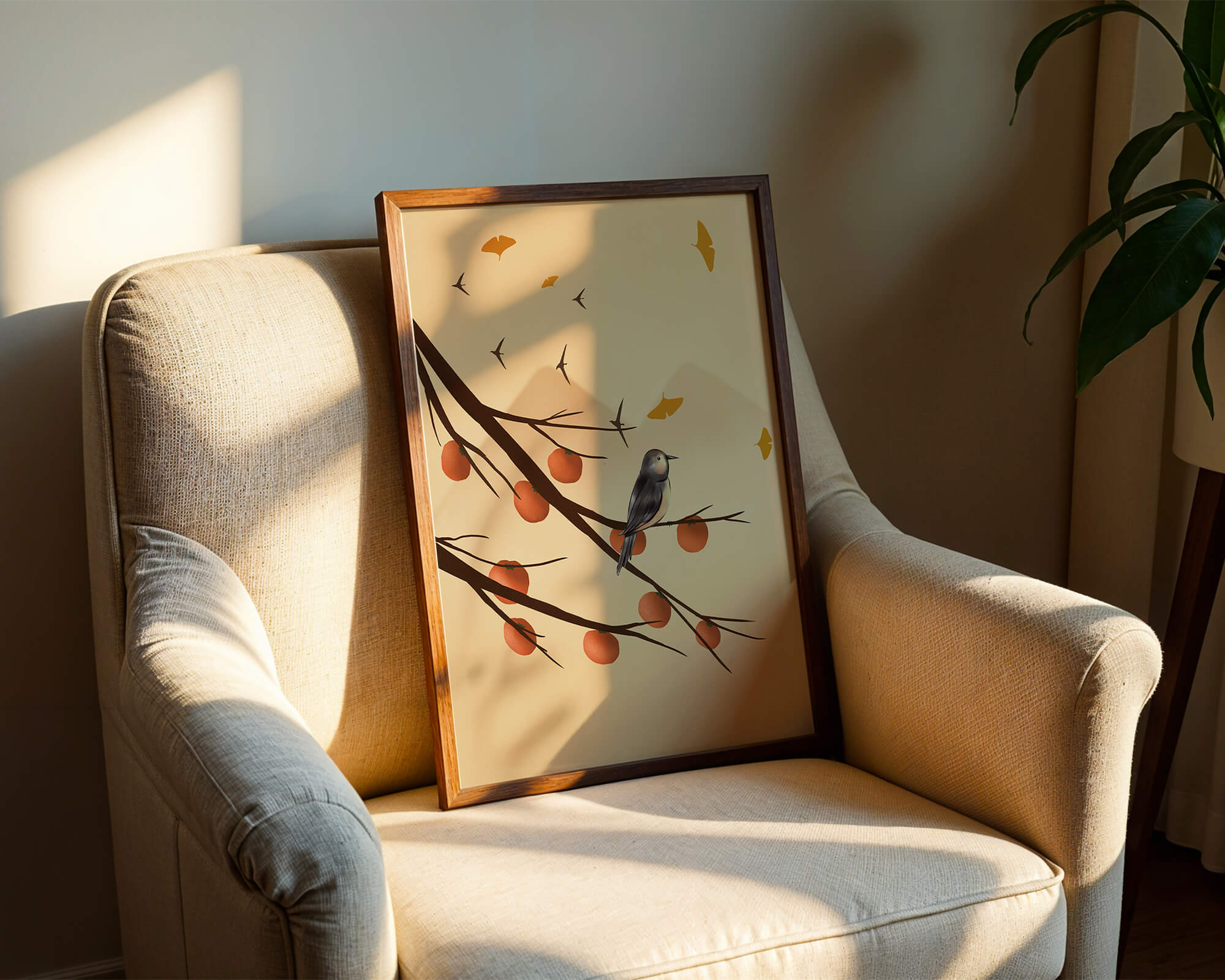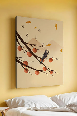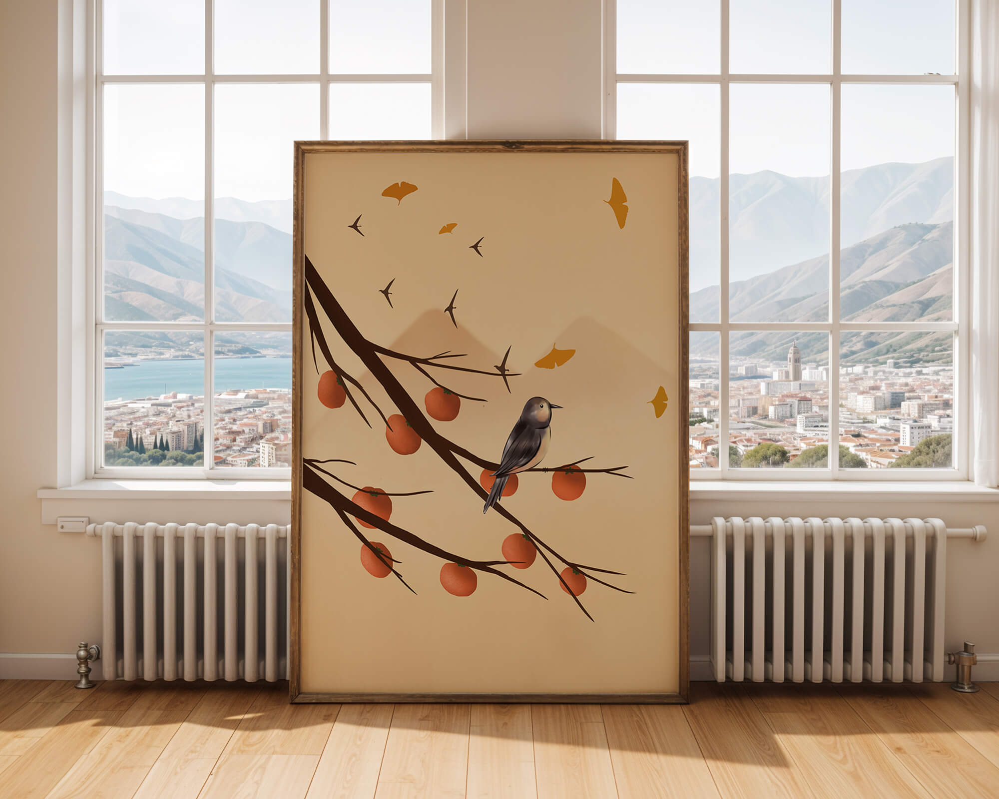 Это изображение запечатлело спокойную и элегантную сцену птицы, сидящей на ветке, увешанной красными плодами. Фон украшен стилизованными летящими листьями, создающими атмосферную сцену.