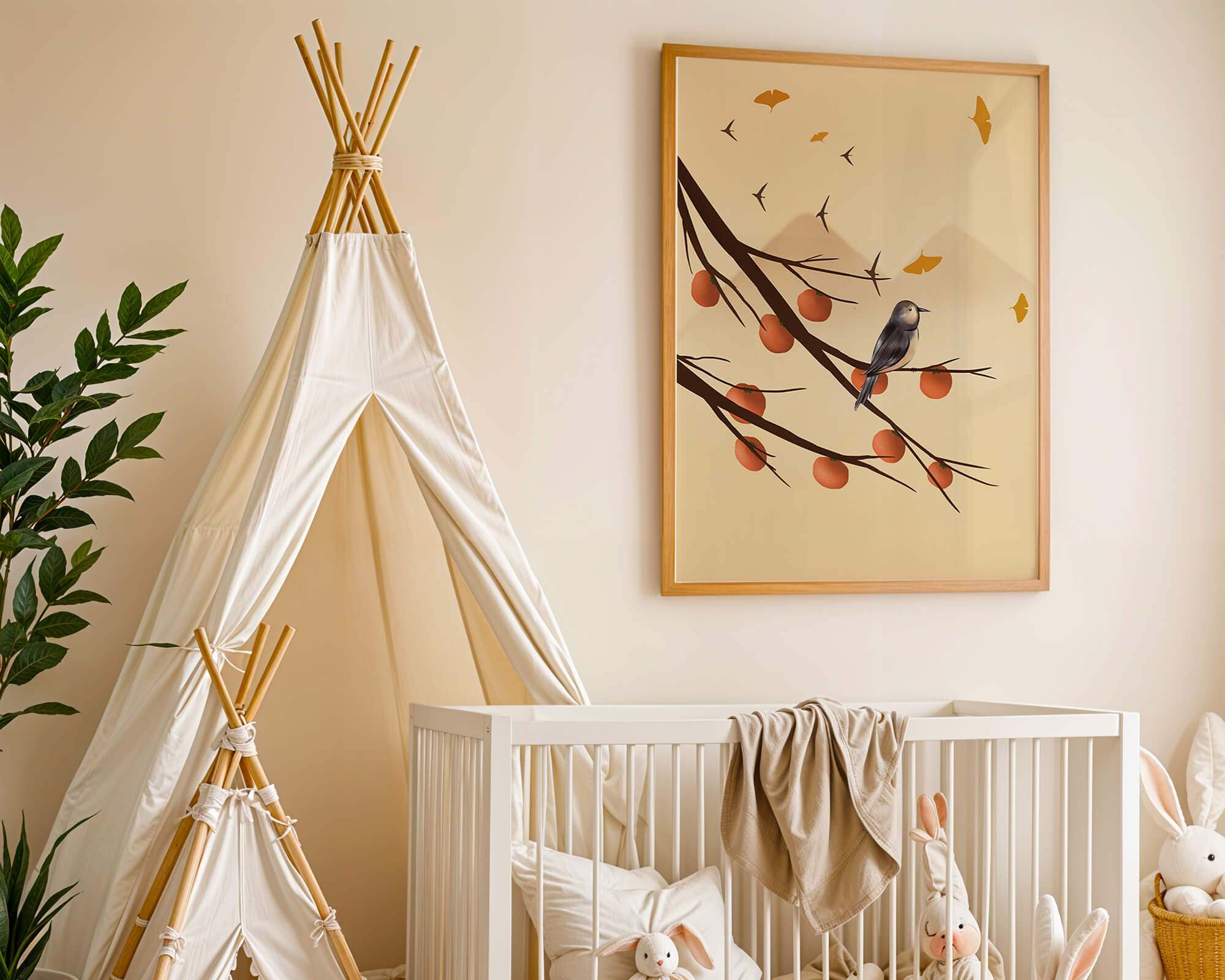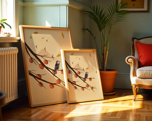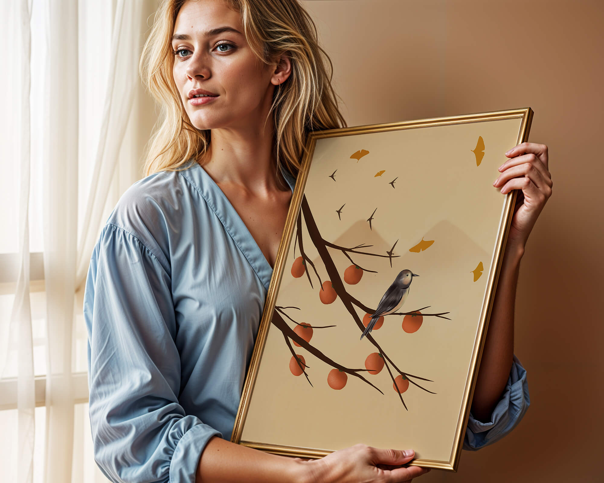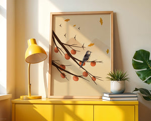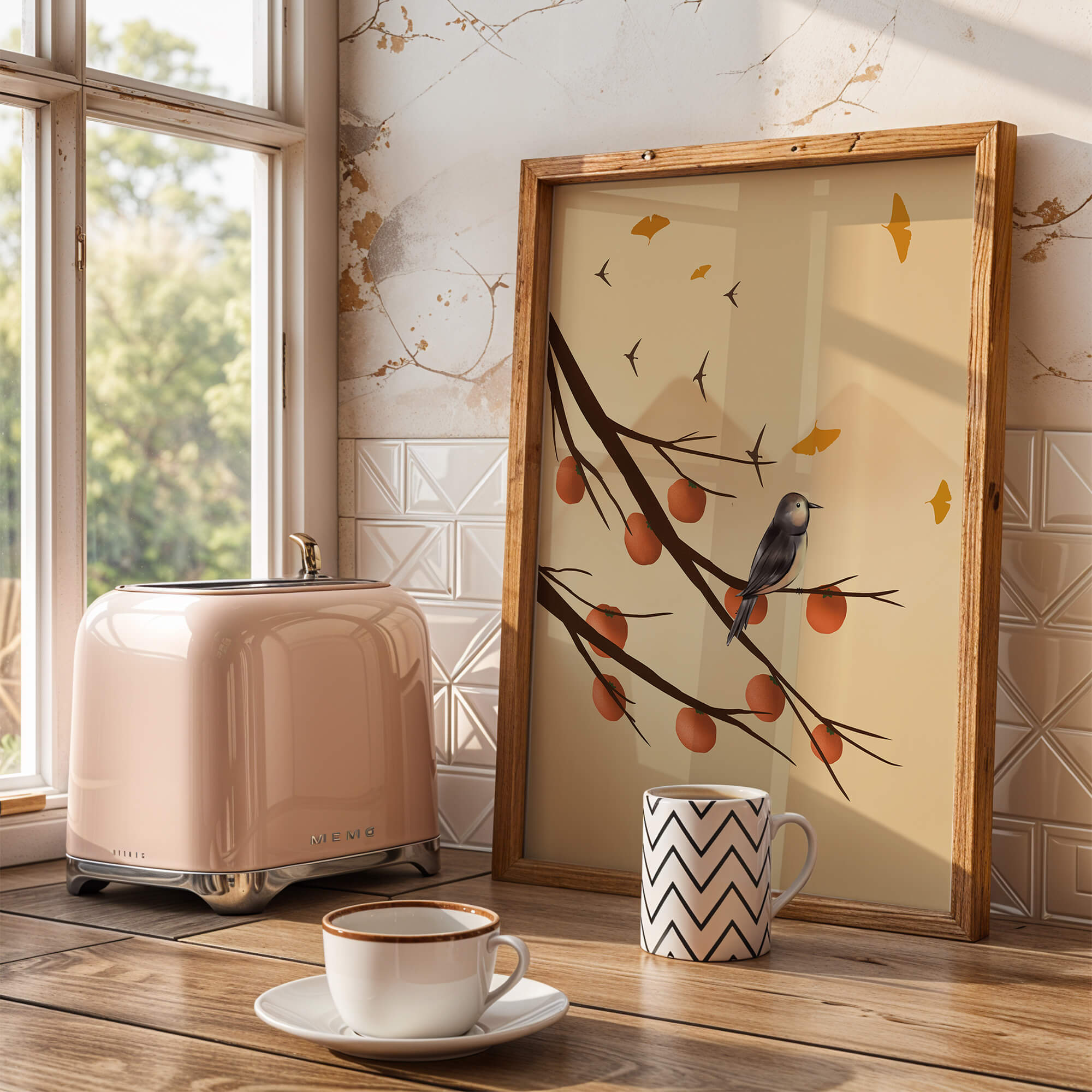 Произведение искусства демонстрирует спокойное и сдержанное изображение природы. Центральное внимание привлекает птица, изящно сидящая на ветке, заполненной ярко-красными плодами. Простая цветовая палитра и четкие линии подчеркивают минималистический подход, добавляя изысканность дизайну. Движение листьев и сбалансированная композиция вызывают ощущение гармонии и четкости. Этот принт подходит для улучшения атмосферы различных интерьеров, предлагая нотку элегантности и природной красоты.| Тип |