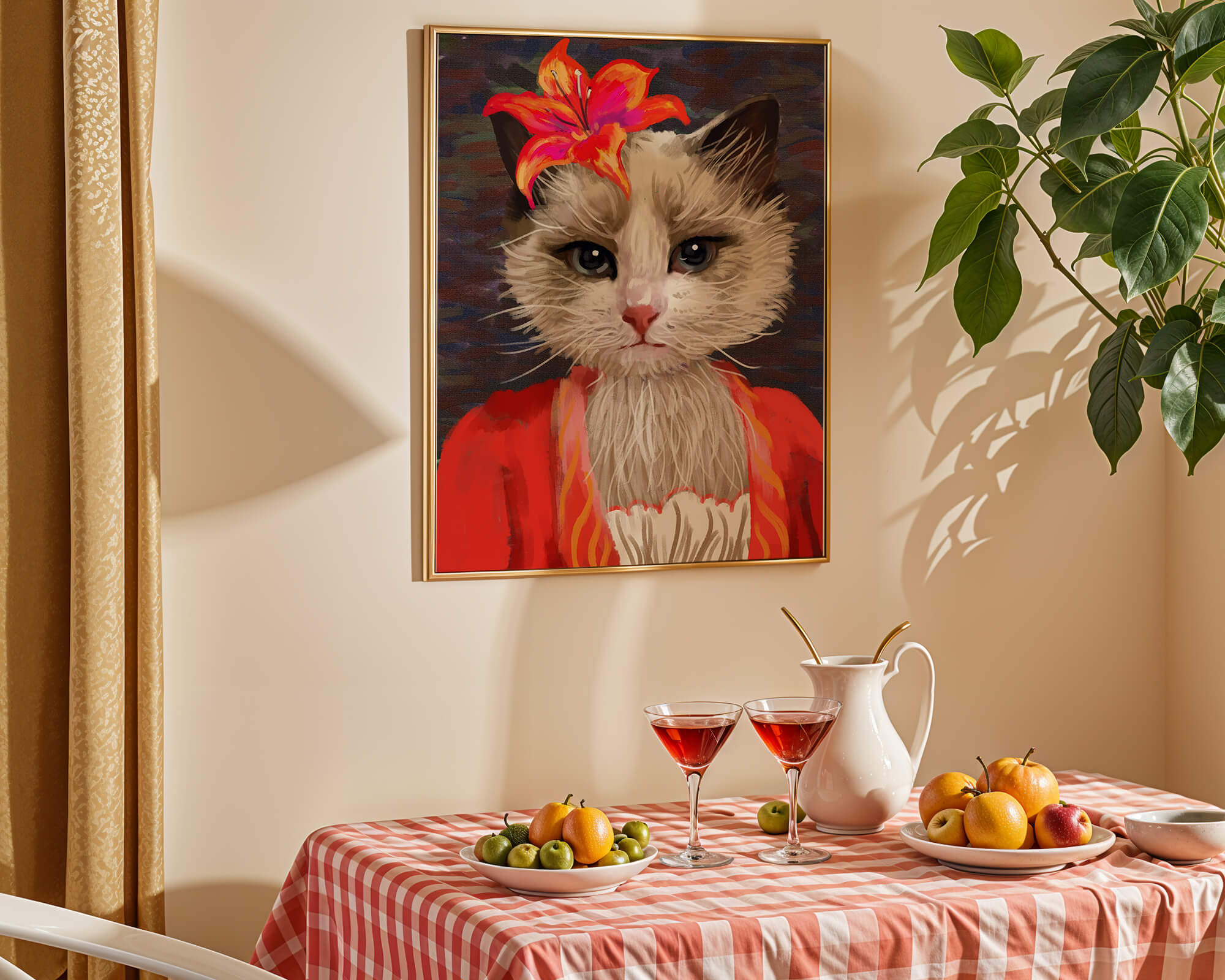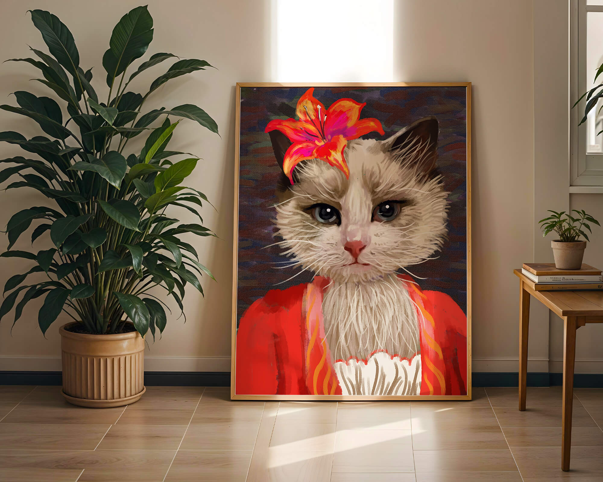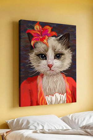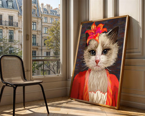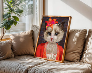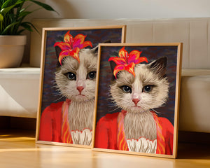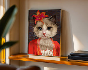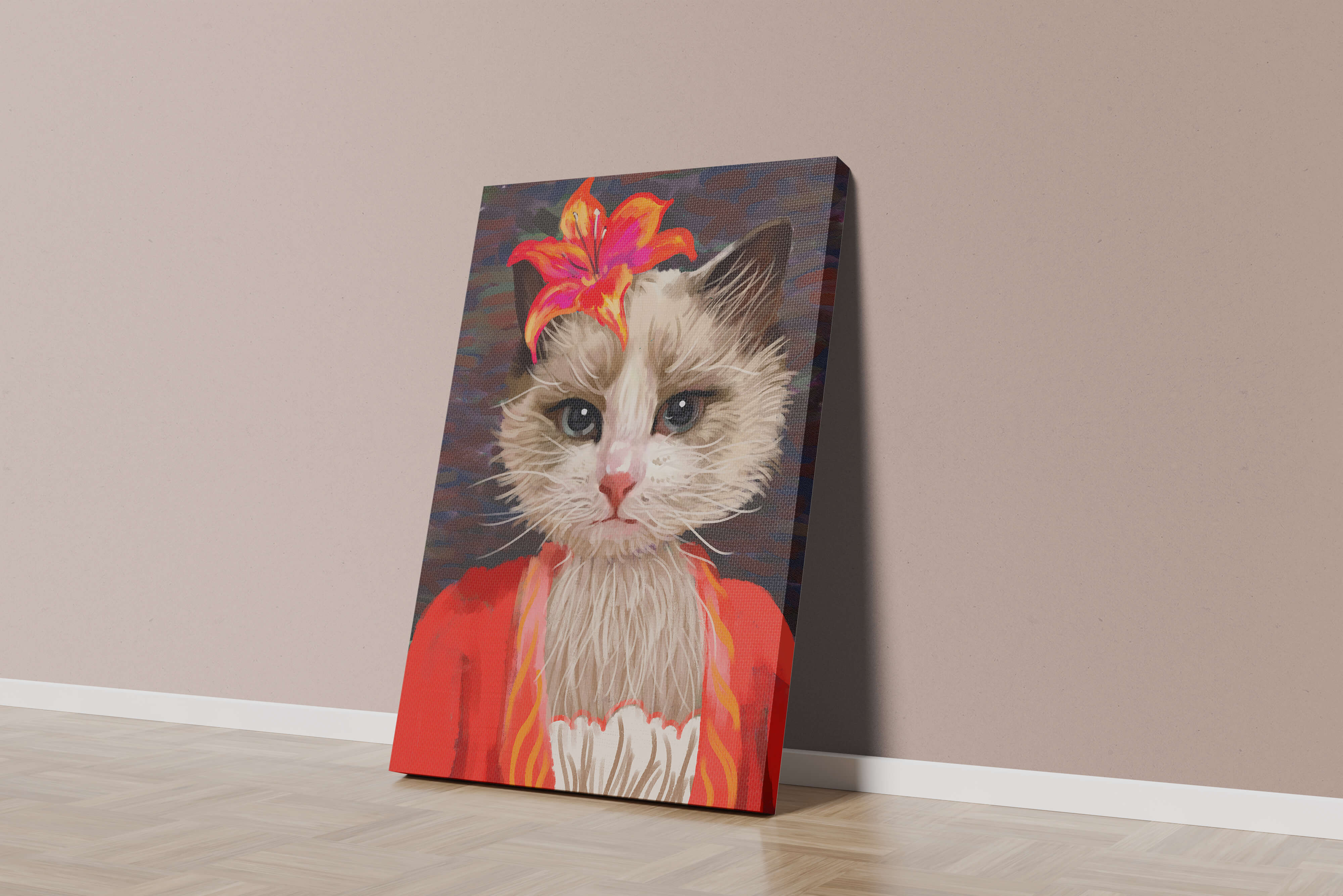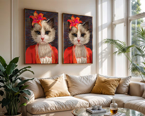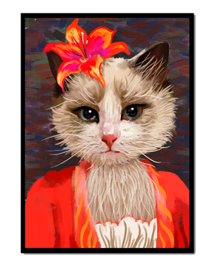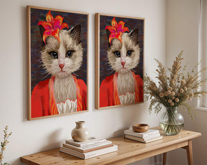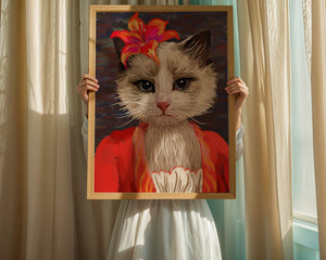 В этом произведении главная роль отведена выразительным глазам кота, которые, кажется, передают историю любопытства и игривости. Цветок, расположенный на голове кота, служит зацепляющим элементом, усиливающим общий эстетический вид своими насыщенными, яркими оттенками. Теплые тона цветка и контраст с красной одеждой придают изображению праздничный, но классный вид. Едва заметная текстура фона создает глубину, гарантируя, что центральная фигура остается в центре внимания. Это изображение идеально для тех, кто хочет добавить в свое пространство немного юмора и утонченности, делая его восхитительным выбором для любителей животных и ценителей искусства.| Тип |