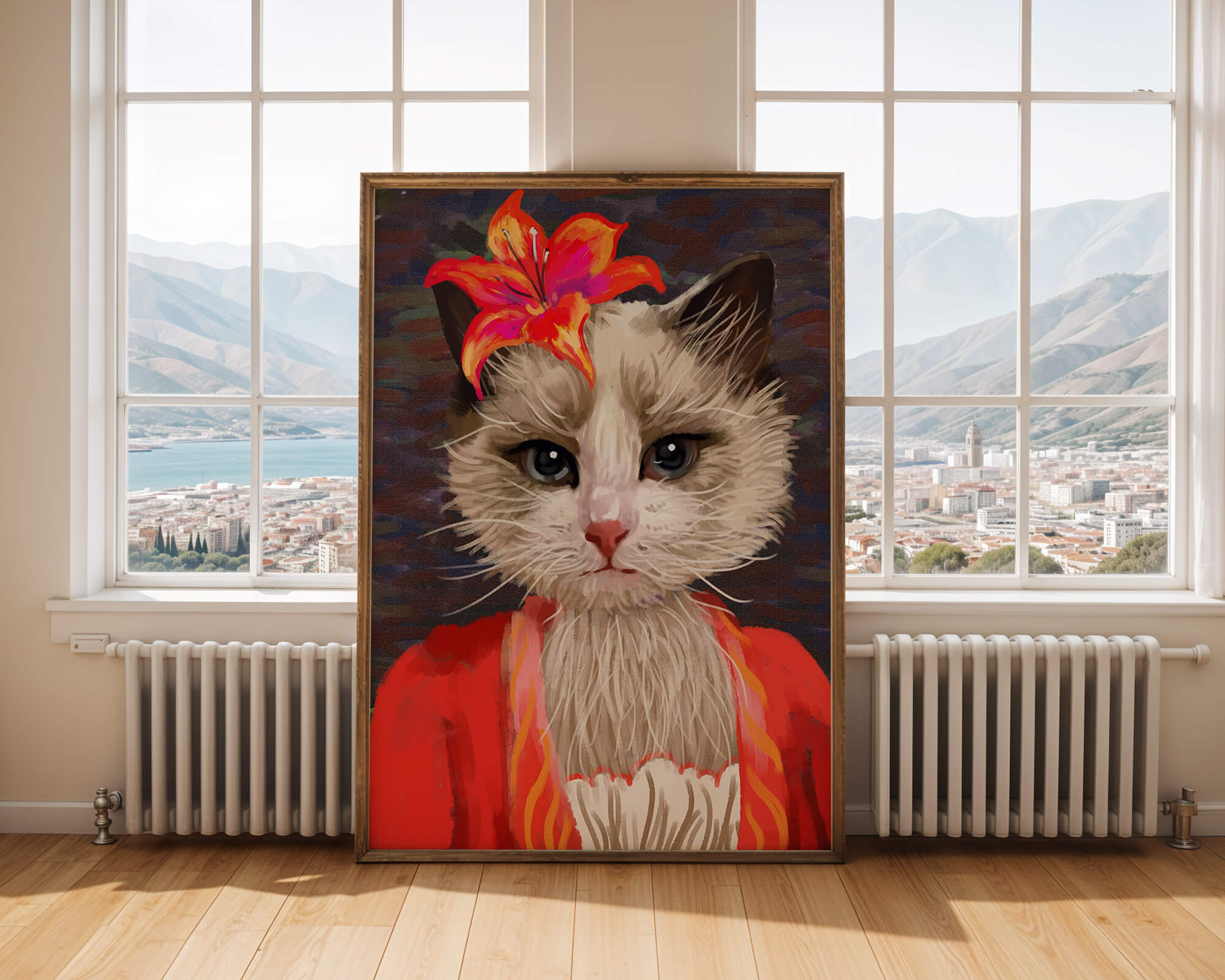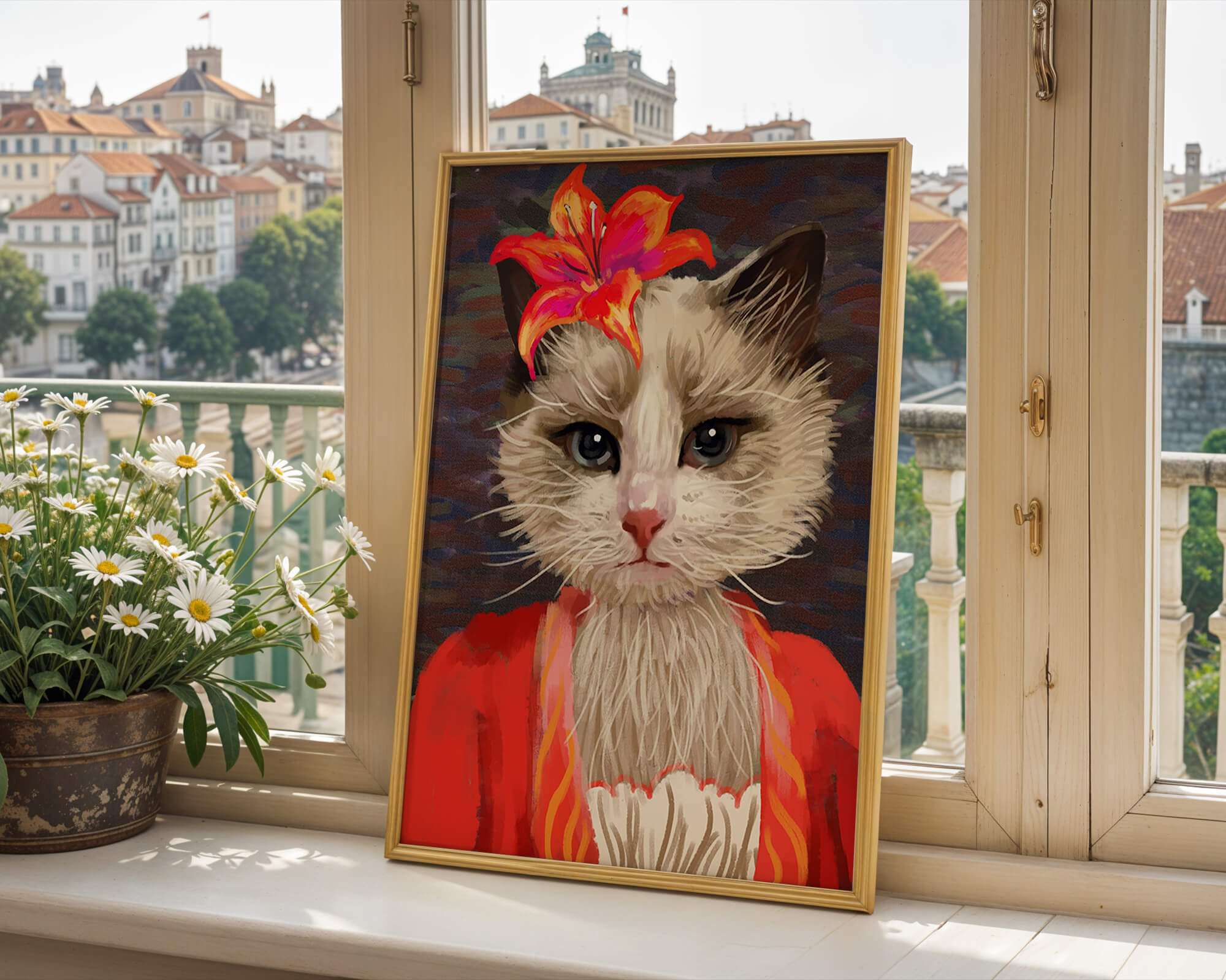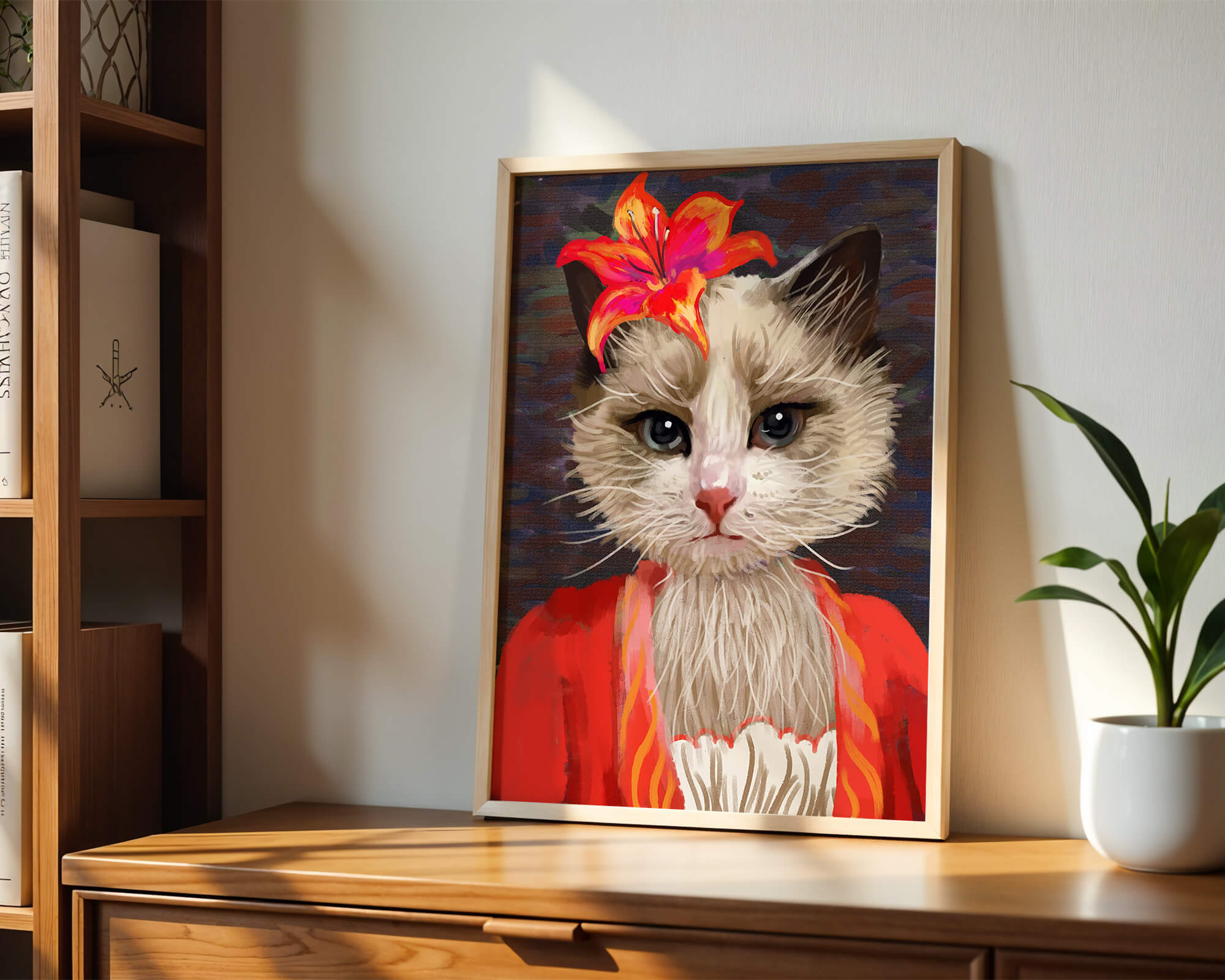 В этом произведении главная роль отведена выразительным глазам кота, которые, кажется, передают историю любопытства и игривости. Цветок, расположенный на голове кота, служит зацепляющим элементом, усиливающим общий эстетический вид своими насыщенными, яркими оттенками. Теплые тона цветка и контраст с красной одеждой придают изображению праздничный, но классный вид. Едва заметная текстура фона создает глубину, гарантируя, что центральная фигура остается в центре внимания. Это изображение идеально для тех, кто хочет добавить в свое пространство немного юмора и утонченности, делая его восхитительным выбором для любителей животных и ценителей искусства.| Тип |