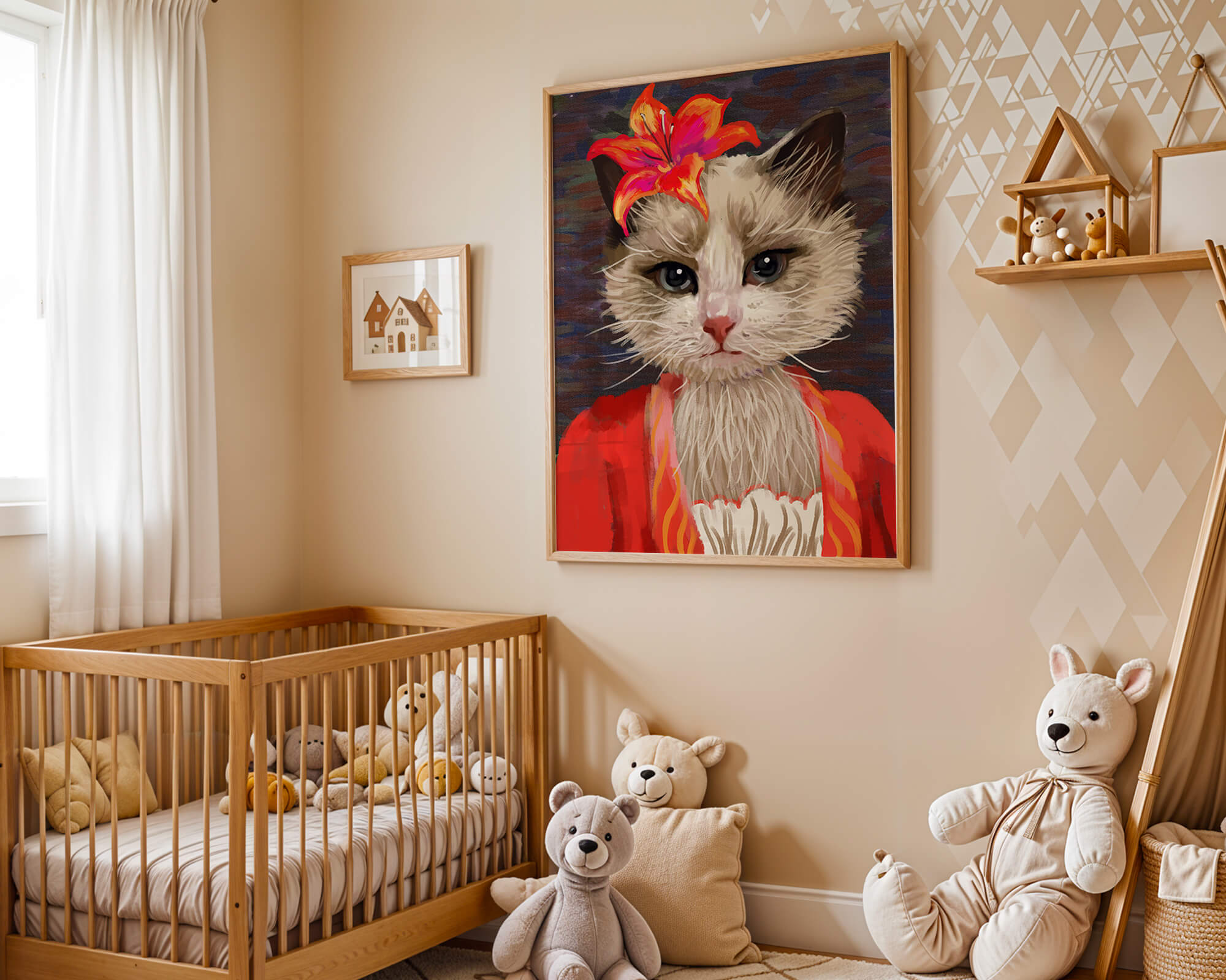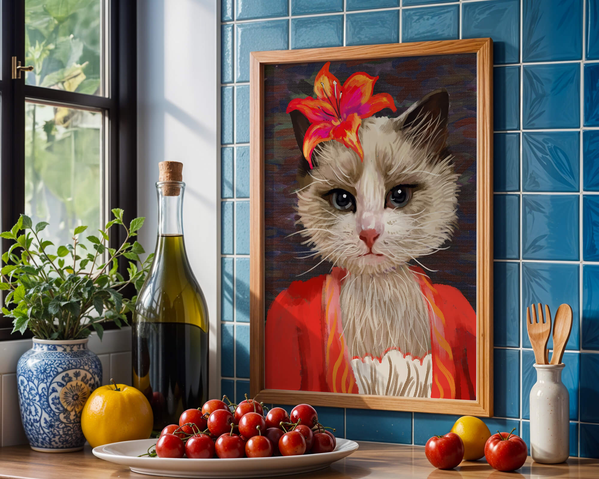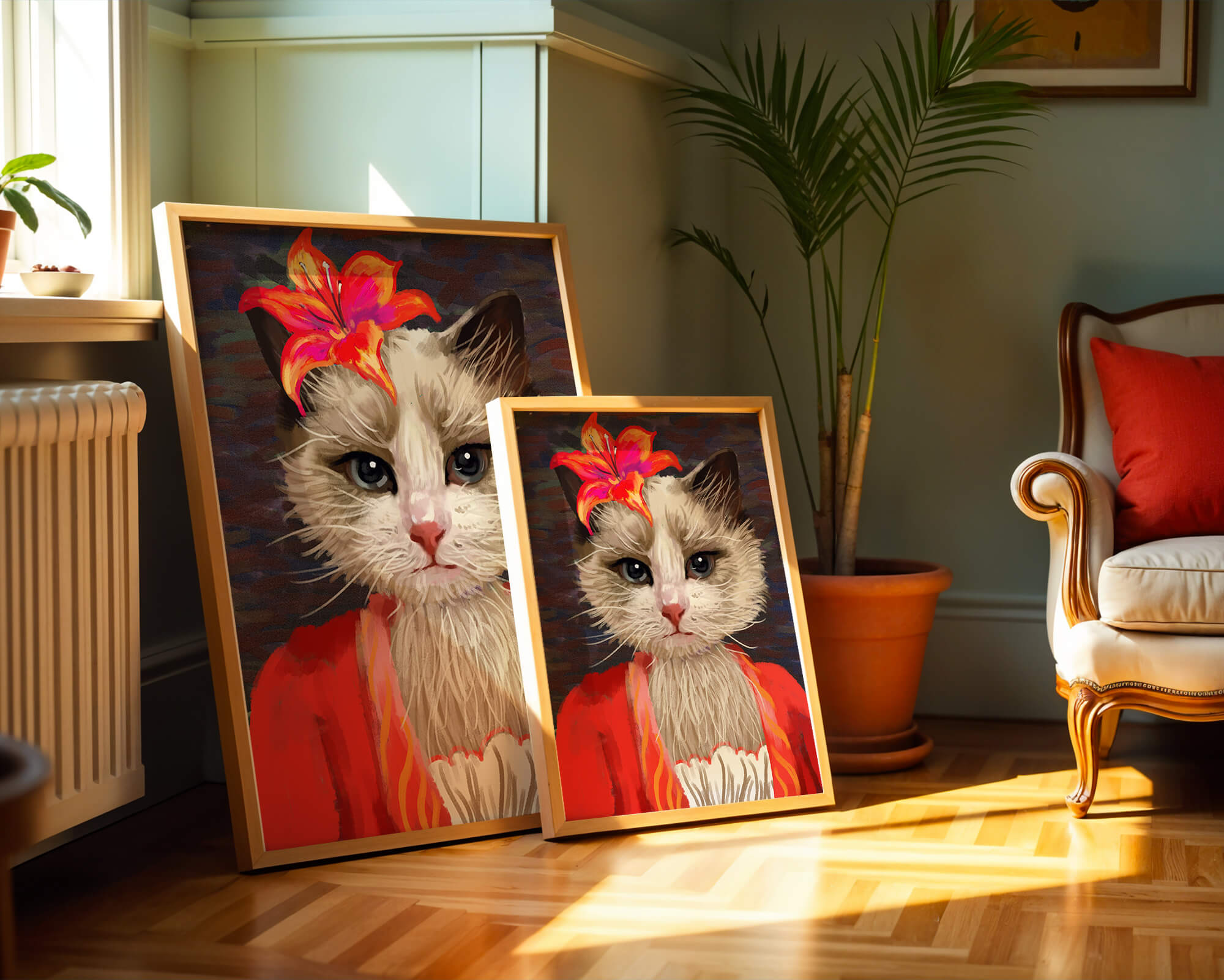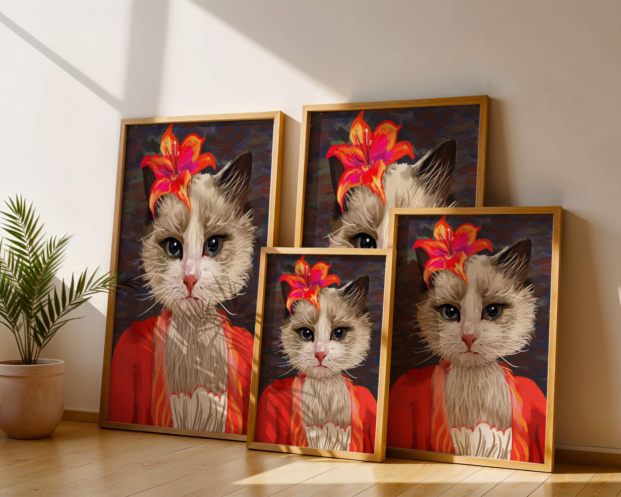 В этом произведении главная роль отведена выразительным глазам кота, которые, кажется, передают историю любопытства и игривости. Цветок, расположенный на голове кота, служит зацепляющим элементом, усиливающим общий эстетический вид своими насыщенными, яркими оттенками. Теплые тона цветка и контраст с красной одеждой придают изображению праздничный, но классный вид. Едва заметная текстура фона создает глубину, гарантируя, что центральная фигура остается в центре внимания. Это изображение идеально для тех, кто хочет добавить в свое пространство немного юмора и утонченности, делая его восхитительным выбором для любителей животных и ценителей искусства.| Тип |