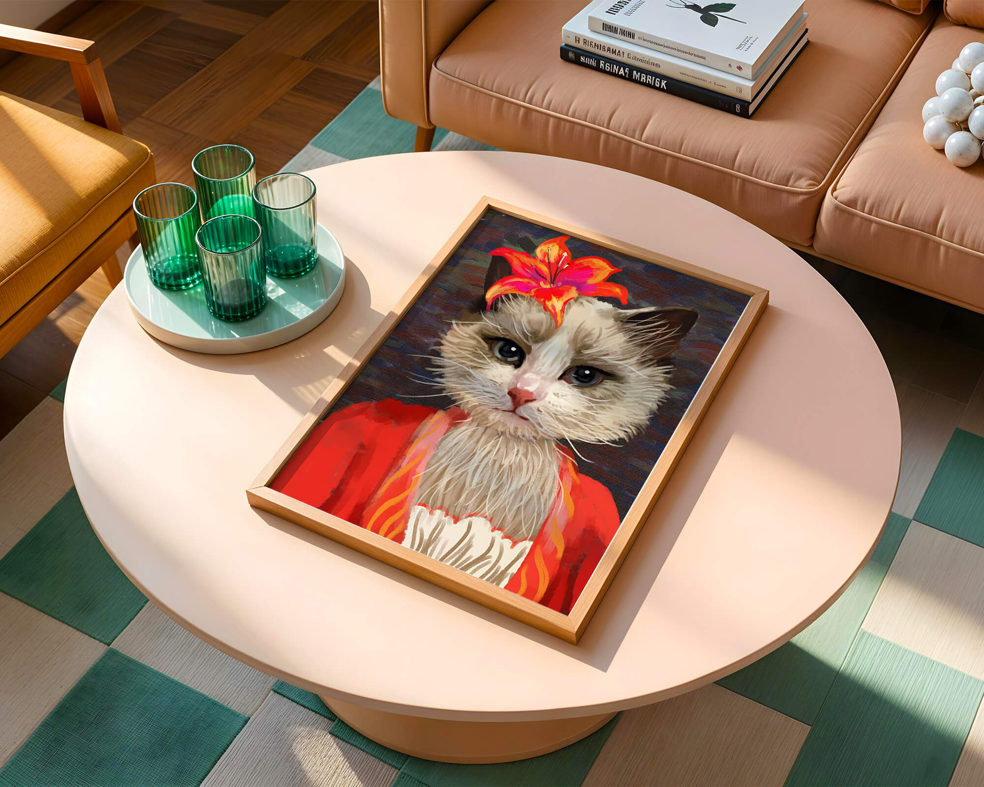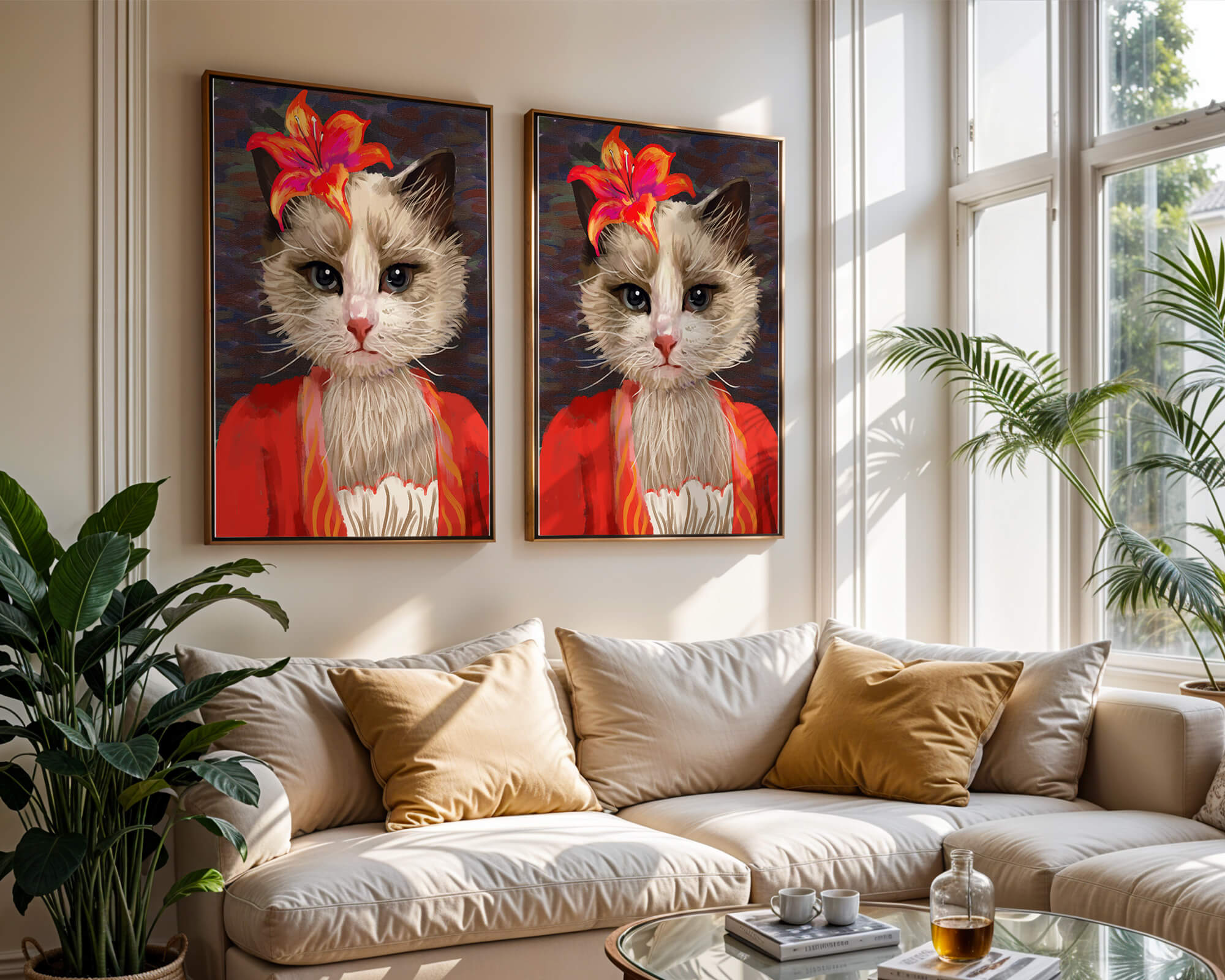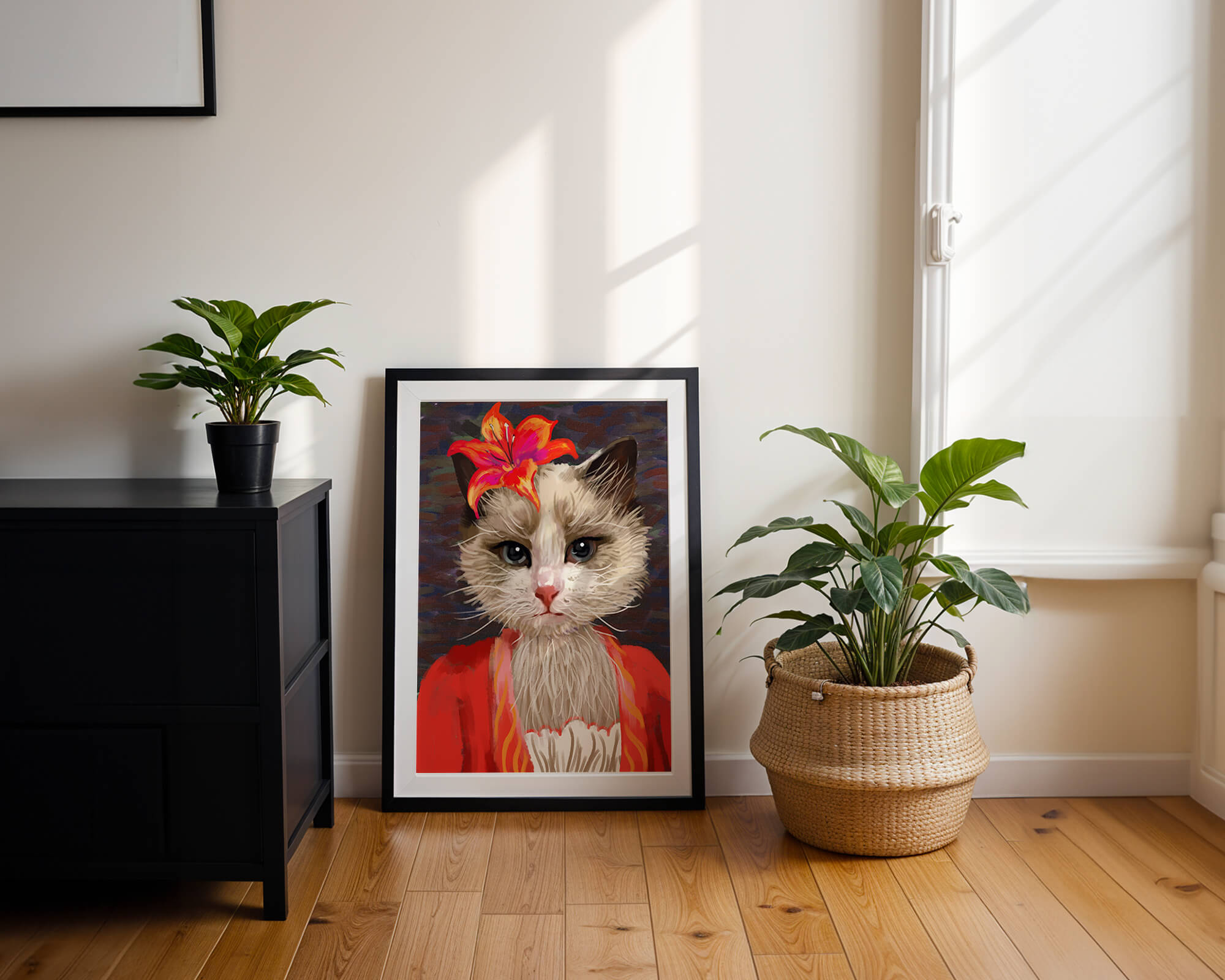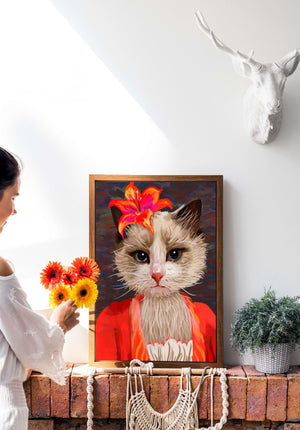 Retrato de gato con acento de flores vibrantes y ropa colorida