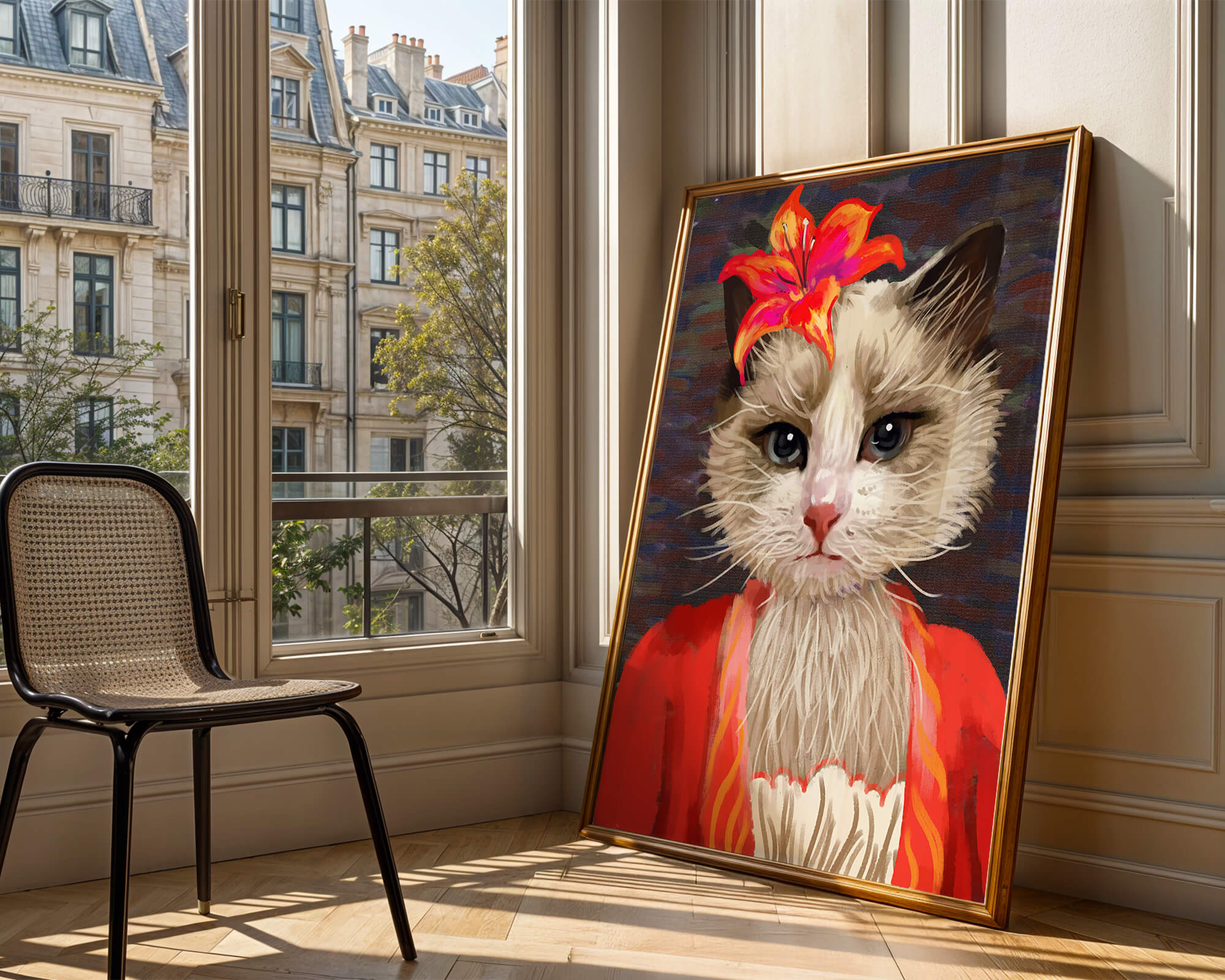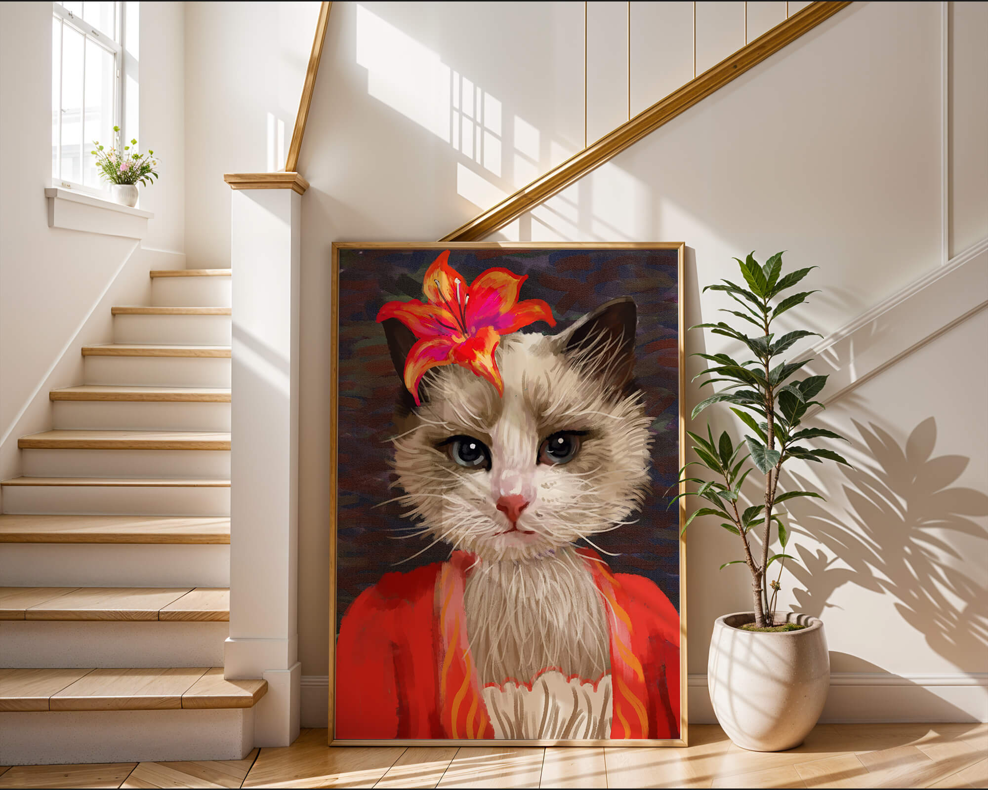 Этот захватывающий образ представляет собой поразительный портрет кота, украшенного ярким оранжевым цветком, придающим шарм и элегантность. Одетый в красочный наряд, этот кот становится воплощением и причудливости, и утонченности, идеально подходящим для украшения дома.