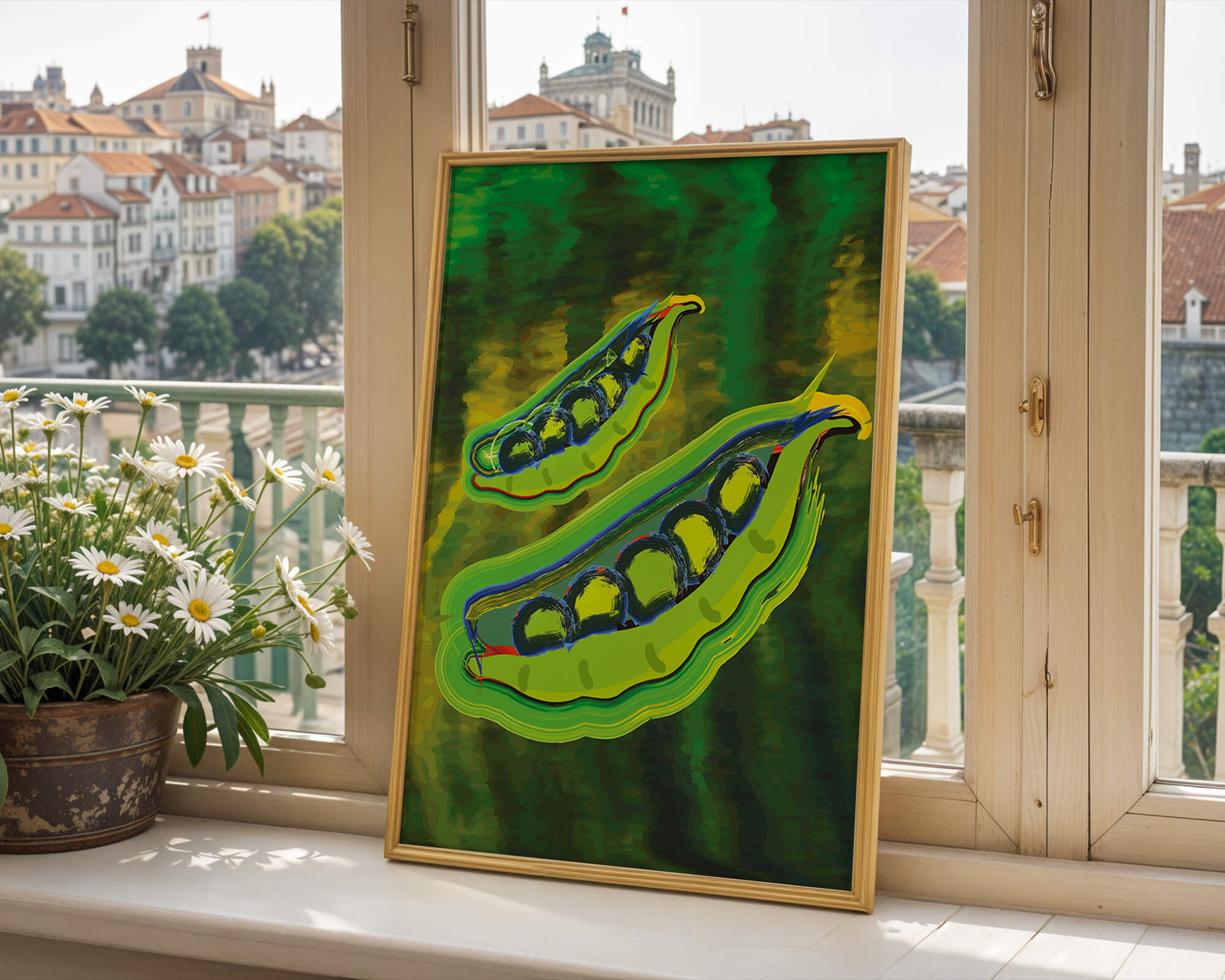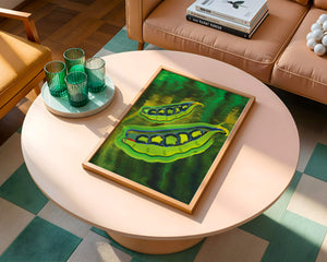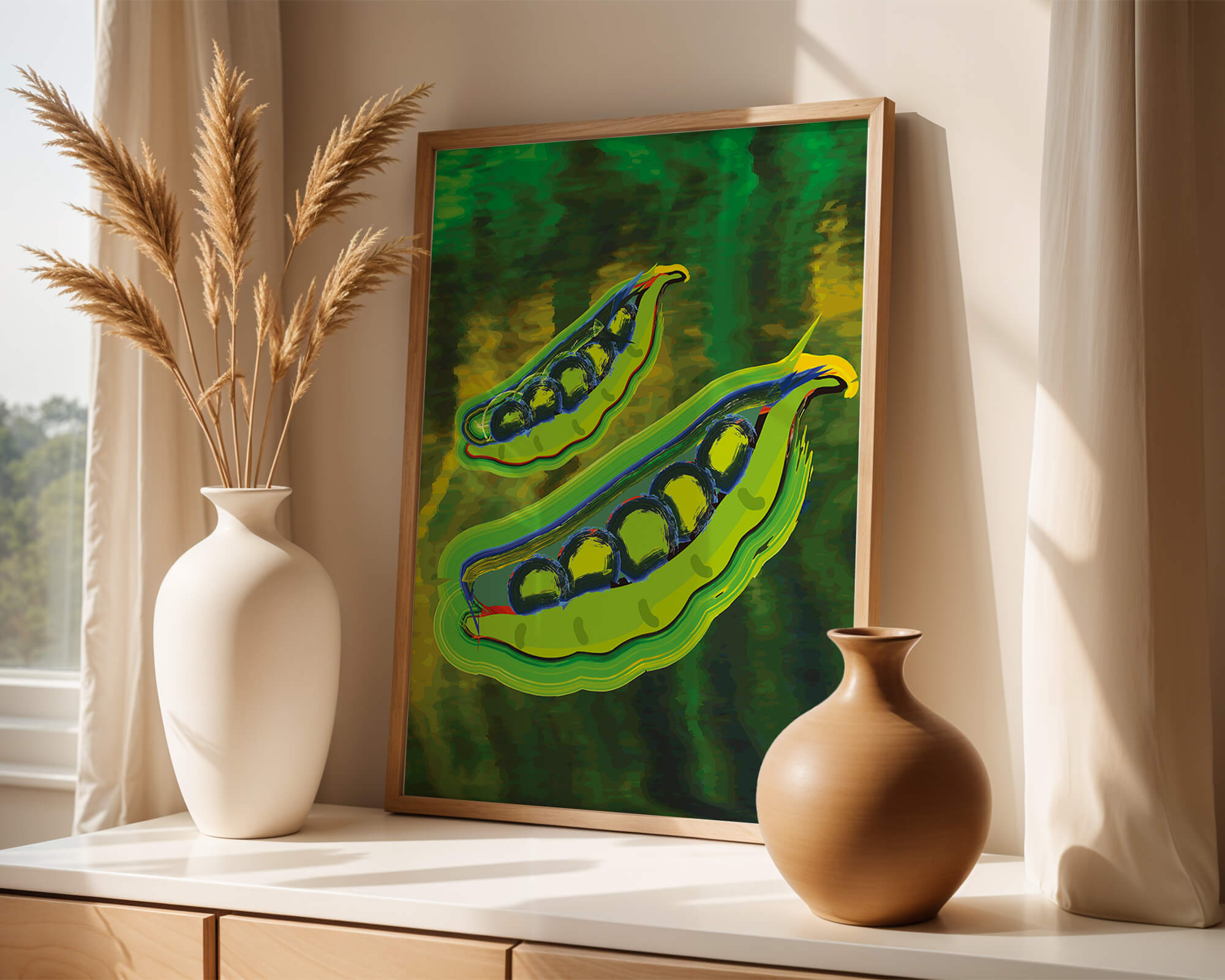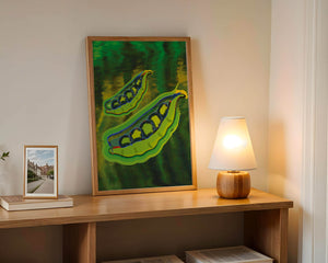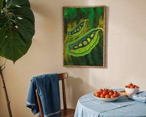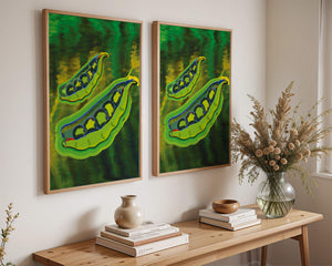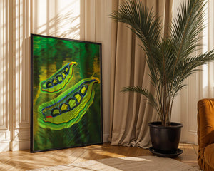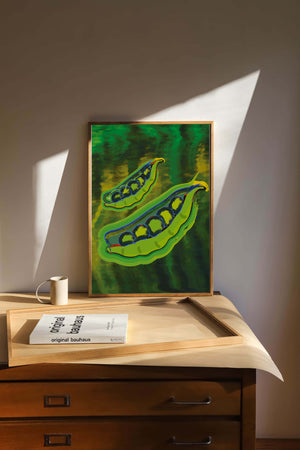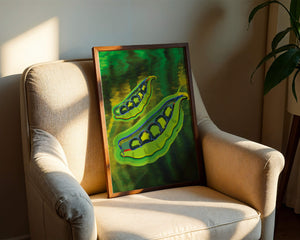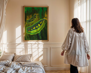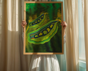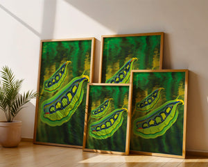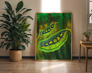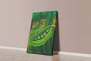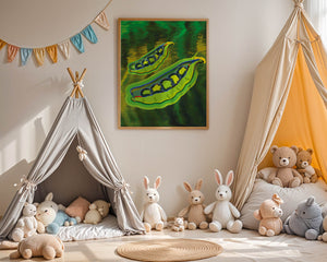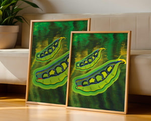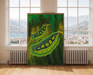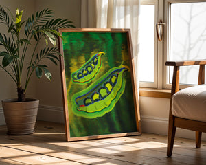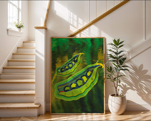Это яркое изображение демонстрирует абстрактную интерпретацию зеленого гороха в стручках на фоне оживленного и динамичного фона. Смелое использование цвета и мазков создает энергетику и современную эстетику, делая его идеальным для любителей искусства и декора кухни.