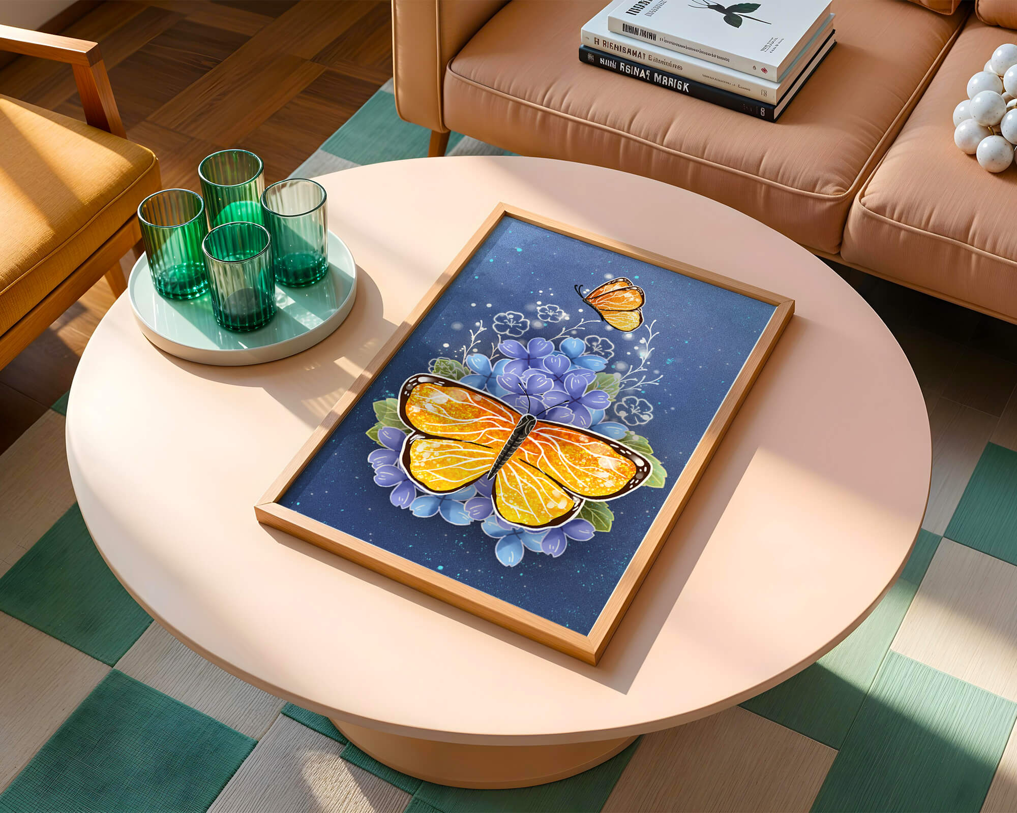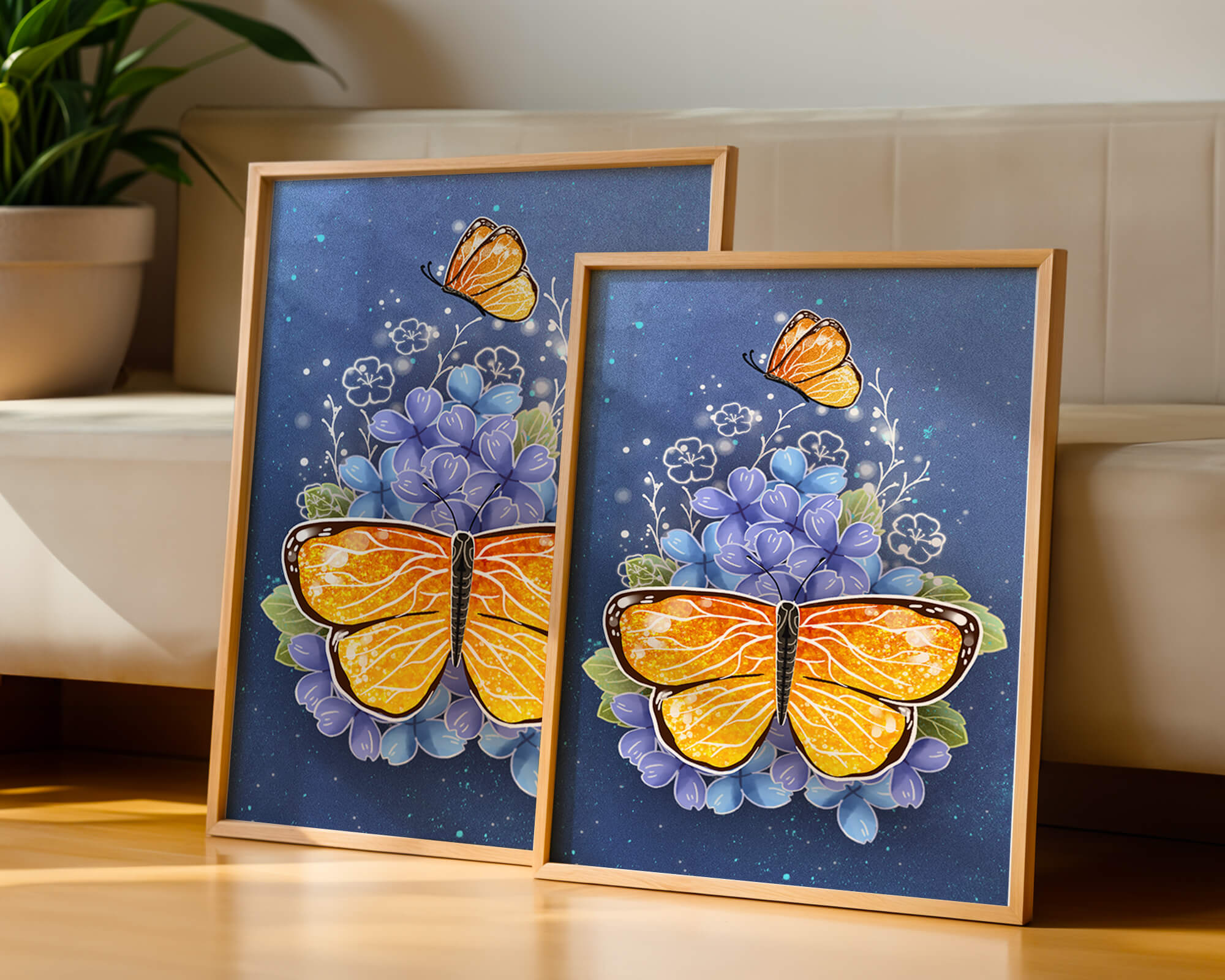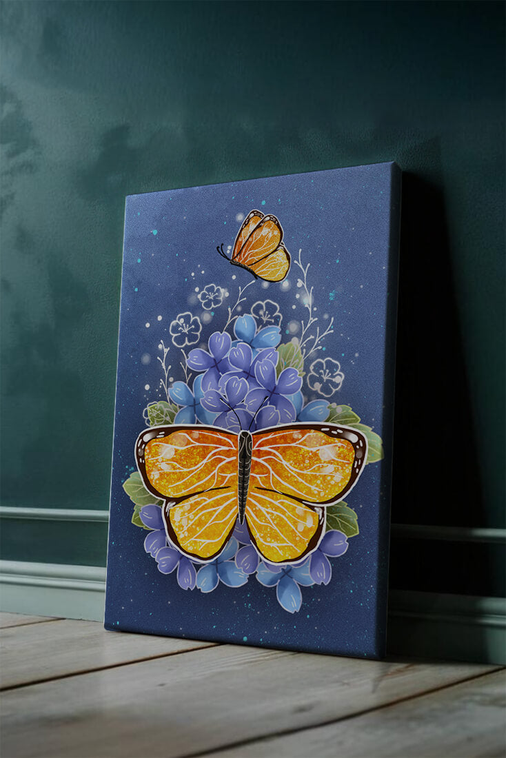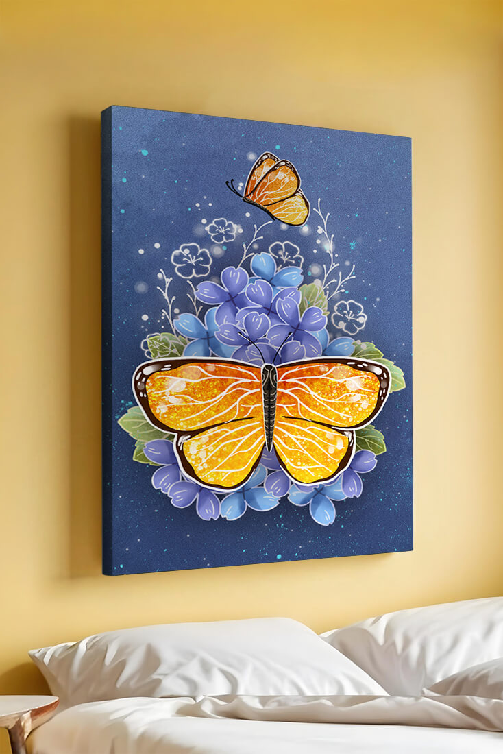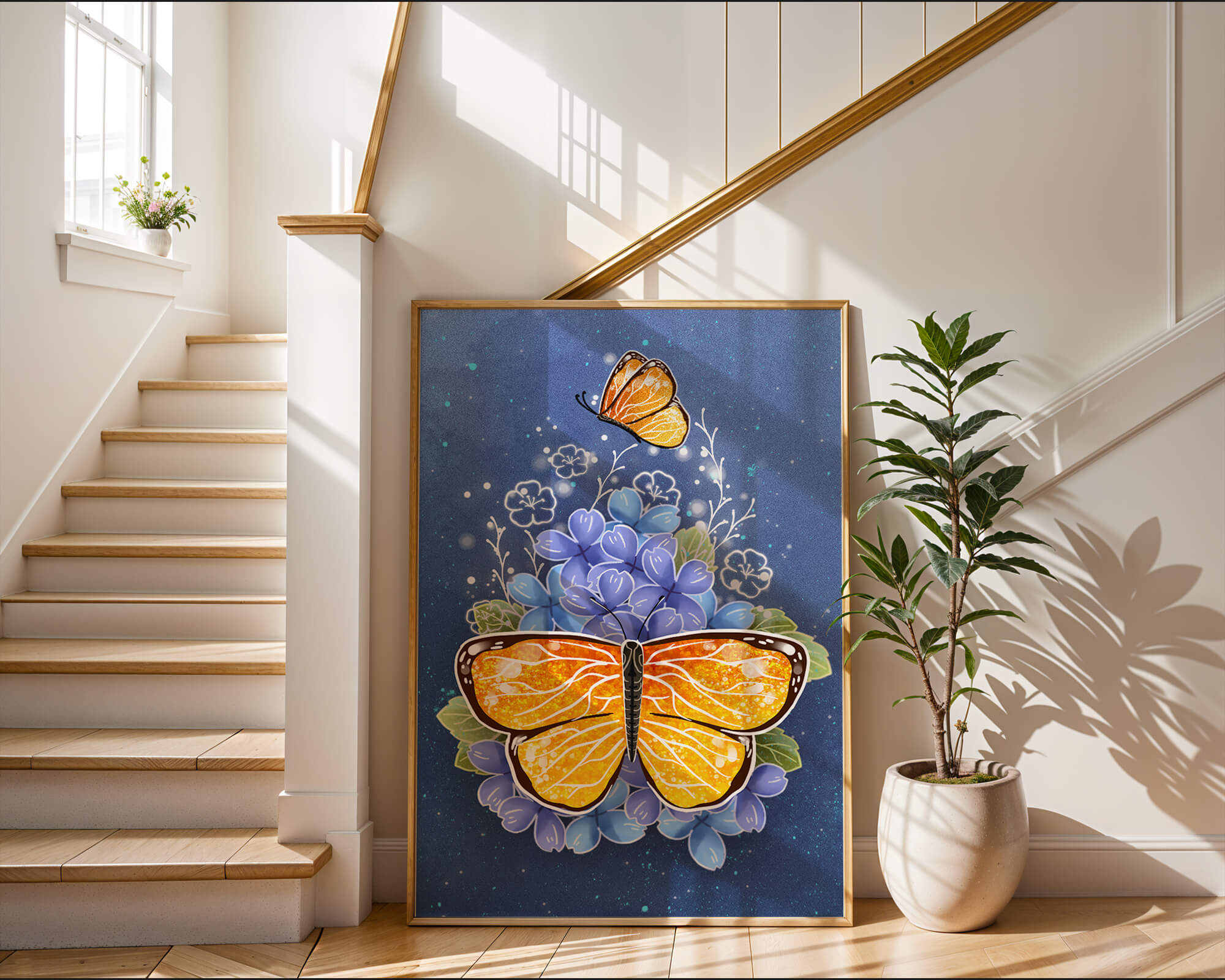Эта иллюстрация прекрасно демонстрирует большую, живописную бабочку с светящимися оранжевыми и золотыми крыльями, грациозно расположенную над постелью ярких синих цветов. Каждый лепесток и лист детализирован с тщательностью, создавая гармоничную и живую сцену, которая запечатлевает сущность красоты природы. Фон, с мягкими синими оттенками, усиливает яркие цвета бабочки и цветов, заставляя изображение оживать. Нежное взаимодействие цветов и замысловатые детали предлагают визуальный спектакль, символизируя свободу и спокойствие природы. Идеально подходит для добавления яркости и прикосновения природы в любую комнату, это произведение искусства — отличный выбор для тех, кто хочет украсить свое жилое пространство с художественным изяществом. Независимо от того, будет ли это для гостиной, спальни или детской комнаты, эта работа приносит чувство удивления и спокойствия.
