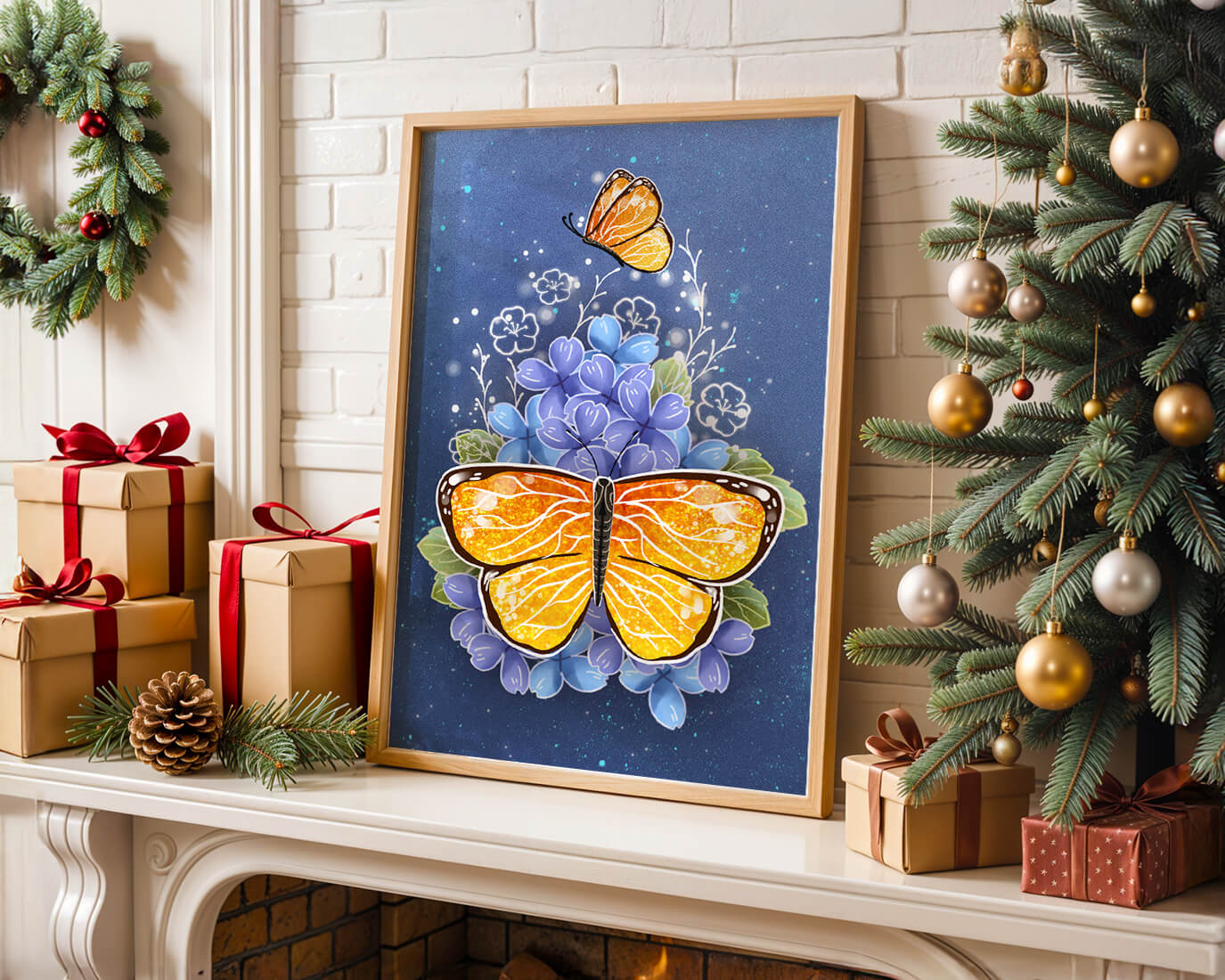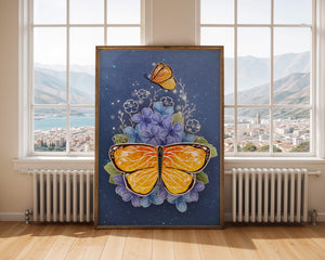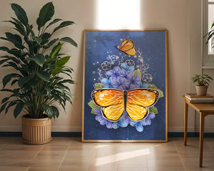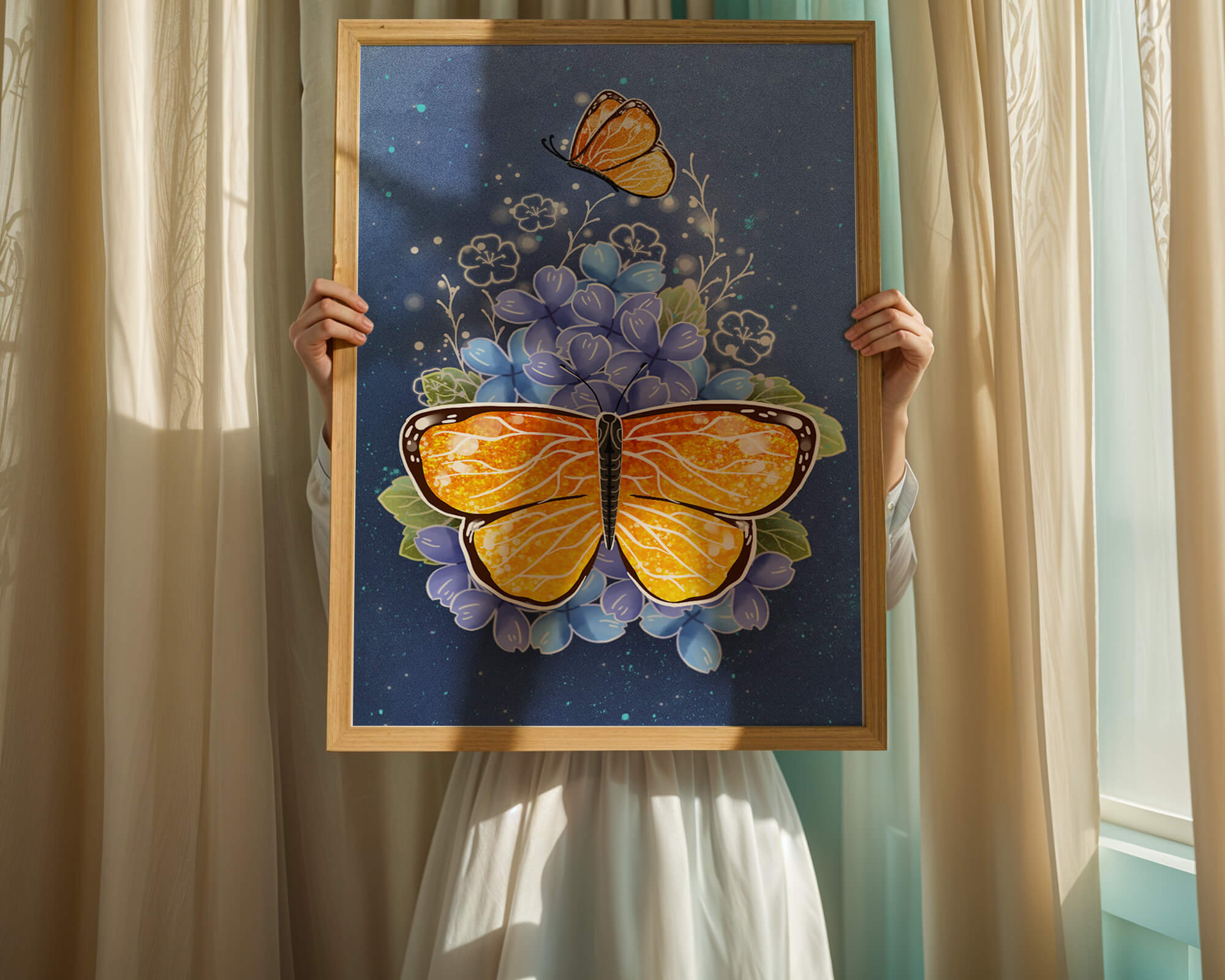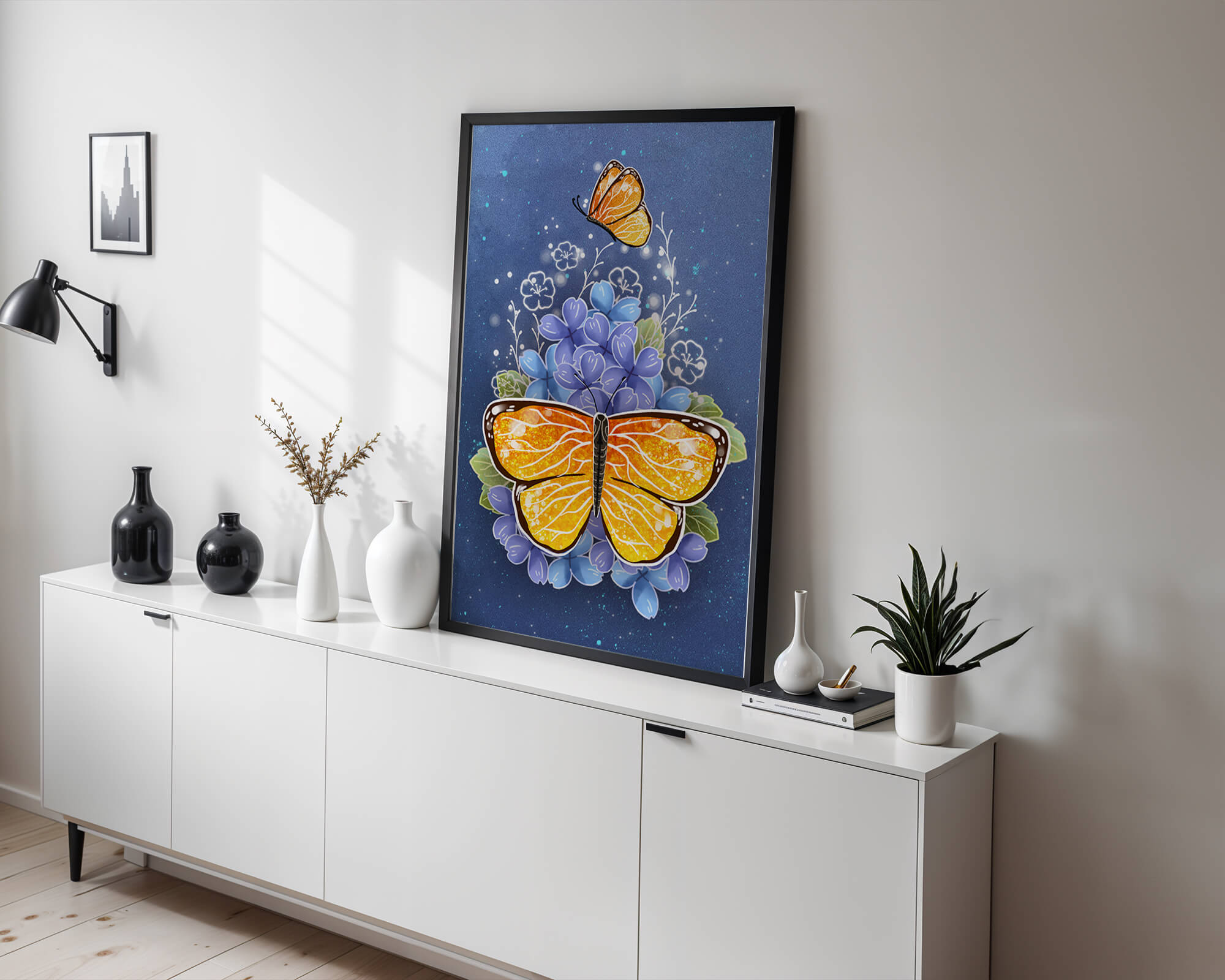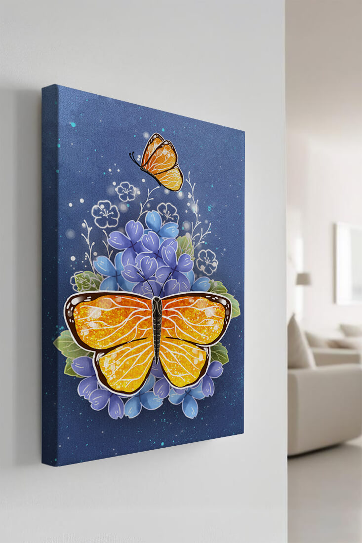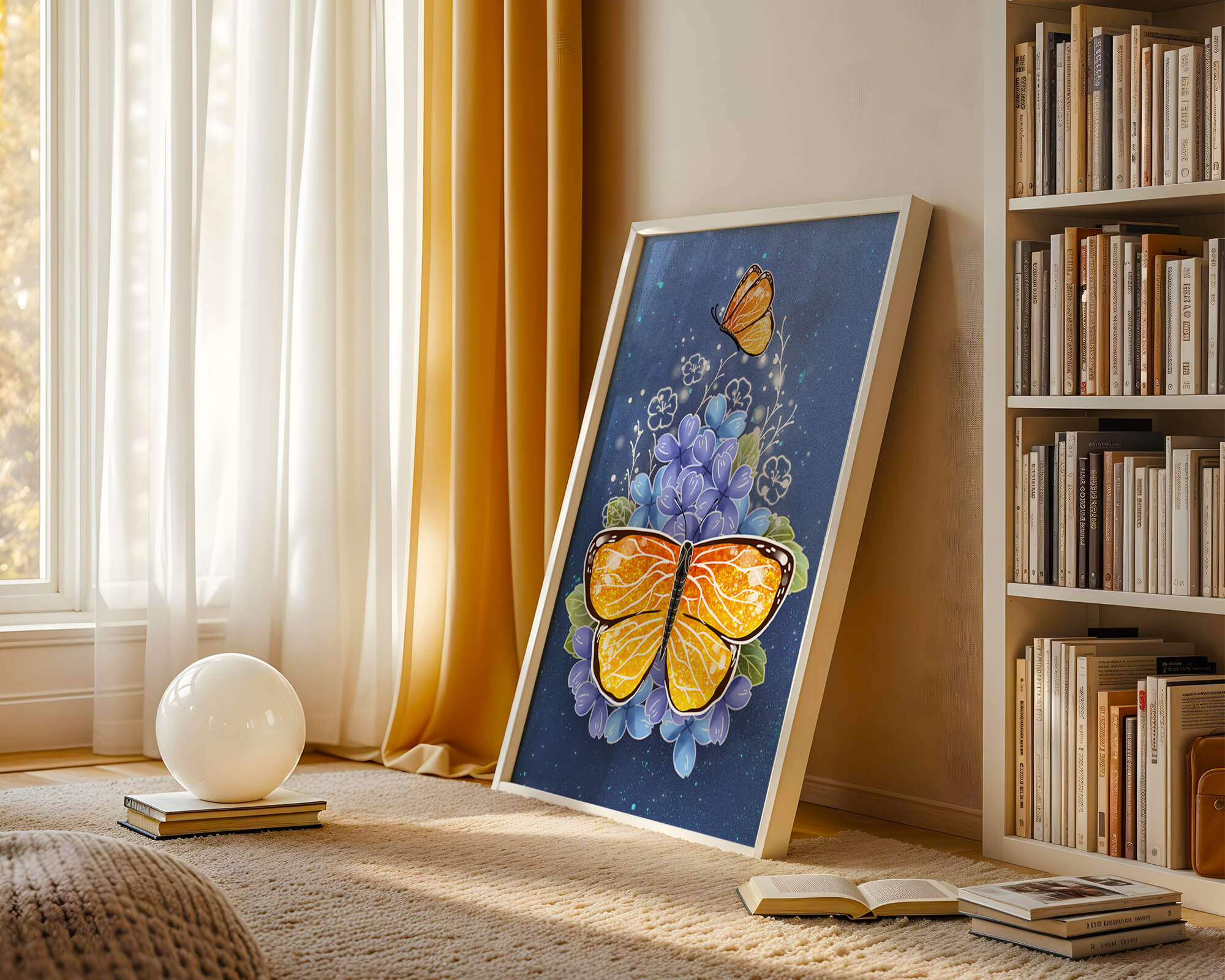 Эта иллюстрация прекрасно демонстрирует большую, живописную бабочку с светящимися оранжевыми и золотыми крыльями, грациозно расположенную над постелью ярких синих цветов. Каждый лепесток и лист детализирован с тщательностью, создавая гармоничную и живую сцену, которая запечатлевает сущность красоты природы. Фон, с мягкими синими оттенками, усиливает яркие цвета бабочки и цветов, заставляя изображение оживать. Нежное взаимодействие цветов и замысловатые детали предлагают визуальный спектакль, символизируя свободу и спокойствие природы. Идеально подходит для добавления яркости и прикосновения природы в любую комнату, это произведение искусства — отличный выбор для тех, кто хочет украсить свое жилое пространство с художественным изяществом. Независимо от того, будет ли это для гостиной, спальни или детской комнаты, эта работа приносит чувство удивления и спокойствия.