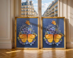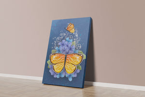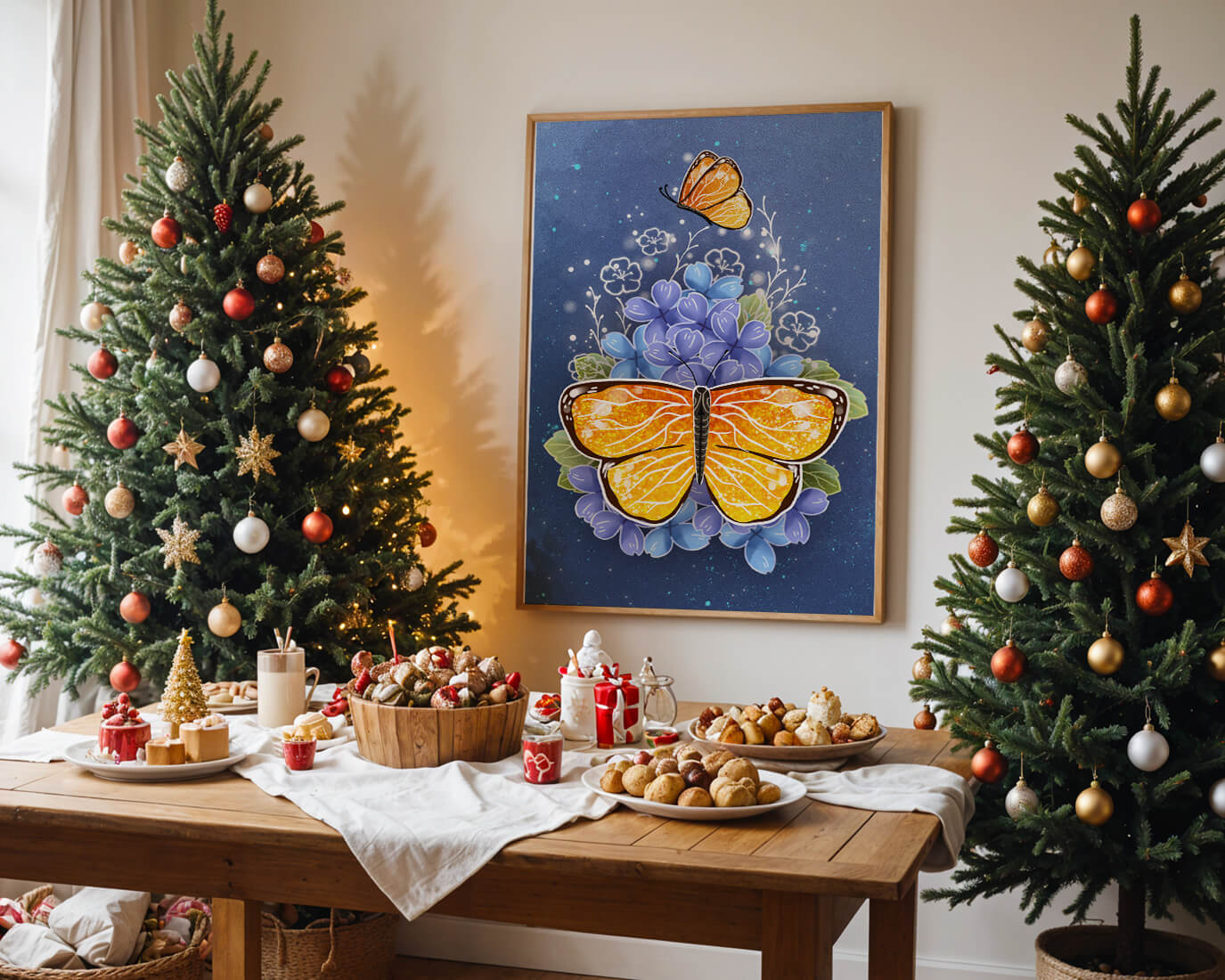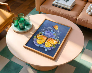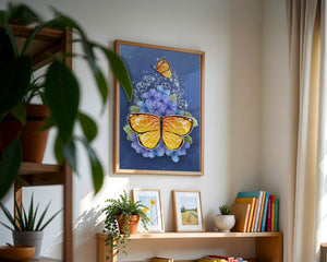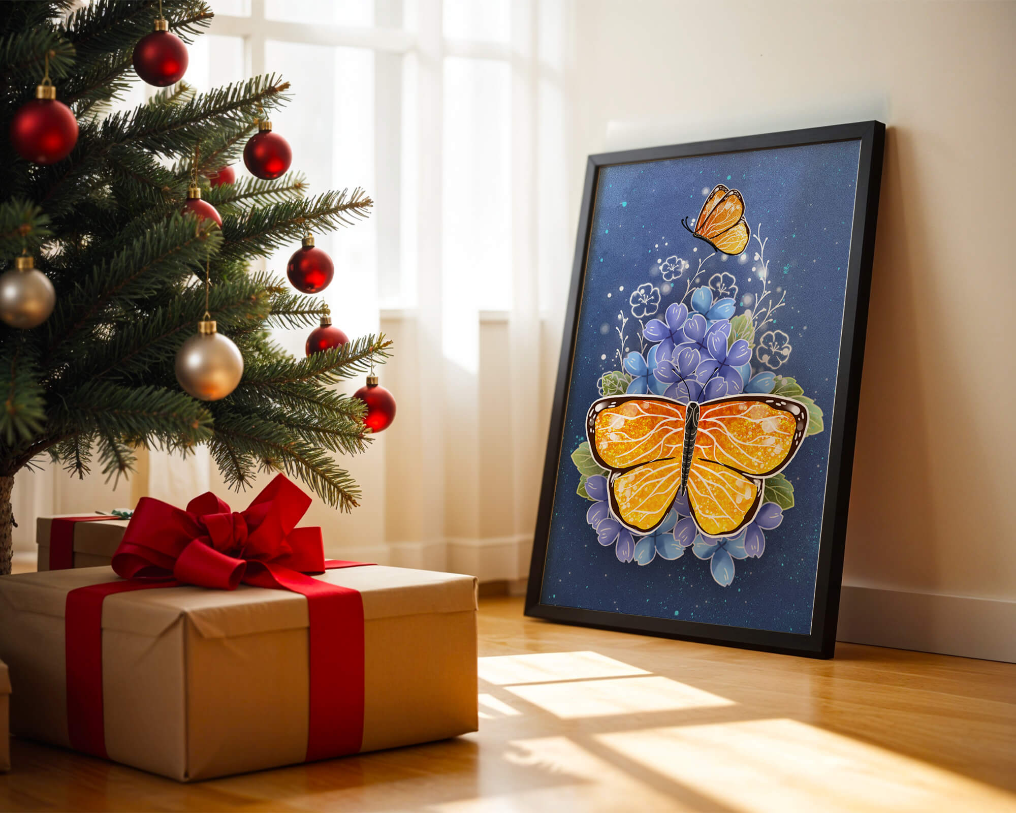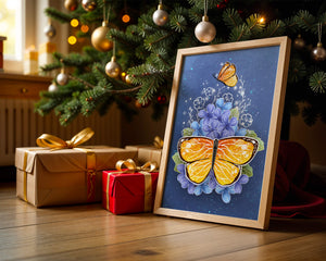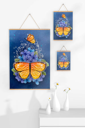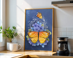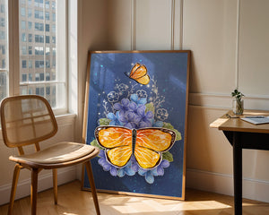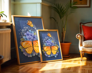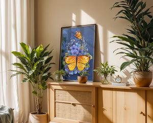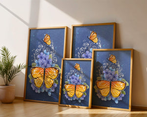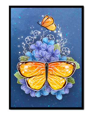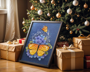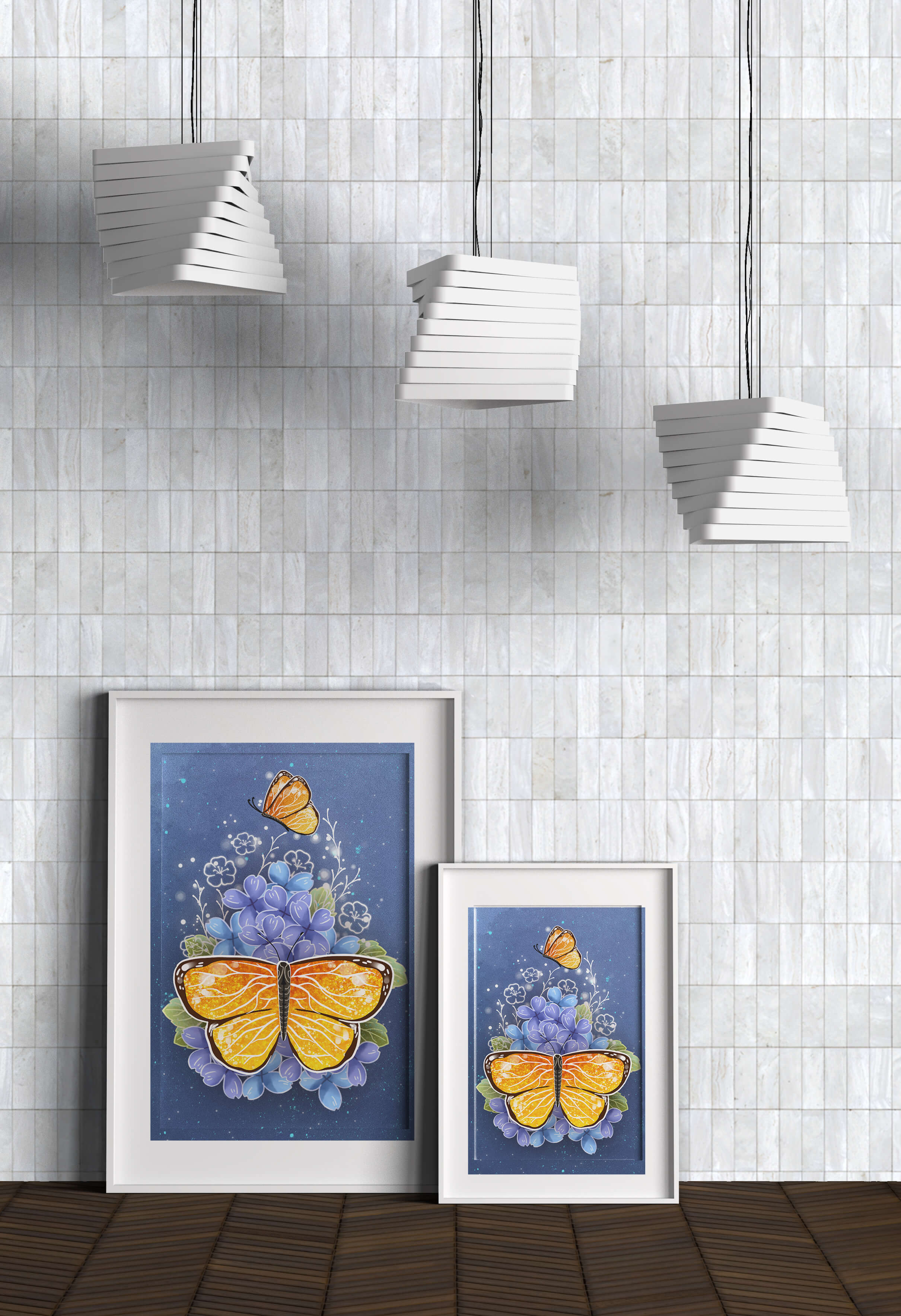 Эта иллюстрация прекрасно демонстрирует большую, живописную бабочку с светящимися оранжевыми и золотыми крыльями, грациозно расположенную над постелью ярких синих цветов. Каждый лепесток и лист детализирован с тщательностью, создавая гармоничную и живую сцену, которая запечатлевает сущность красоты природы. Фон, с мягкими синими оттенками, усиливает яркие цвета бабочки и цветов, заставляя изображение оживать. Нежное взаимодействие цветов и замысловатые детали предлагают визуальный спектакль, символизируя свободу и спокойствие природы. Идеально подходит для добавления яркости и прикосновения природы в любую комнату, это произведение искусства — отличный выбор для тех, кто хочет украсить свое жилое пространство с художественным изяществом. Независимо от того, будет ли это для гостиной, спальни или детской комнаты, эта работа приносит чувство удивления и спокойствия.