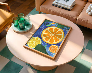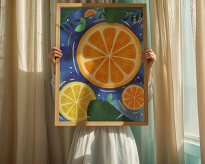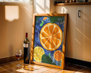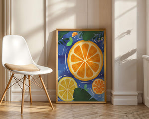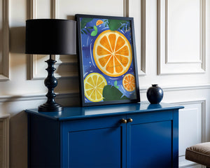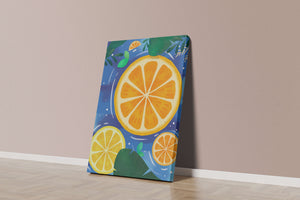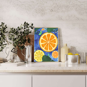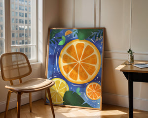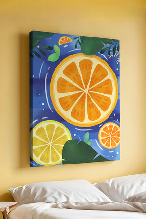 The artwork highlights a playful arrangement of citrus fruits, represented in a mix of orange and lemon slices. The use of bold colors gives the image a fresh and energetic vibe. The backdrop of deep blue accentuates the vividness of the fruit, making it a focal point of any room.