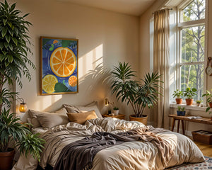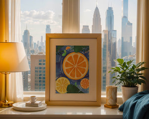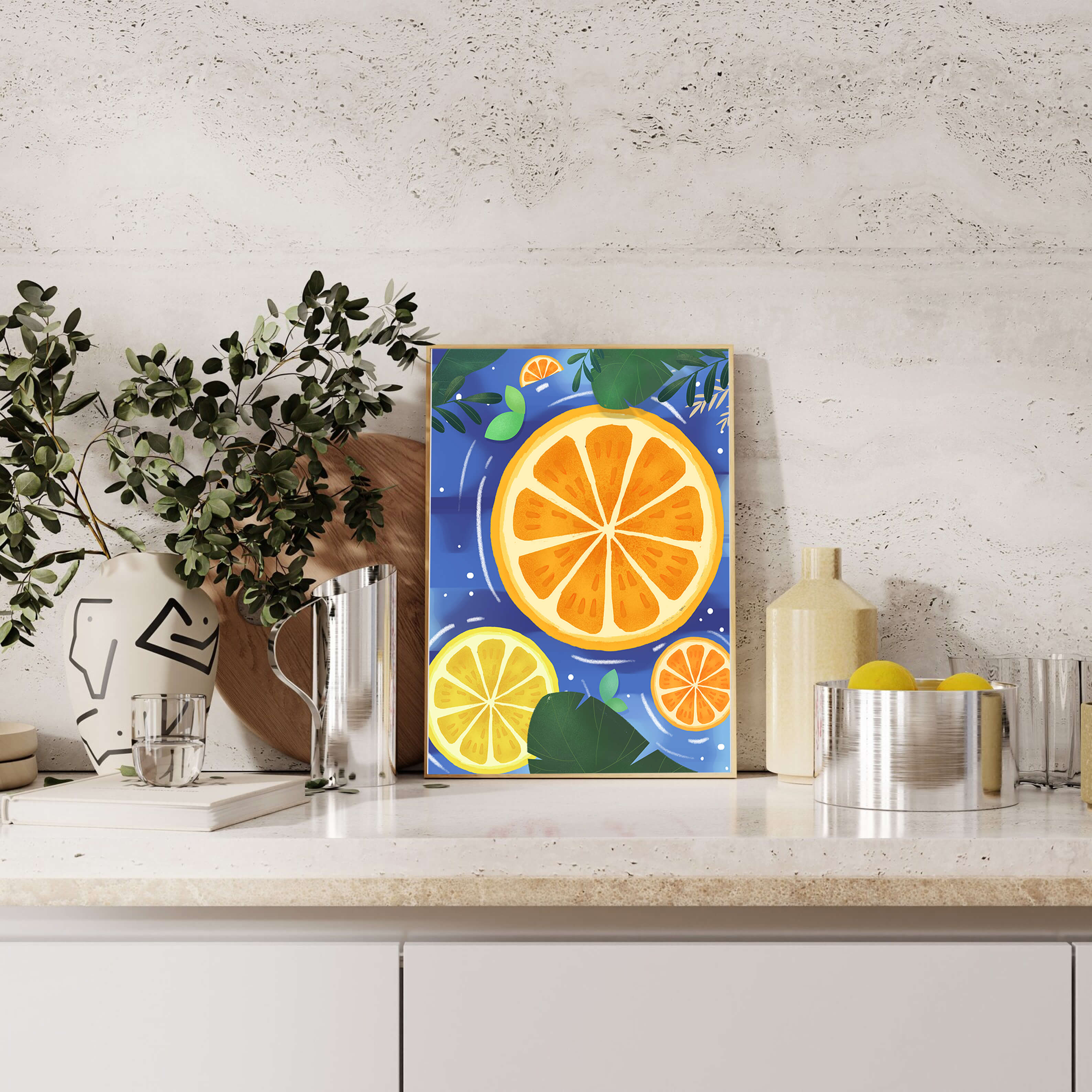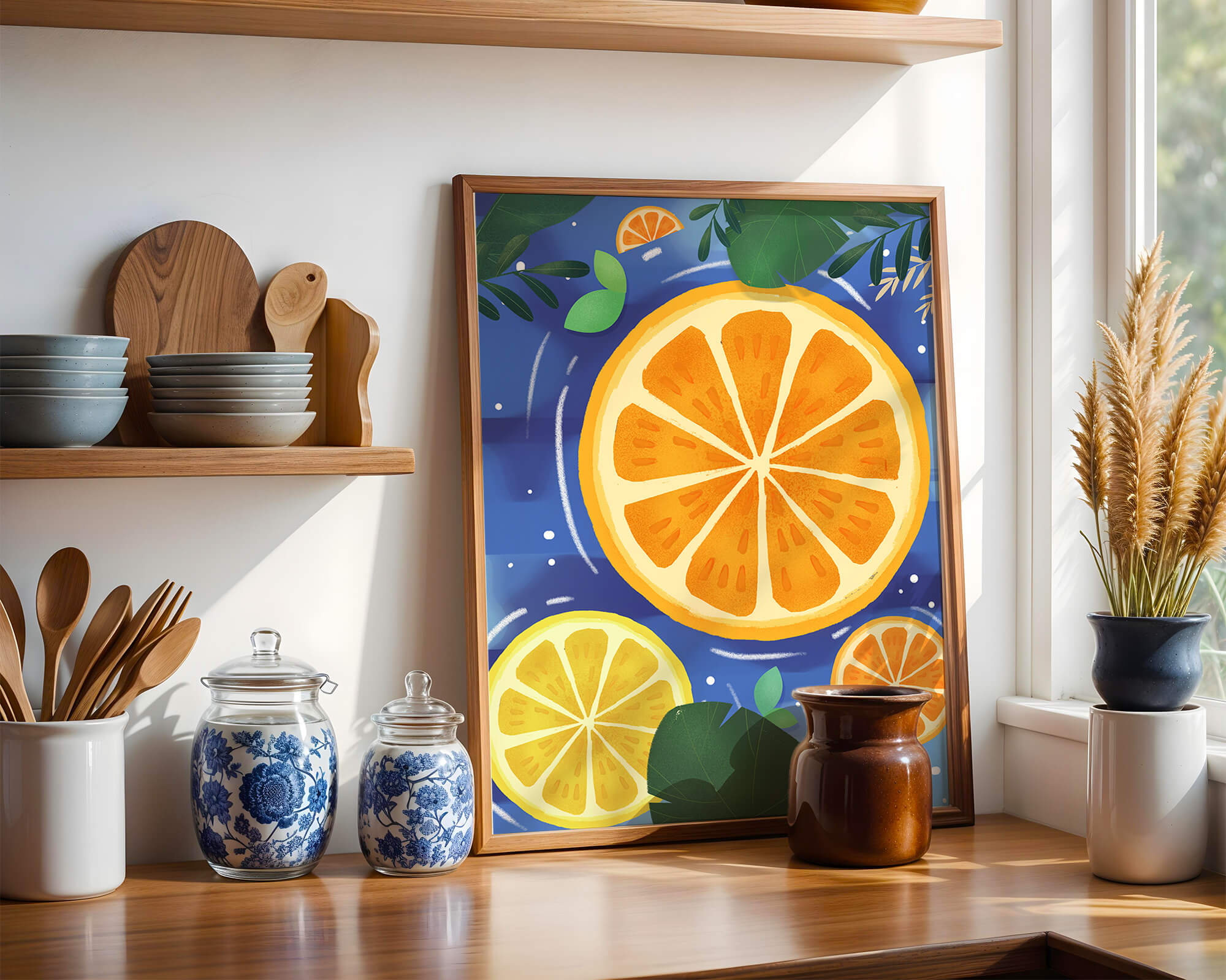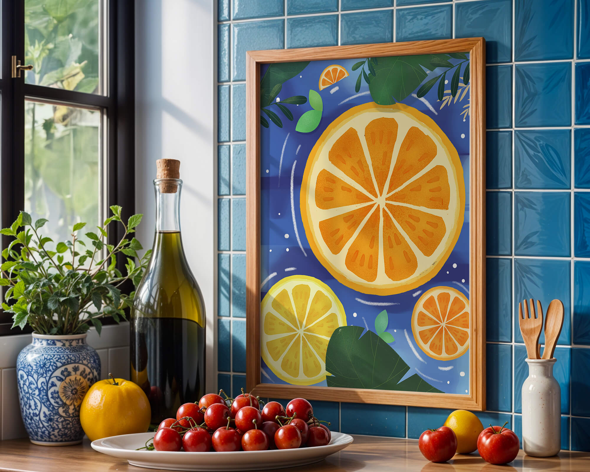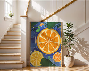 This vibrant illustration features a collection of colorful citrus slices—including oranges and lemons—against a vivid blue background. Tropical leaves add a refreshing touch, creating a lively and fresh composition perfect for any space.