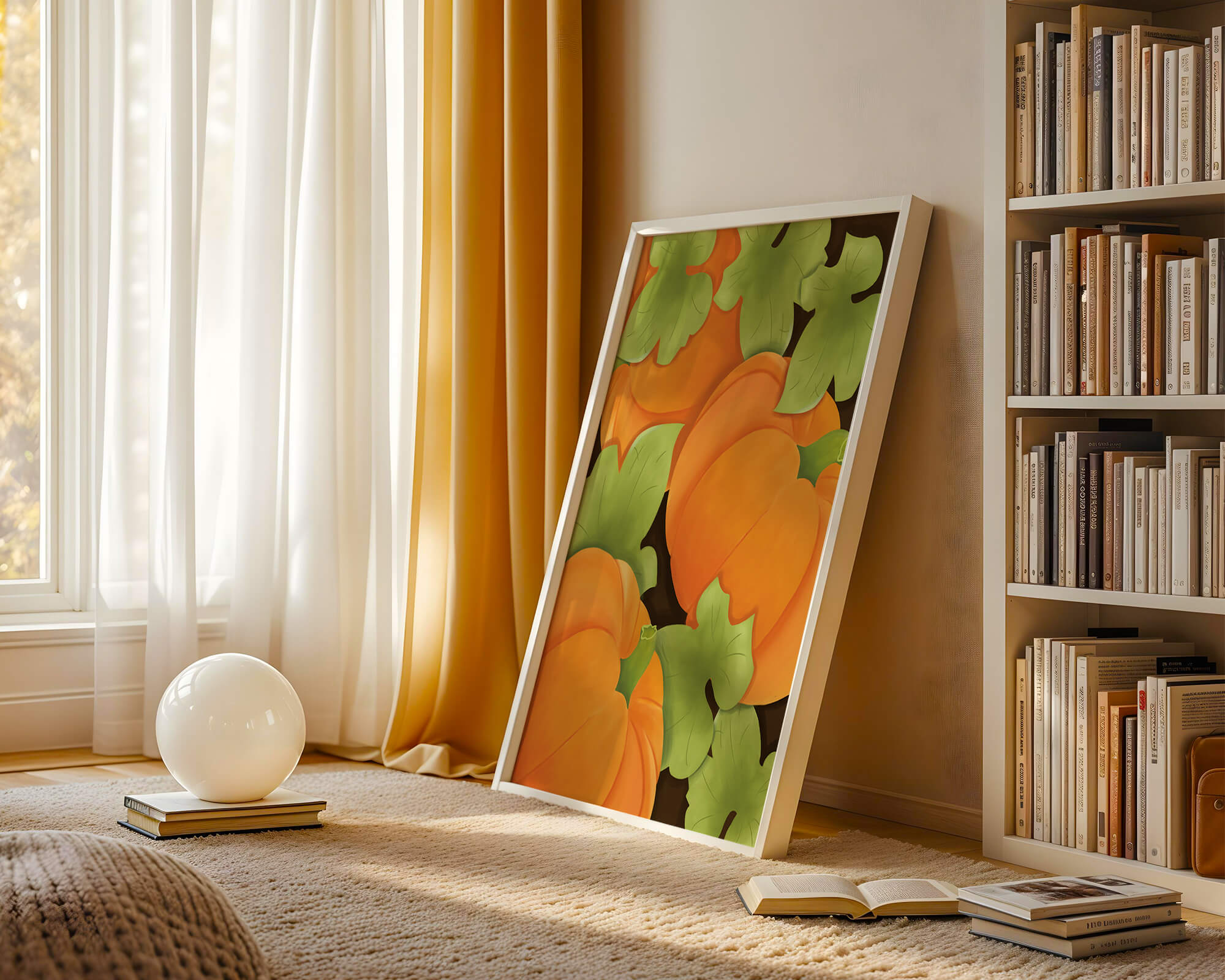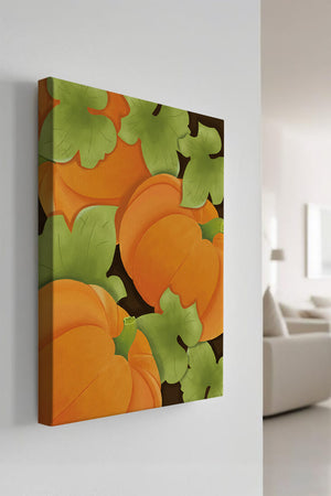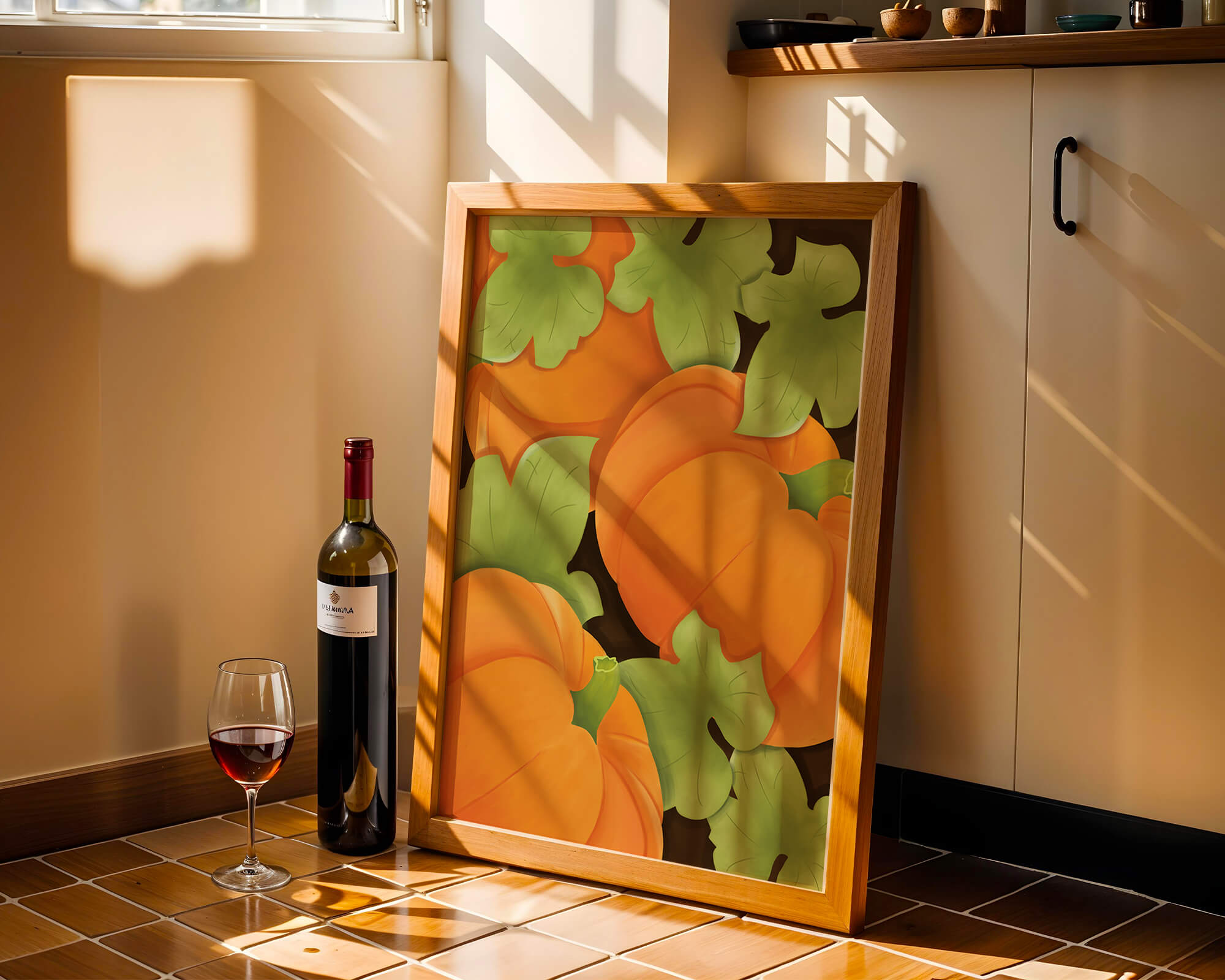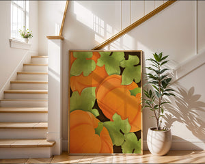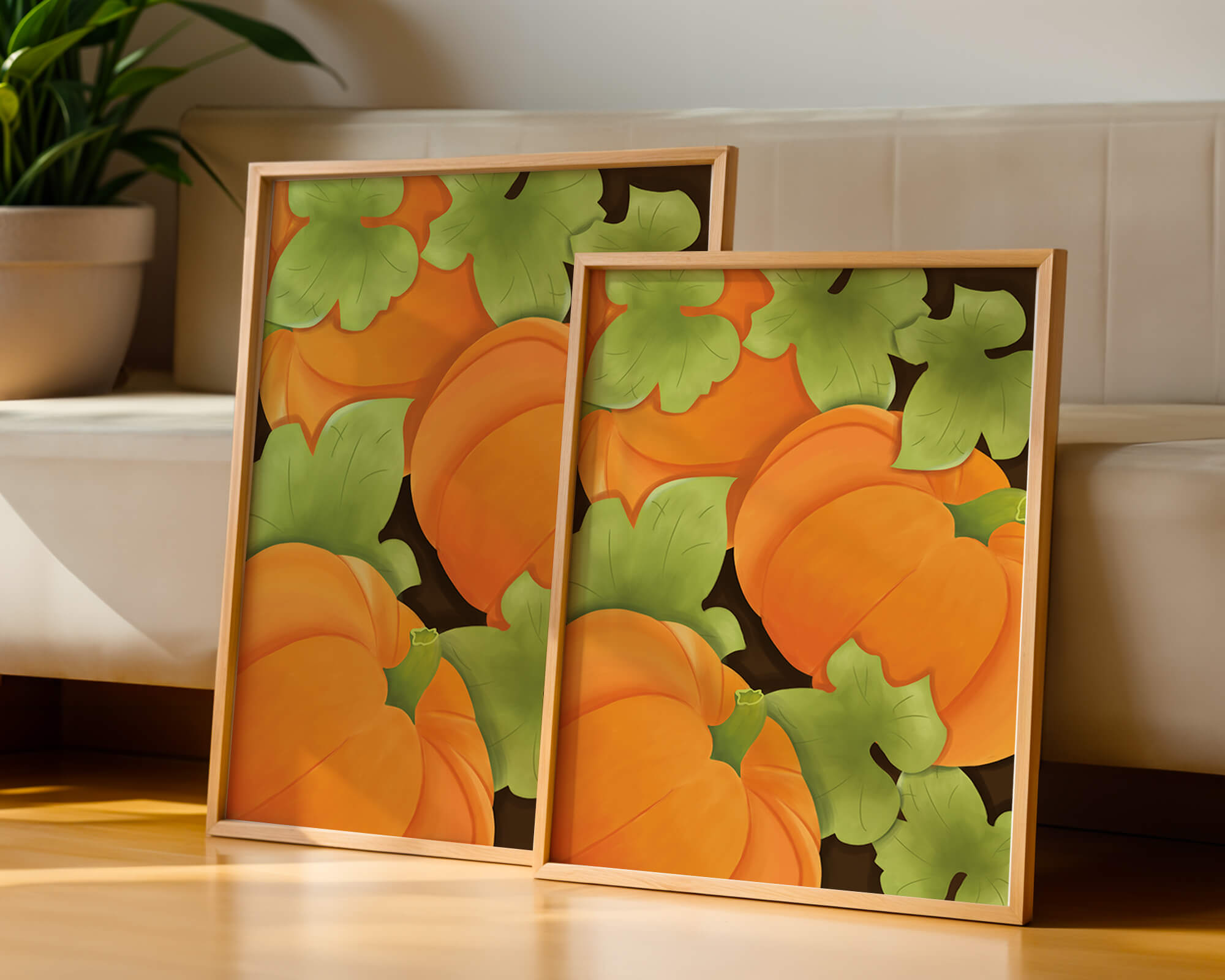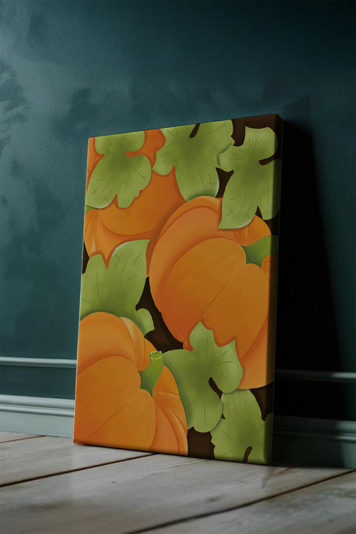 With its lively depiction of pumpkins and foliage, the image is perfect for embracing the warmth and colors of autumn. The combination of the vivid orange pumpkins and lush green leaves brings a touch of nature into any space, making it an ideal choice for seasonal decoration. Whether youre looking to enhance your home decor for Thanksgiving or simply want to create a cozy and rustic atmosphere, this design highlights the natural beauty of the season. Its intricate pattern can modernize any setting while maintaining a connection to the outdoors, making it a versatile choice for various decorative themes.