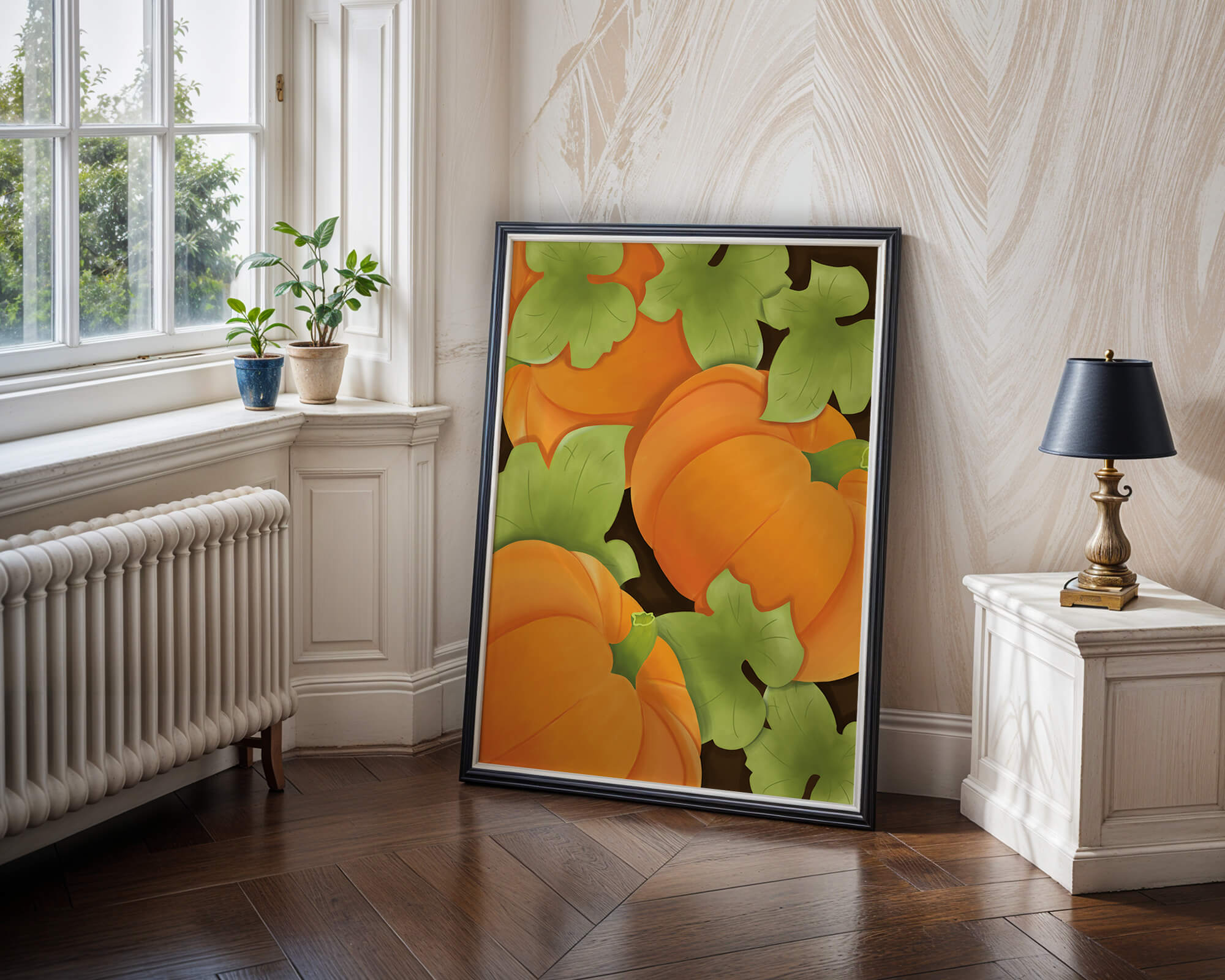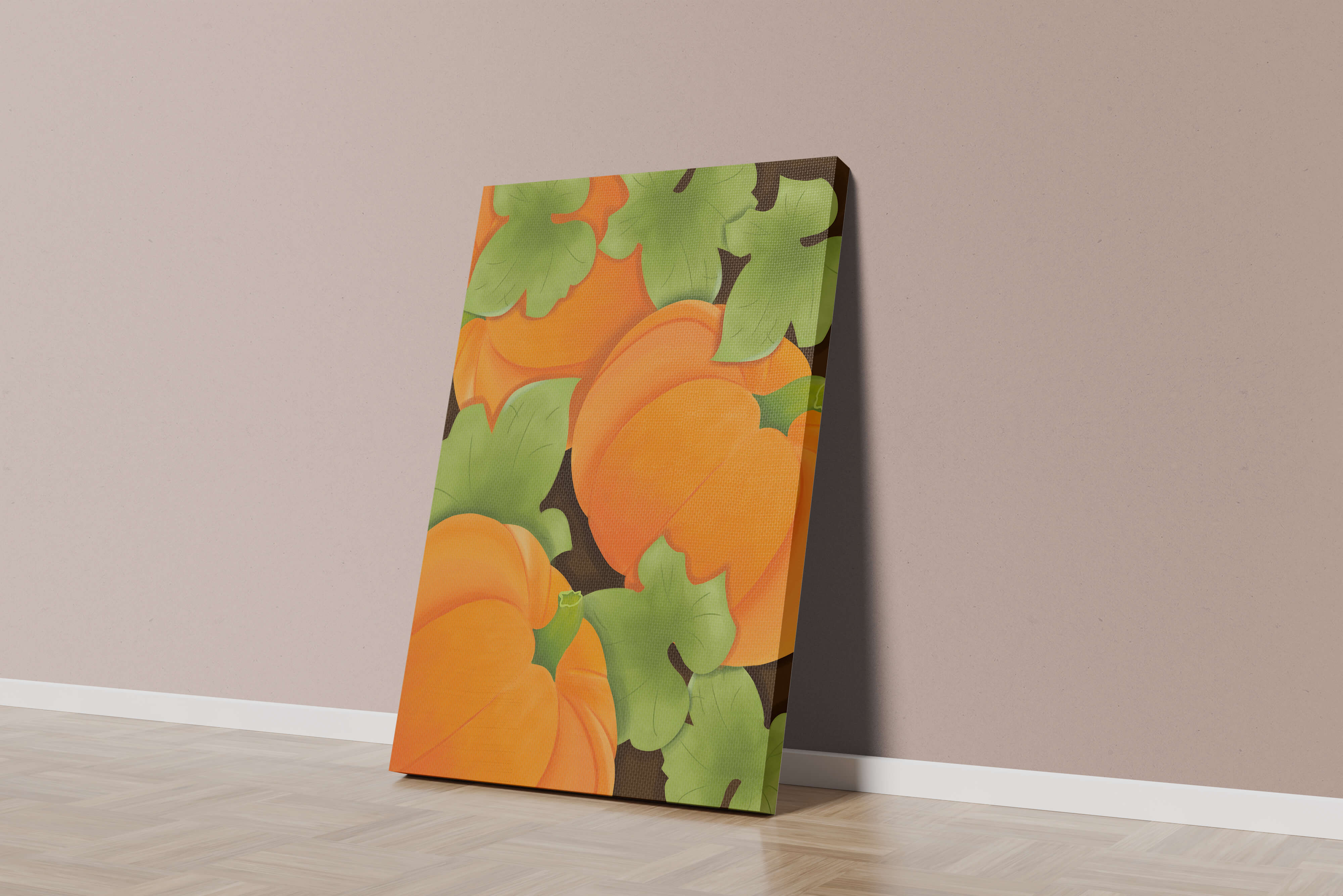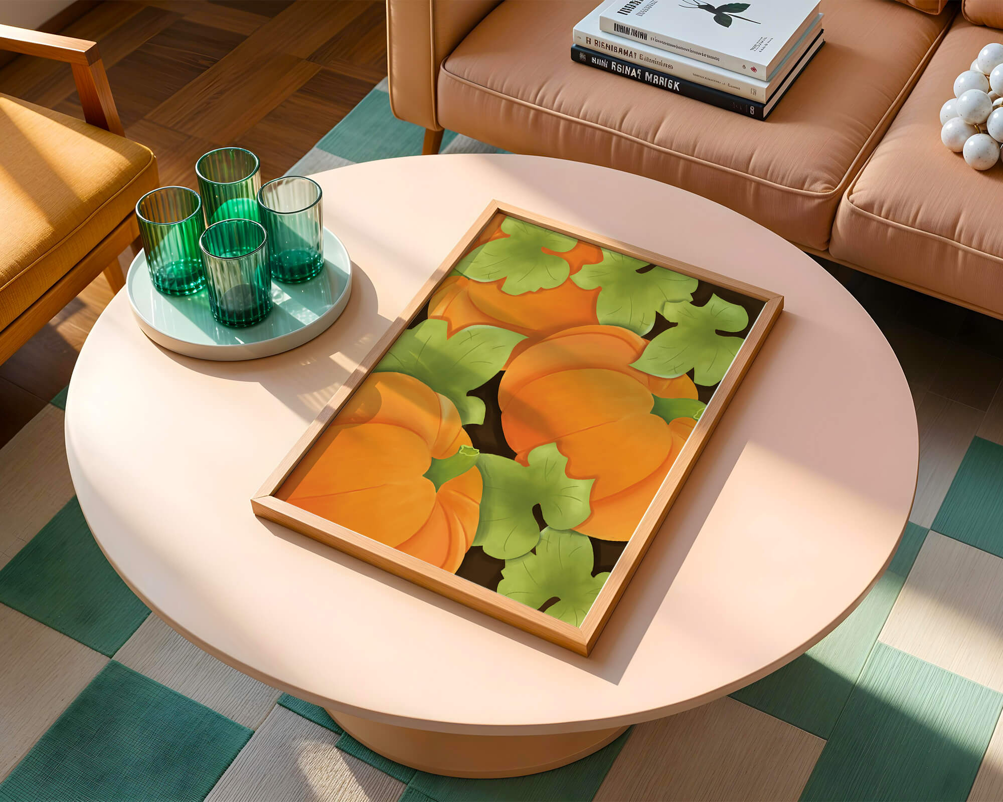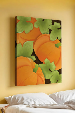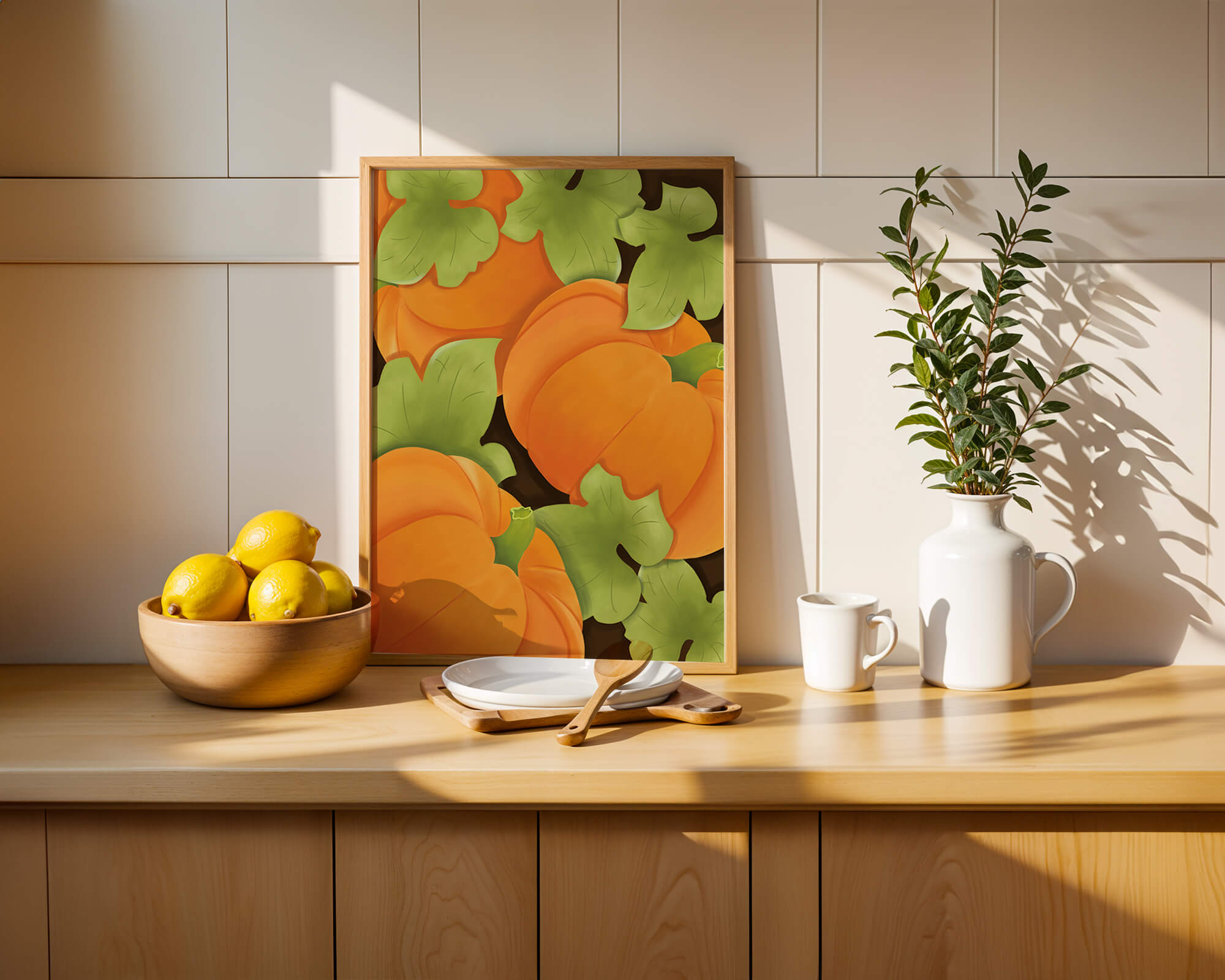 With its lively depiction of pumpkins and foliage, the image is perfect for embracing the warmth and colors of autumn. The combination of the vivid orange pumpkins and lush green leaves brings a touch of nature into any space, making it an ideal choice for seasonal decoration. Whether youre looking to enhance your home decor for Thanksgiving or simply want to create a cozy and rustic atmosphere, this design highlights the natural beauty of the season. Its intricate pattern can modernize any setting while maintaining a connection to the outdoors, making it a versatile choice for various decorative themes.