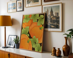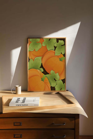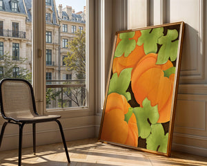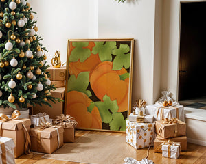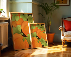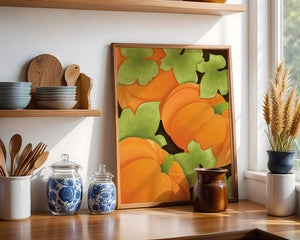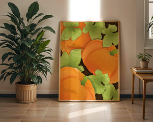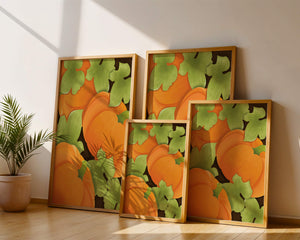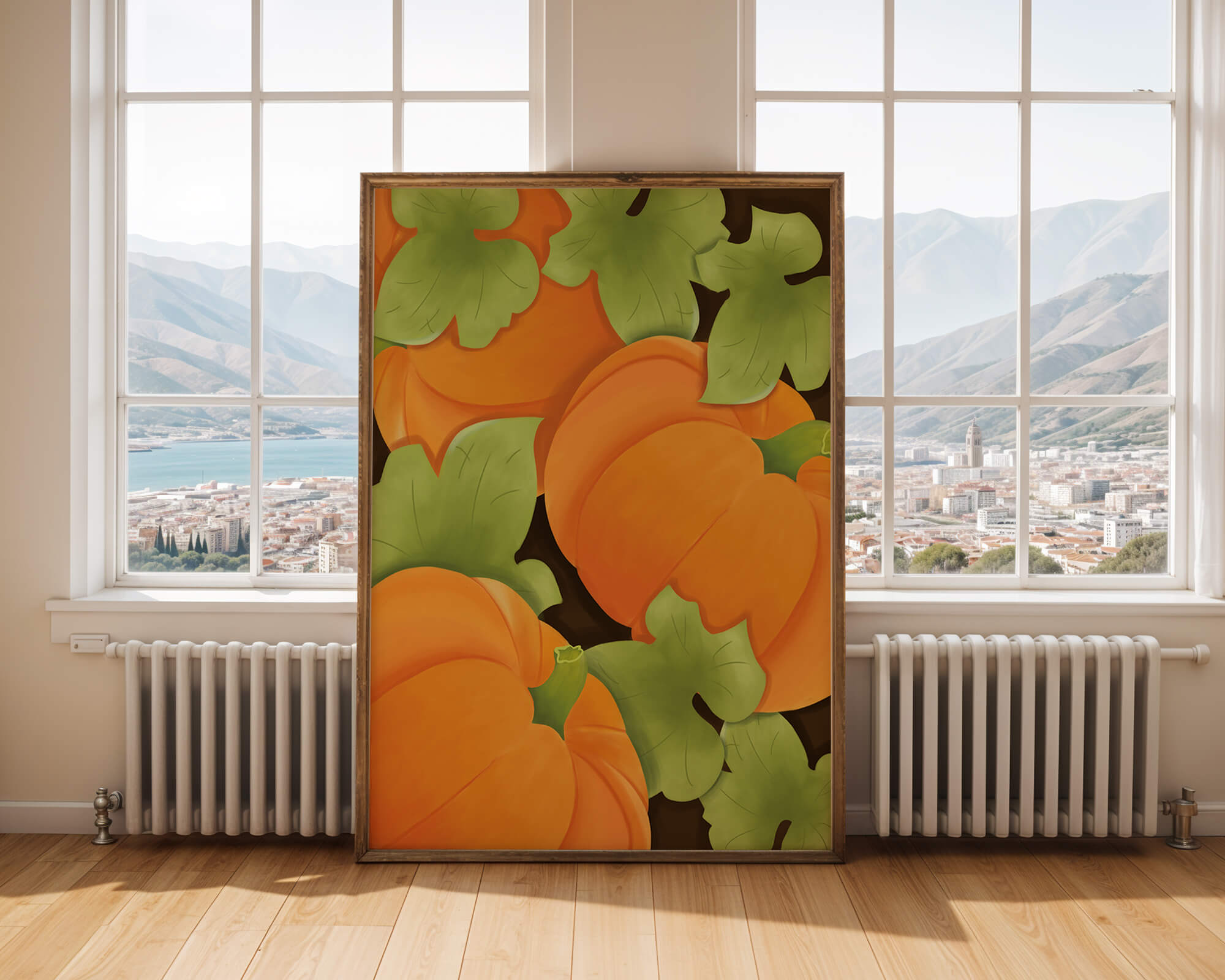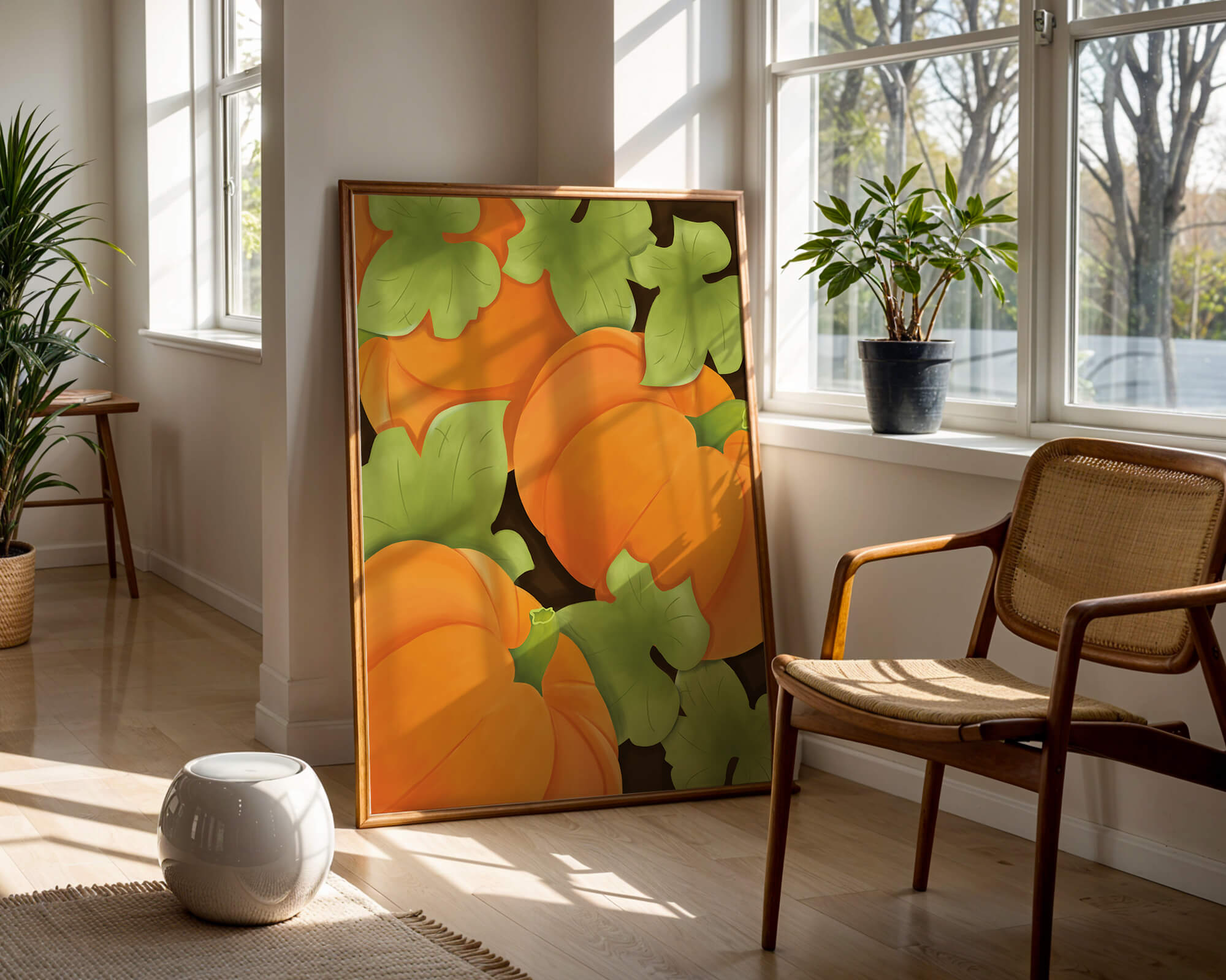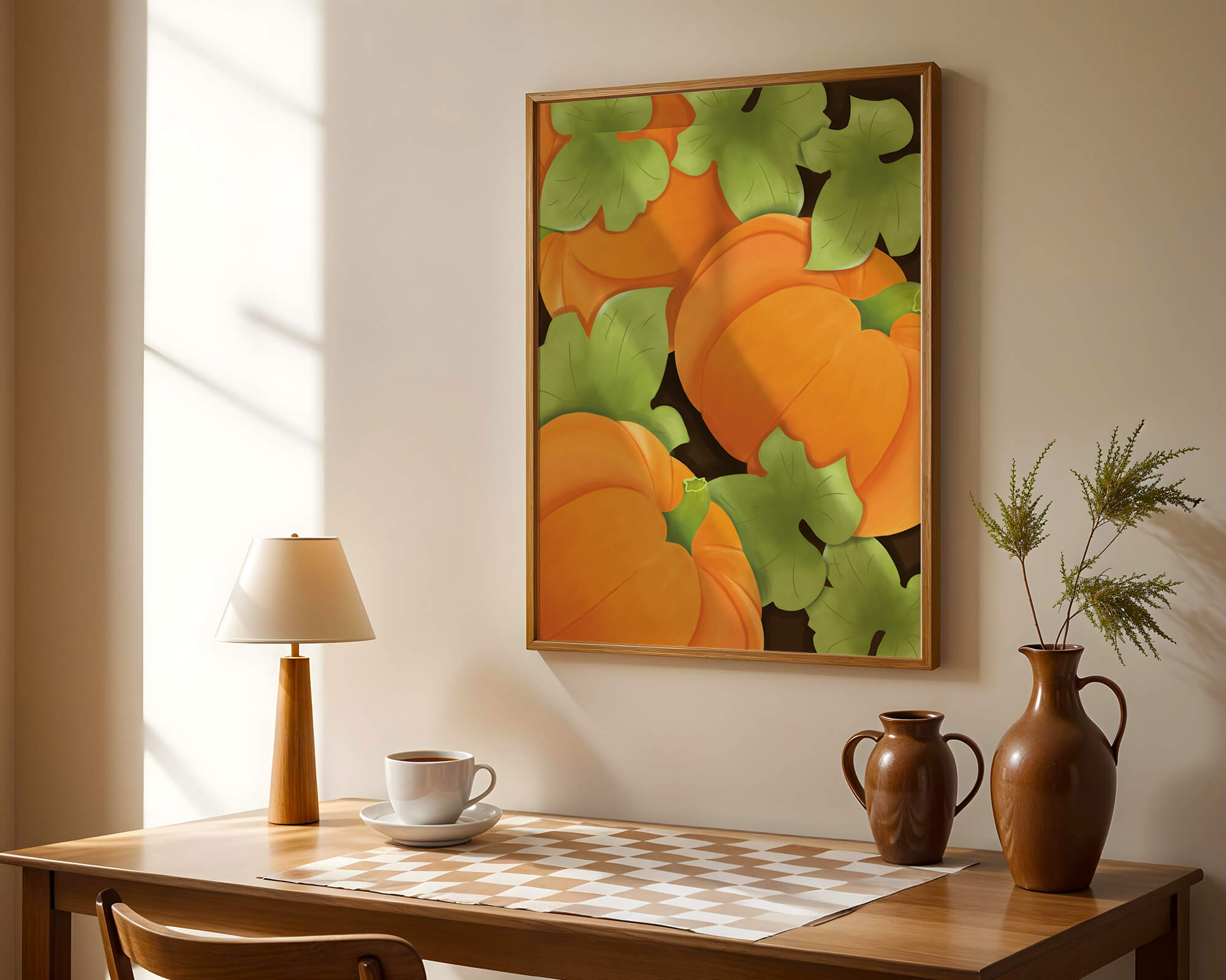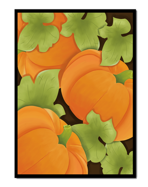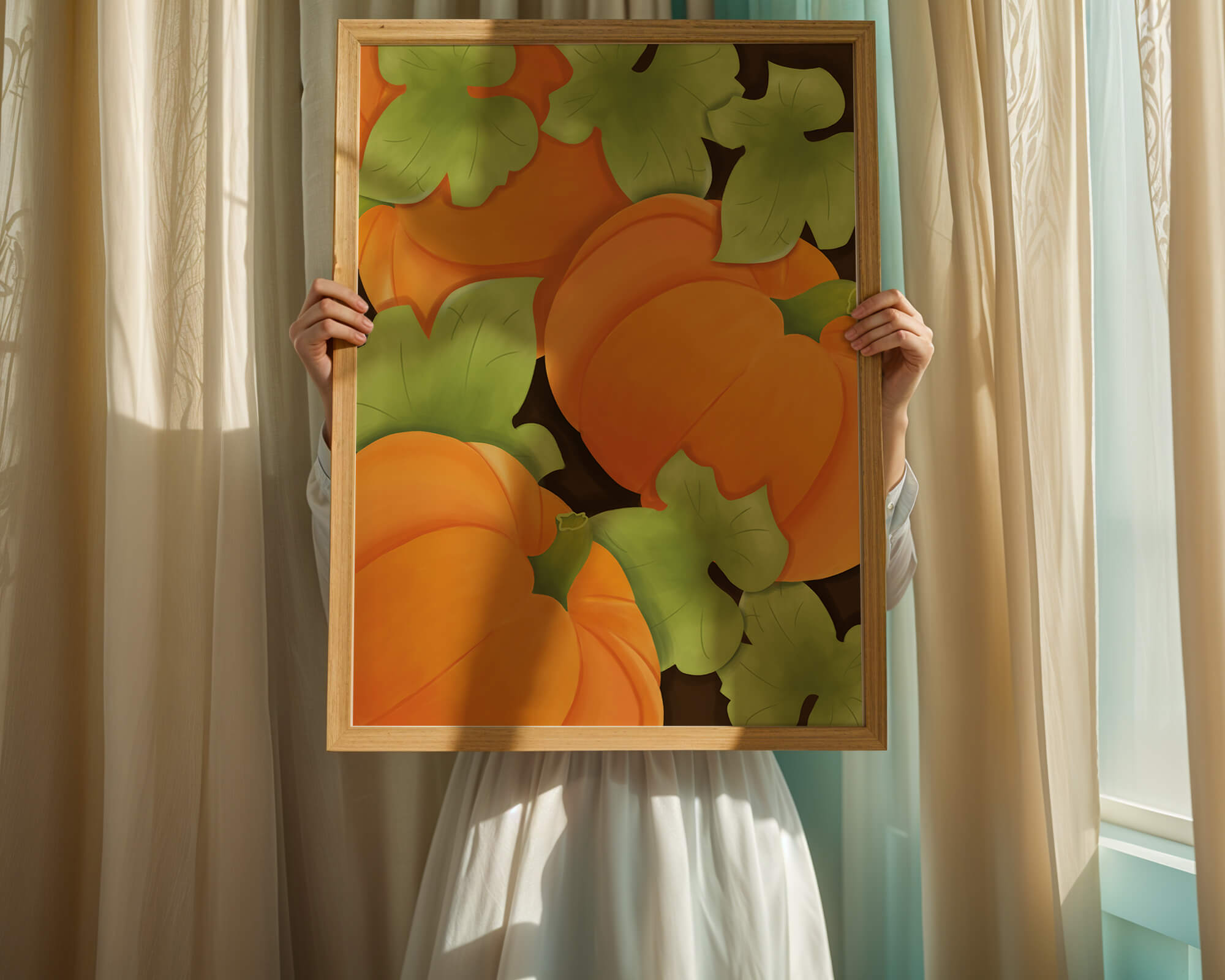 With its lively depiction of pumpkins and foliage, the image is perfect for embracing the warmth and colors of autumn. The combination of the vivid orange pumpkins and lush green leaves brings a touch of nature into any space, making it an ideal choice for seasonal decoration. Whether youre looking to enhance your home decor for Thanksgiving or simply want to create a cozy and rustic atmosphere, this design highlights the natural beauty of the season. Its intricate pattern can modernize any setting while maintaining a connection to the outdoors, making it a versatile choice for various decorative themes.