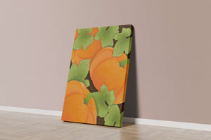 The image beautifully showcases a repeating pattern of bright orange pumpkins adorned with green leaves set against a dark background. This vibrant and festive design captures the essence of the fall season, symbolizing harvest time and Thanksgiving celebrations.