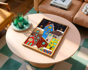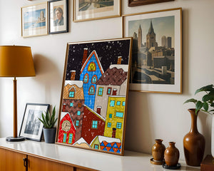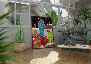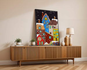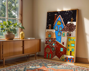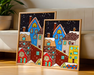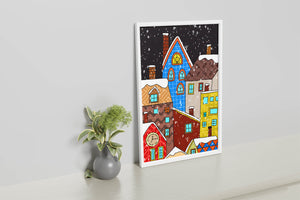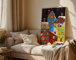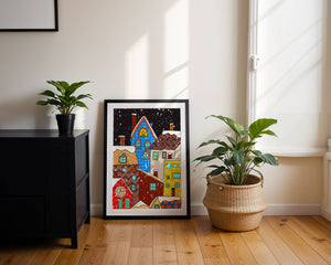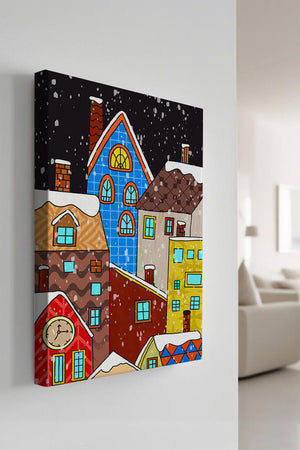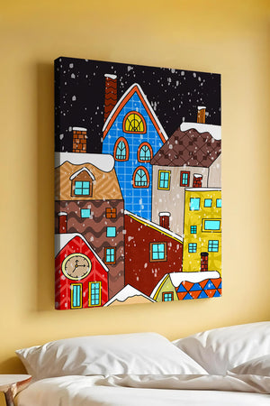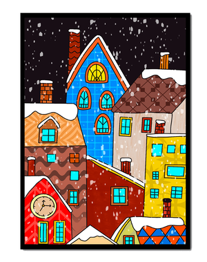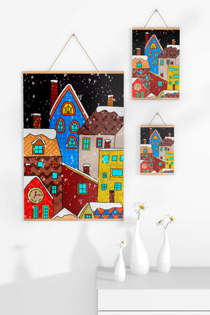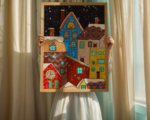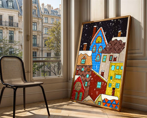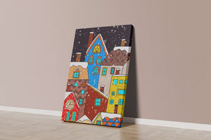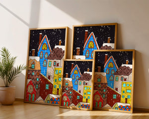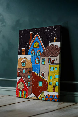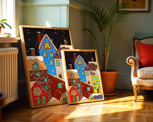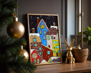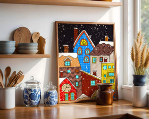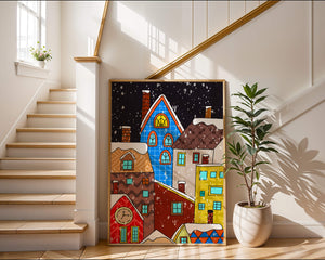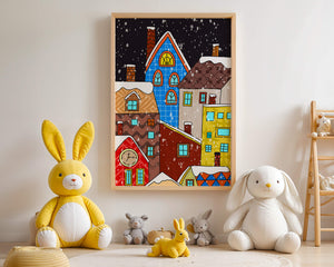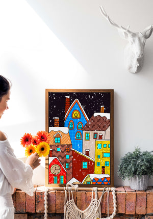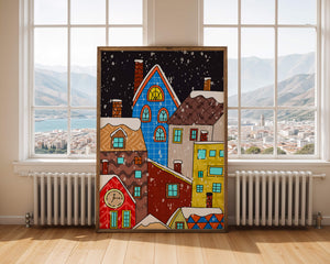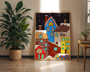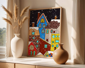 Изображение демонстрирует ряд ярких домов, их светлые фасады выглядывают сквозь густой снегопад. Каждое здание имеет уникальный архитектурный дизайн, добавляя игривости сцене. Синий дом в центре с большими окнами и дымоходом привлекает взгляд и дополняет окружающие строения своим веселым присутствием. Снежинки мягко падают на фоне темного ночного неба, подчеркивая уютную зимнюю атмосферу сцены. Эта восхитительная иллюстрация приносит ощущение тепла и очарования, идеально подходящая для добавления праздничного акцента в декор любой комнаты.