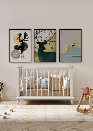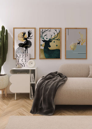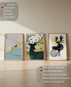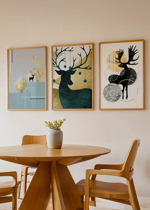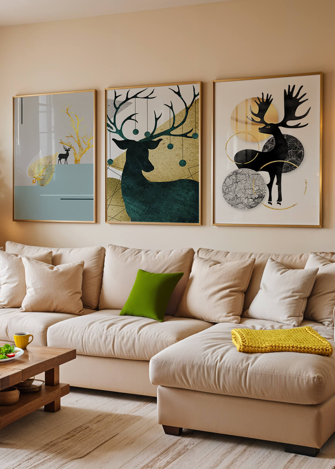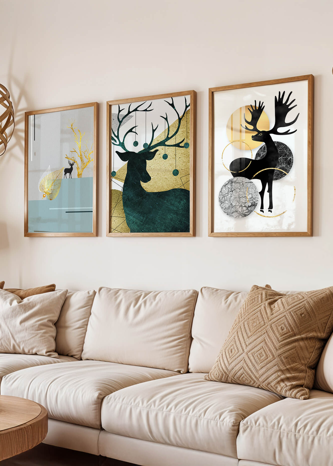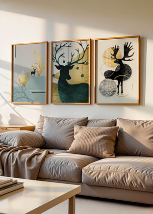 En este conjunto, tres cuadros se unen armoniosamente en una composición visual que destaca por su minimalismo y elegancia. La figura central de cada cuadro es un ciervo estilizado, presentado de forma abstracta y realzada con elementos dorados que aportan un toque de lujo. Cada imagen utiliza una paleta de colores cuidadosamente seleccionada, predominando los tonos tierra y oro sobre fondos que sugieren un ambiente natural y sereno. Este conjunto es ideal para quienes buscan añadir un toque de sofisticación y estilo a su sala de estar o cualquier otro espacio del hogar.