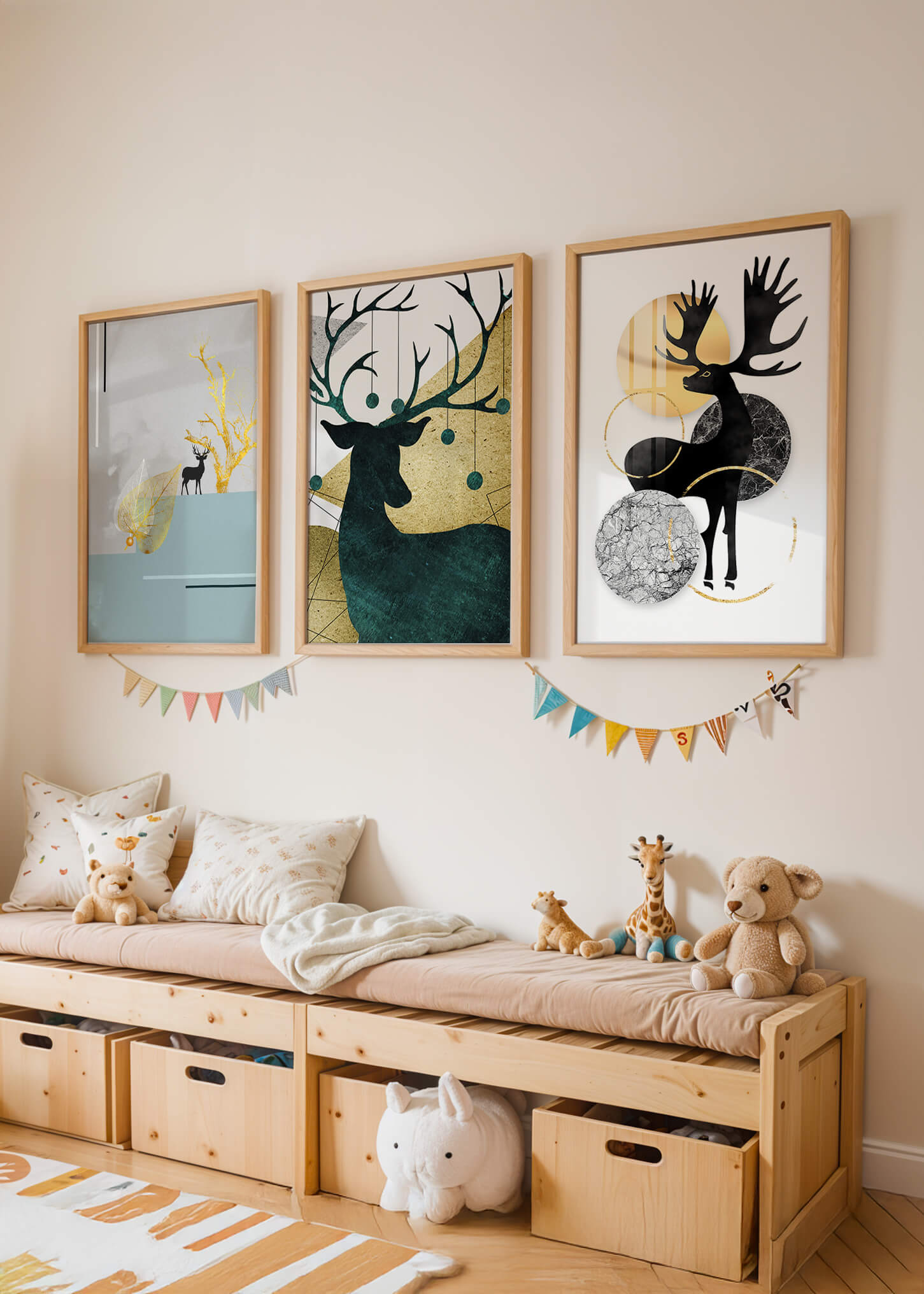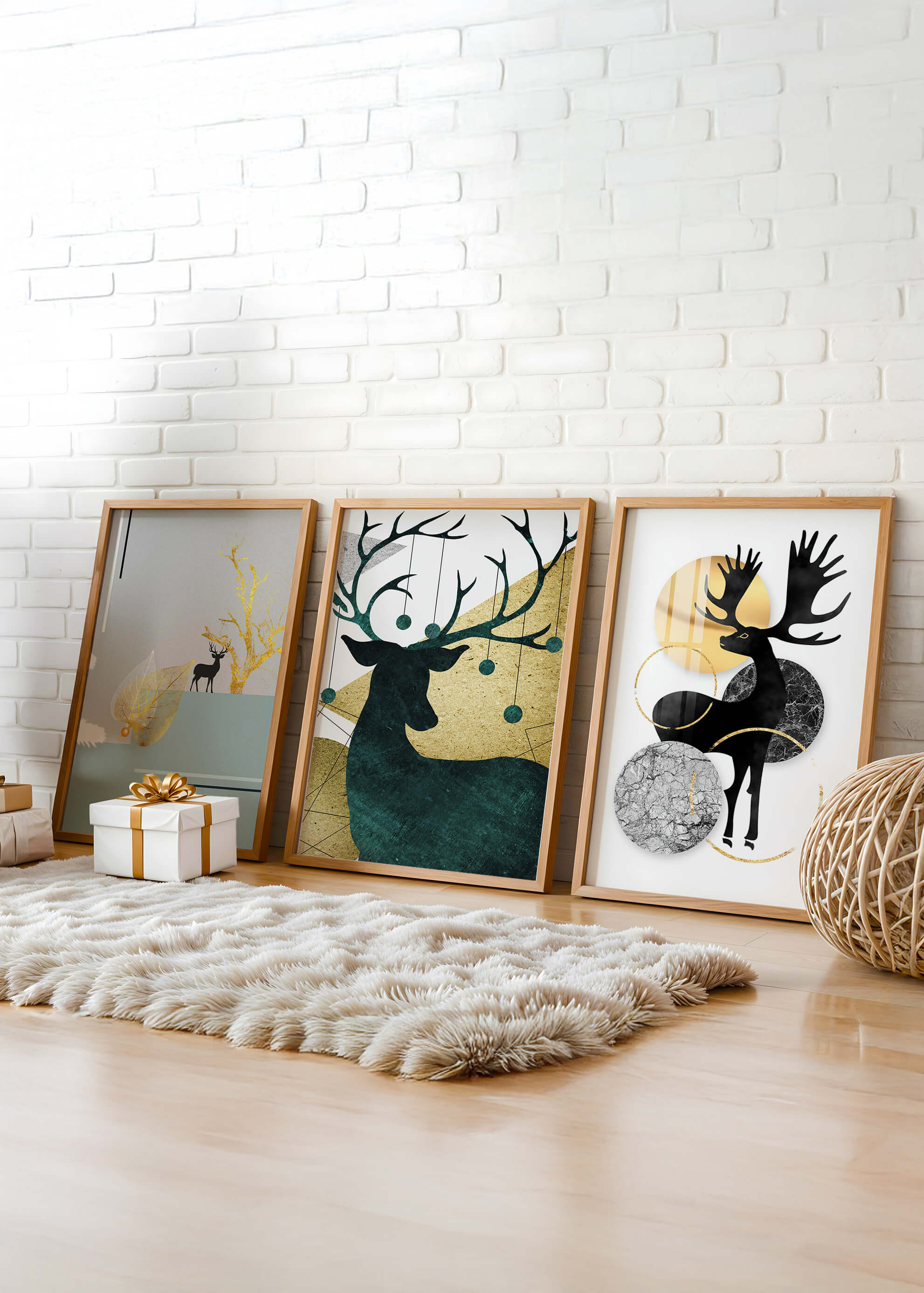 Conjunto De Cuadros De Ciervos Con Detalles Dorados