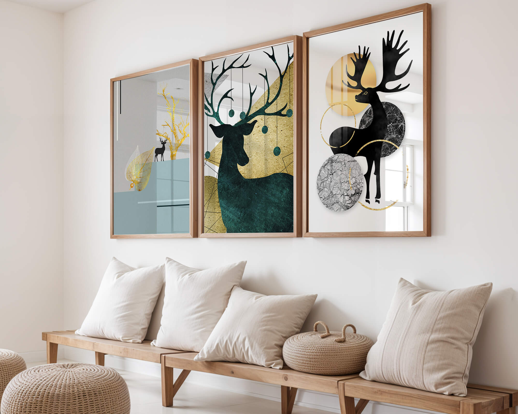 Home Conjunto De Cuadros De Ciervos Con Detalles Dorados