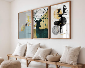Este conjunto de cuadros presenta elegantes imágenes de ciervos, cada uno con un enfoque artístico moderno que incorpora detalles dorados y patrones geométricos. Estas obras constituyen una opción sofisticada para decorar cualquier espacio, imbuyéndolo de un ambiente contemporáneo y tranquilo.