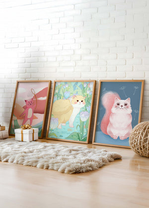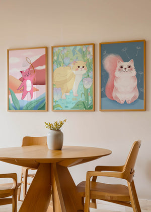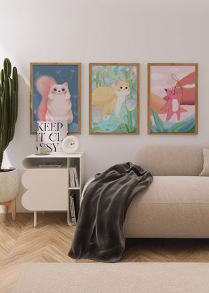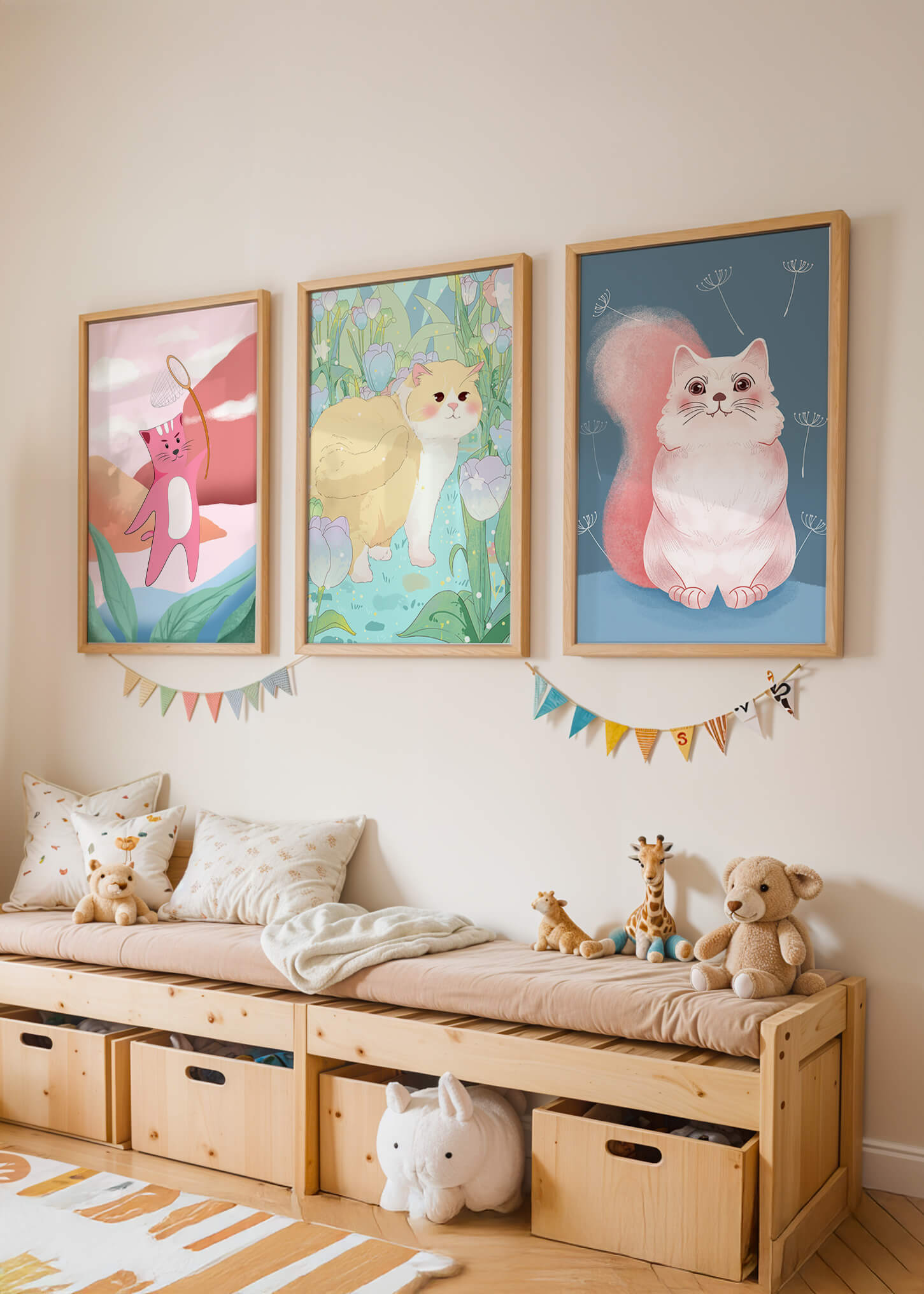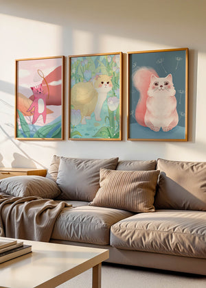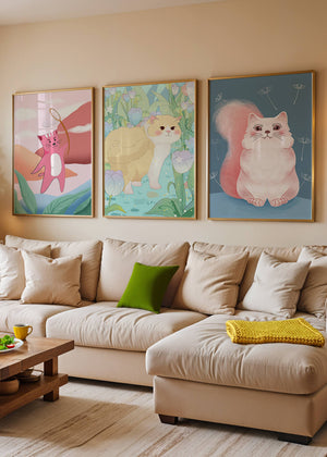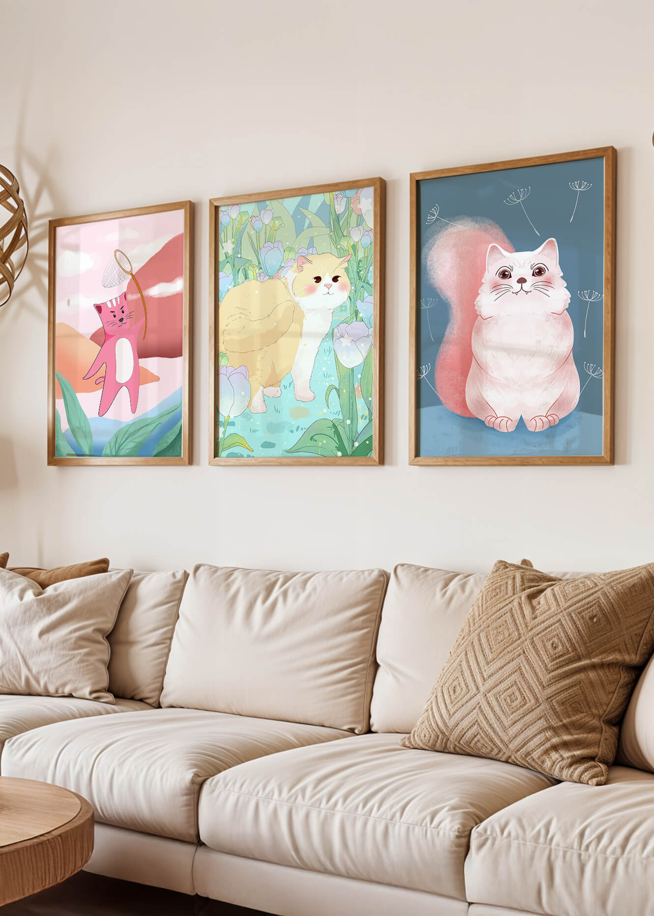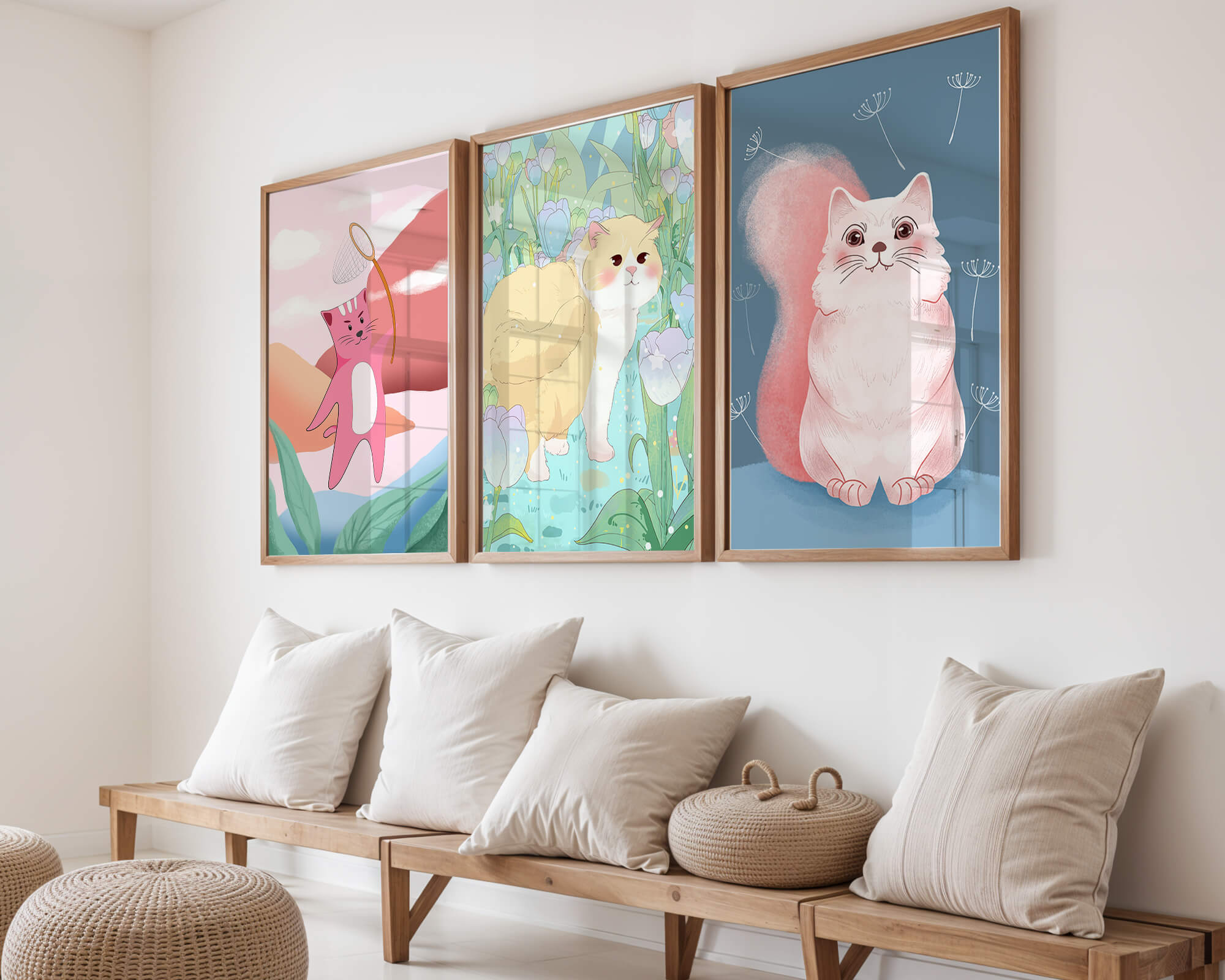 Este conjunto de obras artísticas exhibe tres ilustraciones diferentes de gatos, mostrando su belleza y personalidad en formas creativas. Las imágenes están llenas de color y detalle, transmitiendo un sentido de alegría y sofisticación. Cada pieza está cuidadosamente diseñada para integrarse sin esfuerzo en la decoración de interiores, añadiendo un carácter llamativo y contemporáneo a cualquier habitación. La calidad superior de impresión resalta los tonos ricos y las texturas detalladas de cada ilustración.| Type |