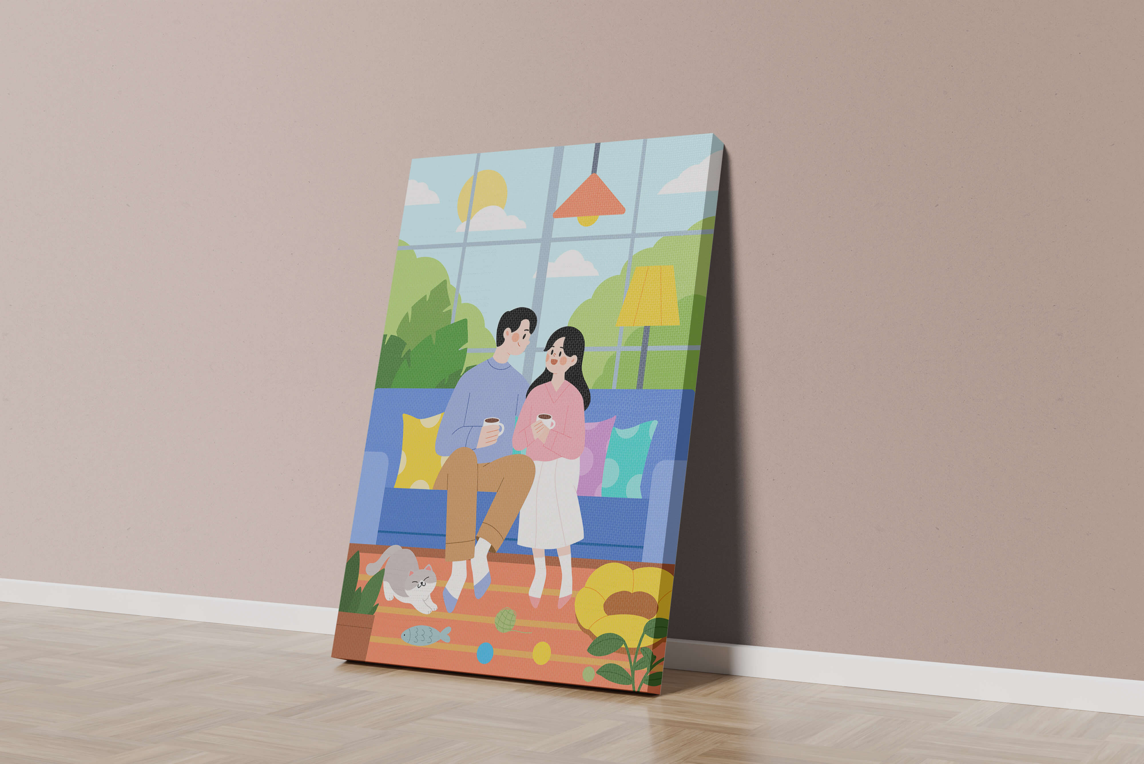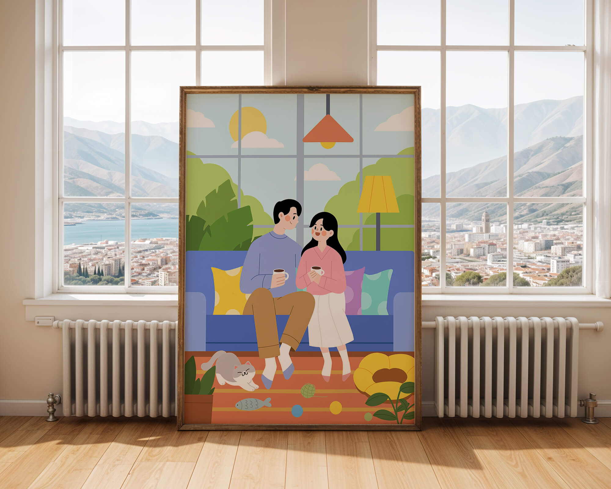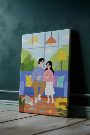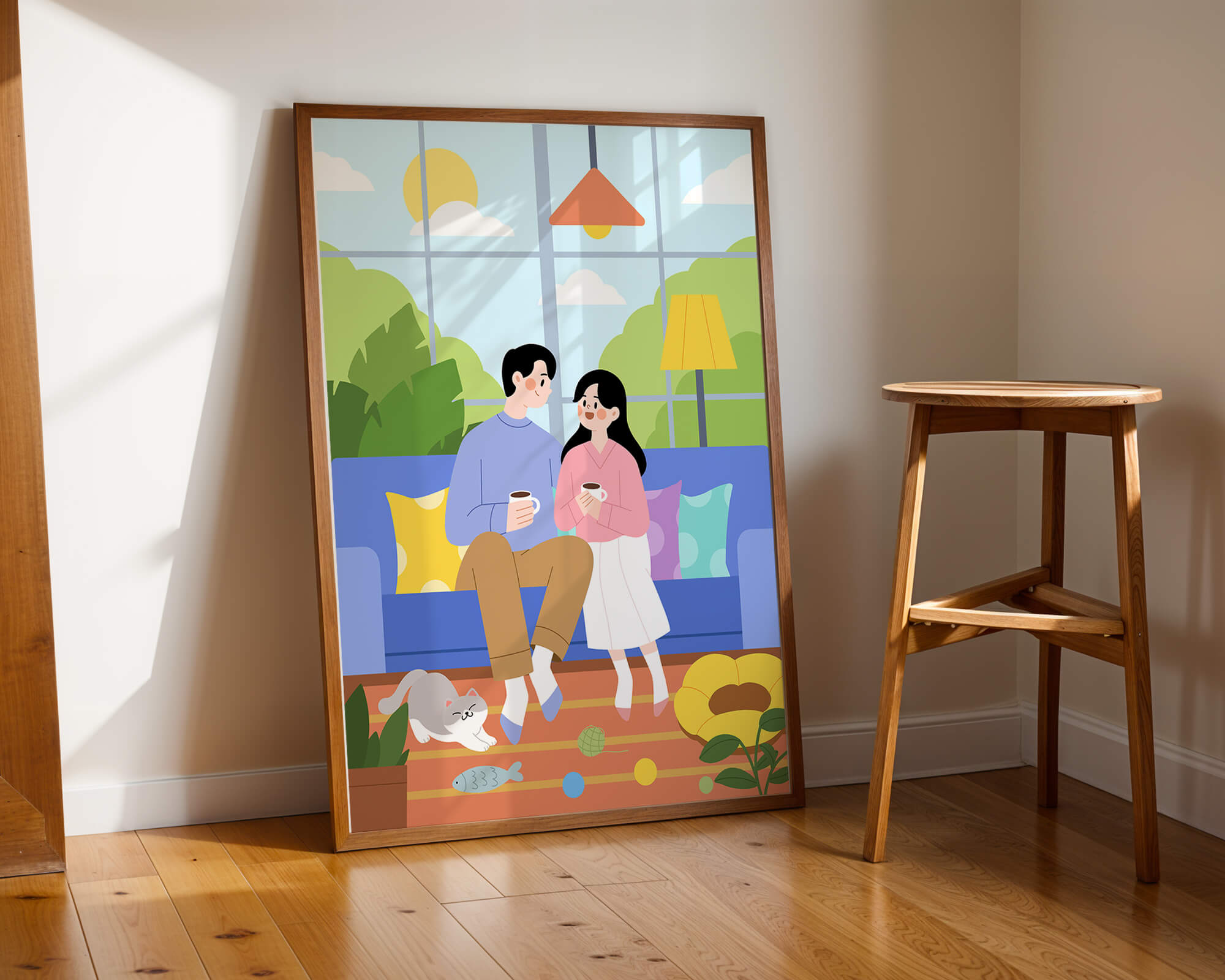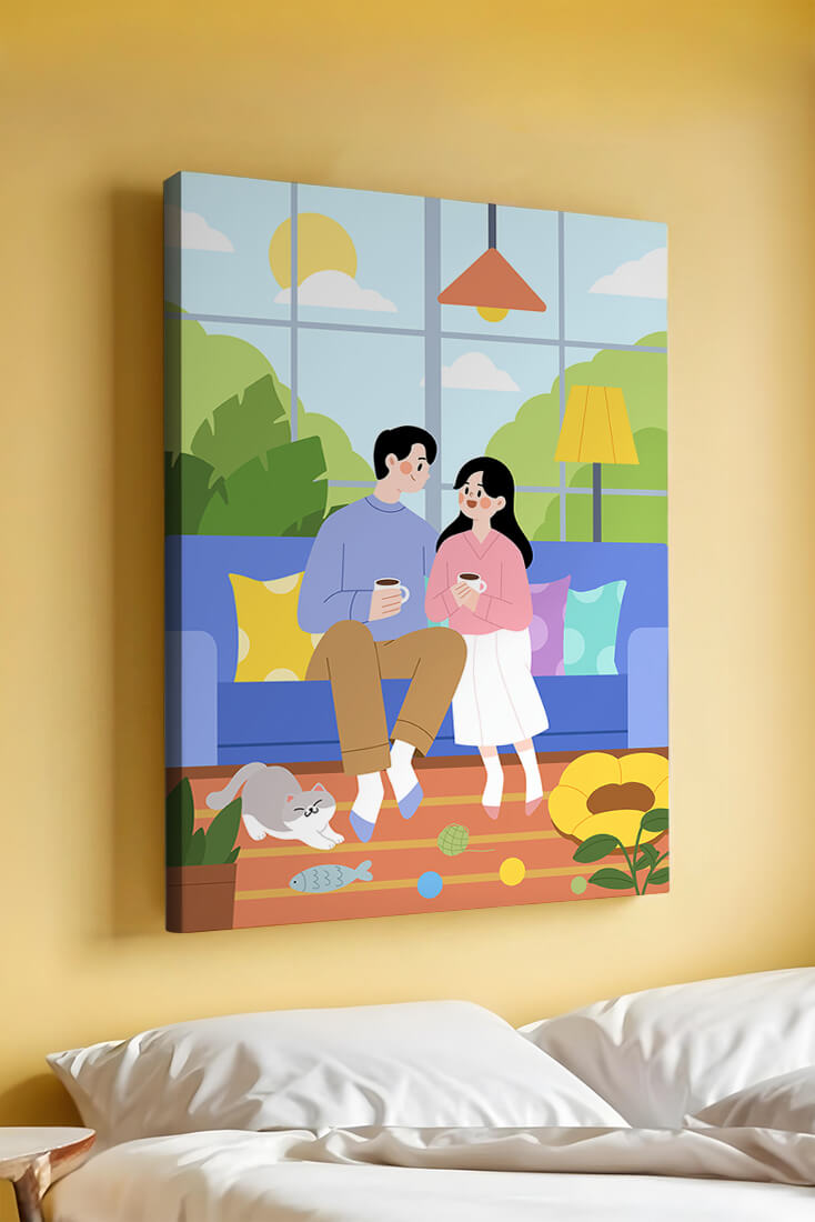 Иллюстрация изображает уютную гостиную, где пара делится спокойным моментом. Яркая и игривая атмосфера еще больше усиливается очаровательной кошкой, резвящейся с игрушками на полу.