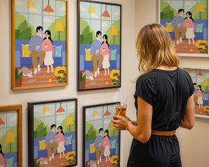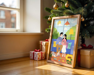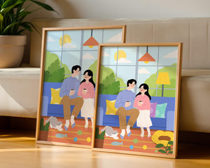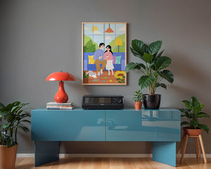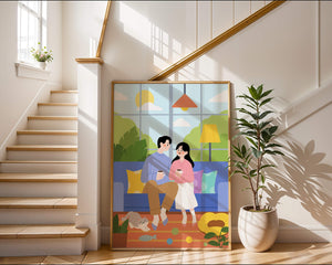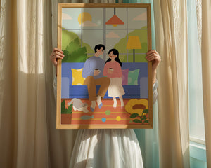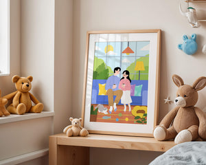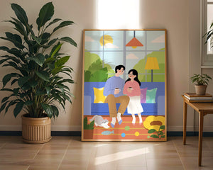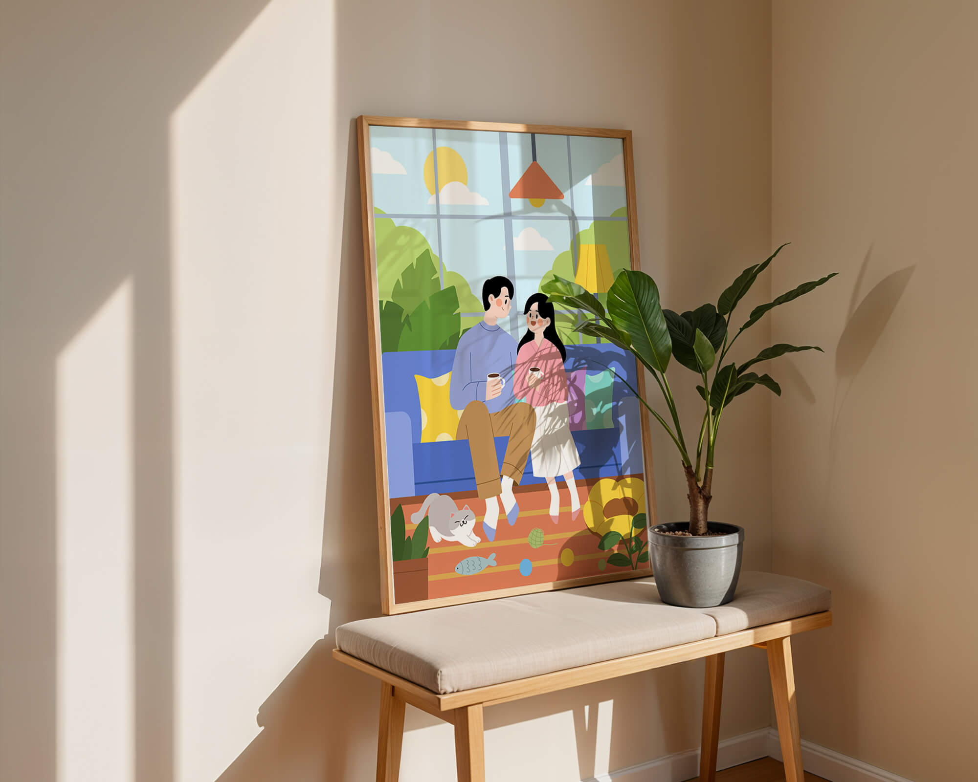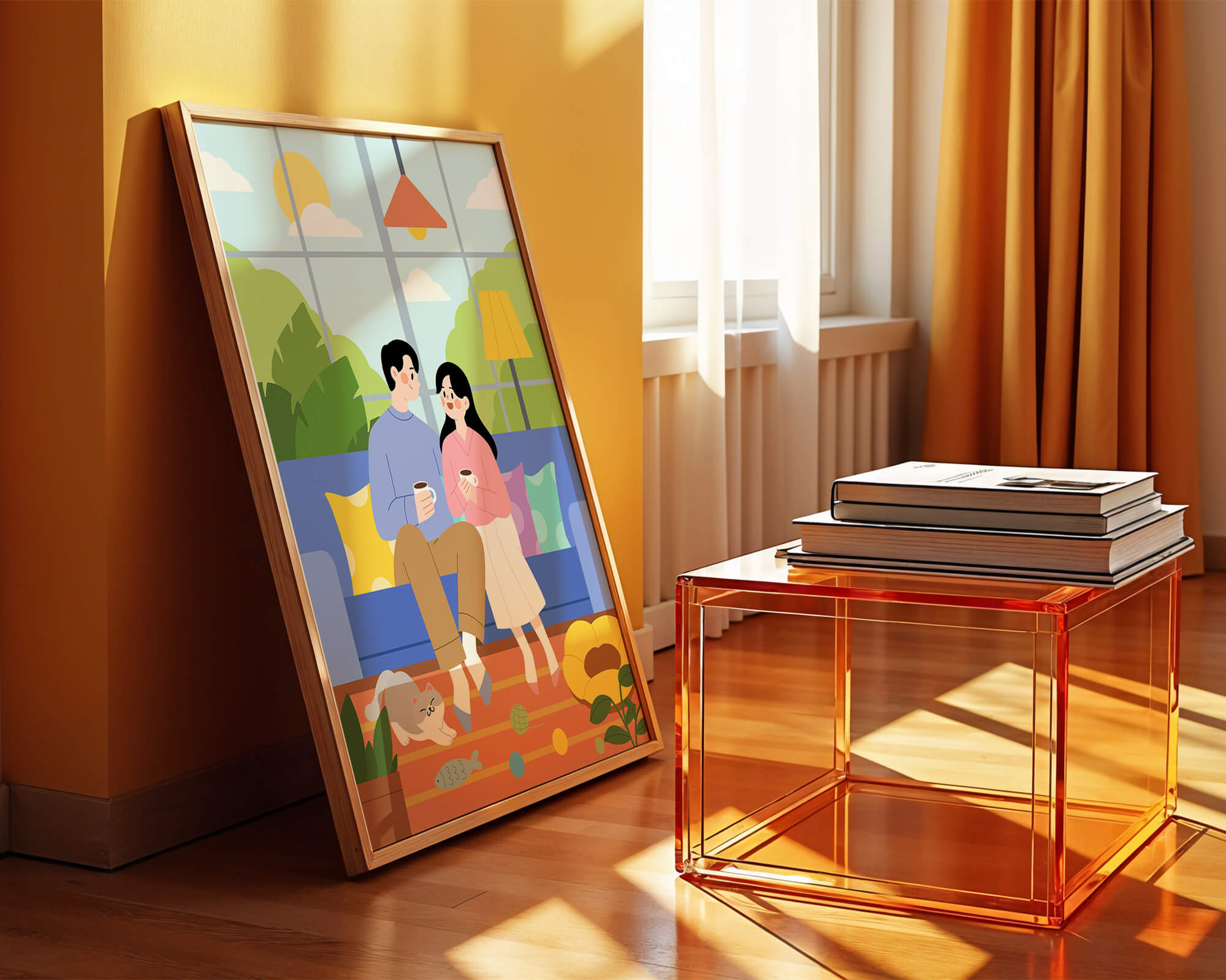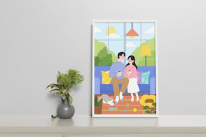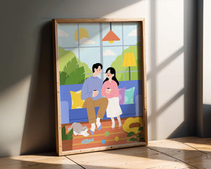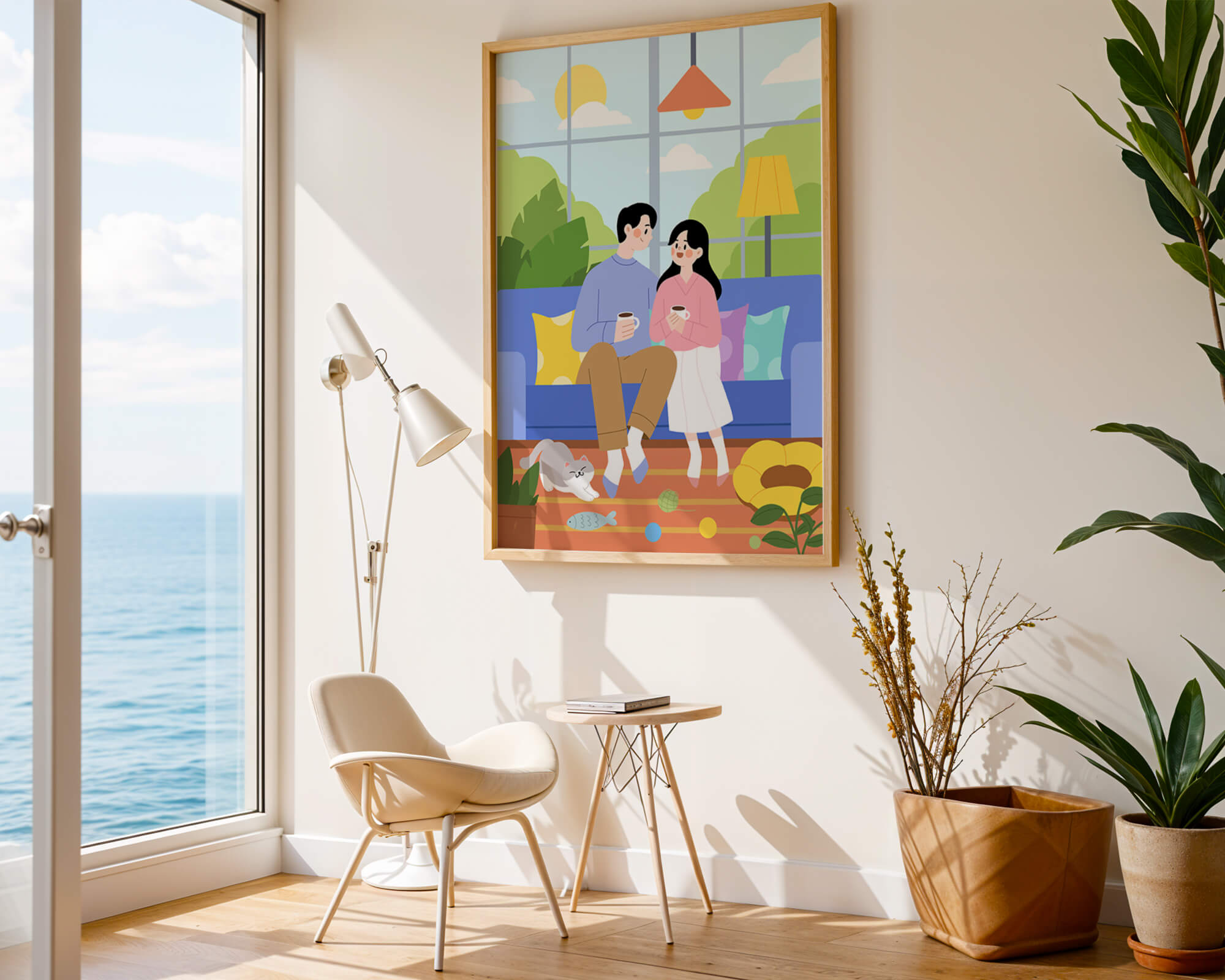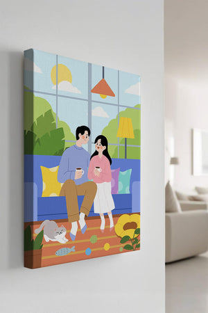 Иллюстрация изображает уютную гостиную, где пара делится спокойным моментом. Яркая и игривая атмосфера еще больше усиливается очаровательной кошкой, резвящейся с игрушками на полу.