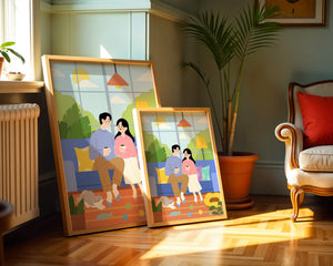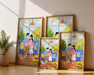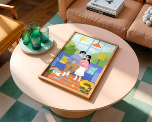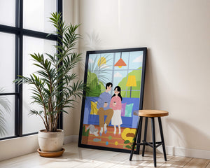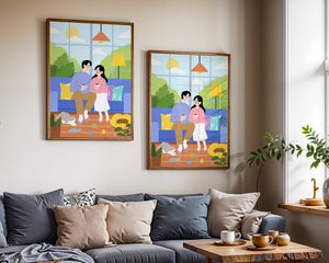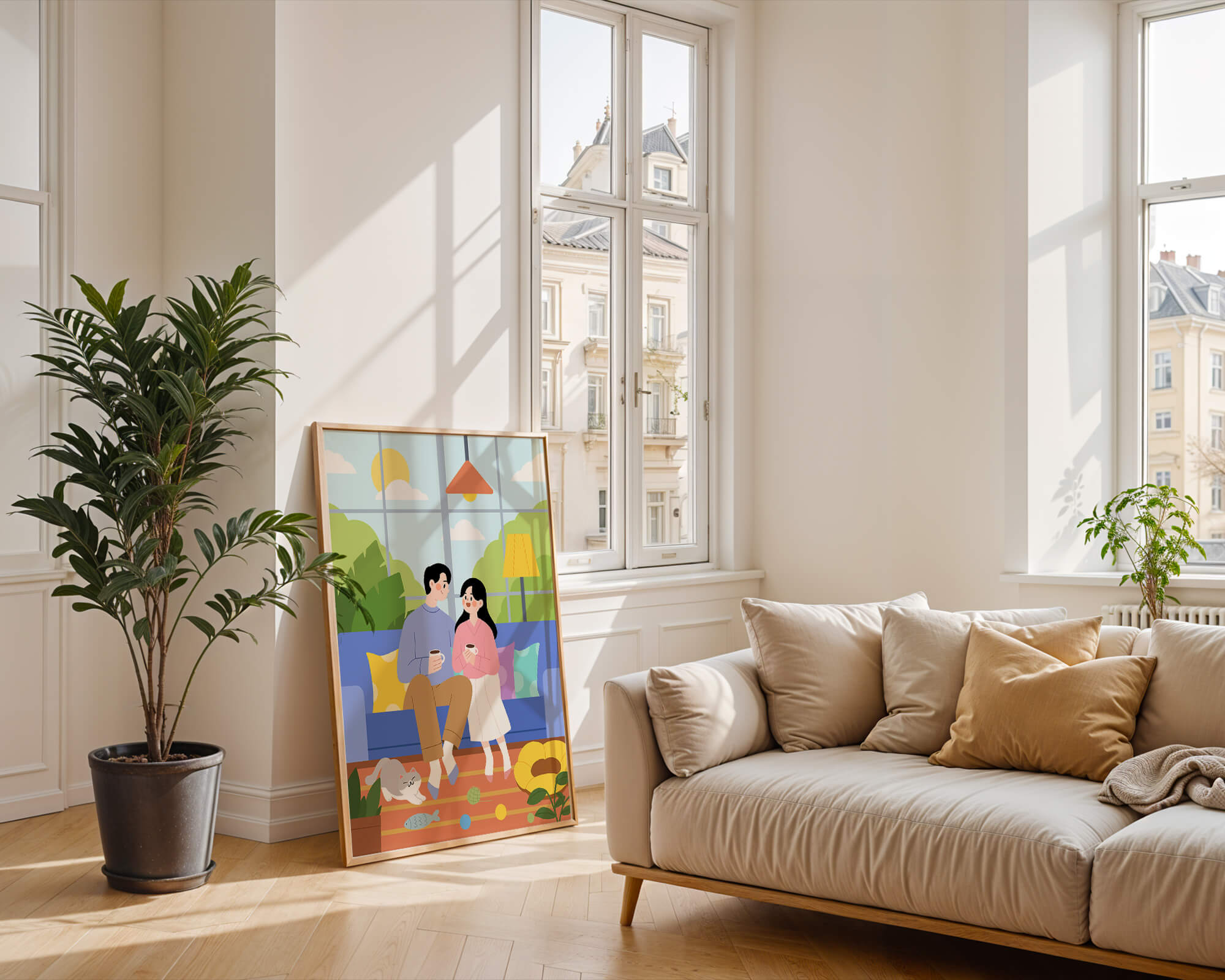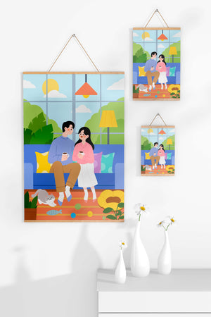 Комната красиво оформлена синим диваном, украшенным разноцветными подушками, которые дополняют яркую атмосферу. Большое окно позволяет естественному солнечному свету заполнять пространство, создавая теплое свечение над парой, наслаждающейся своим кофе. Пышная зелень за окном усиливает спокойную атмосферу, привнося частичку природы внутрь. К живой сцене добавляется игривая кошка, исследующая коллекцию игрушек на узорчатом ковре. Нежный, спокойный характер гостиной подчеркивается напольной лампой, излучающей мягкий свет, создавая идеальные условия для отдыха и интимных разговоров. Этот образ передает суть спокойного дома, где любовь, досуг и счастье сливаются воедино.| Тип |