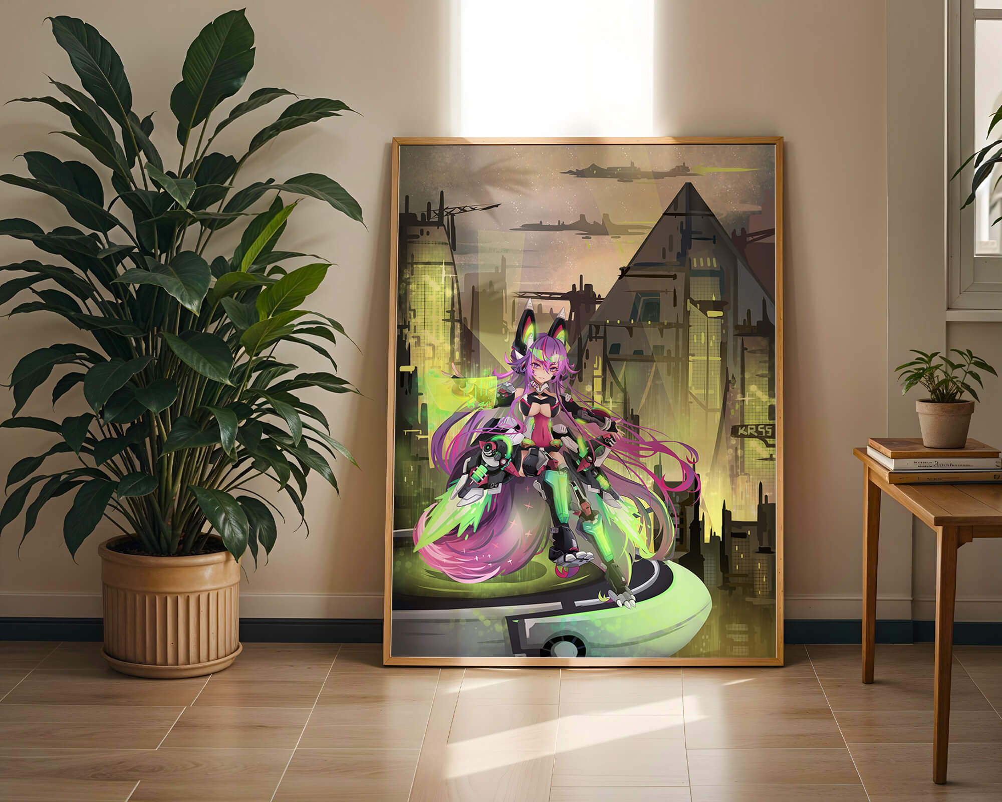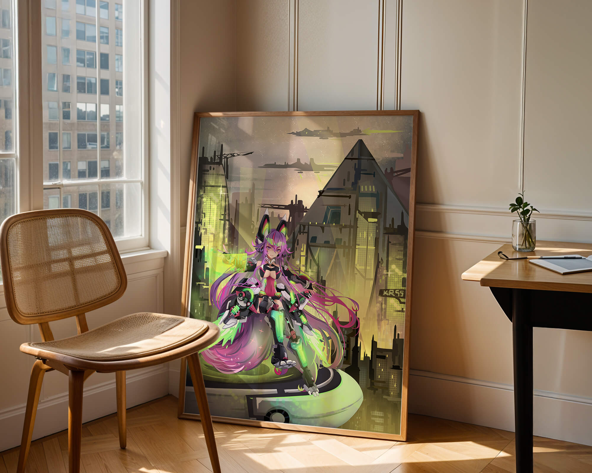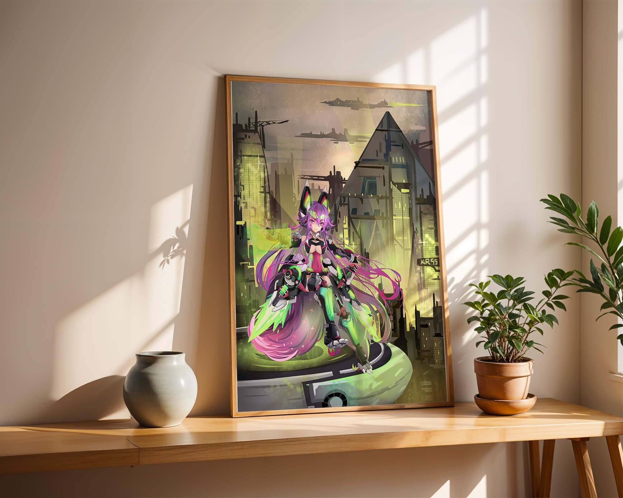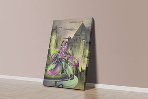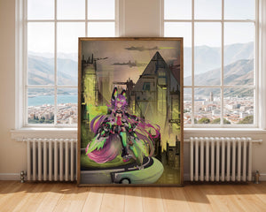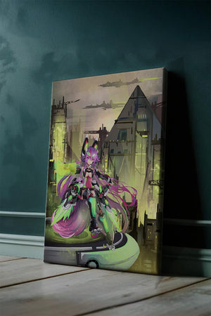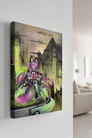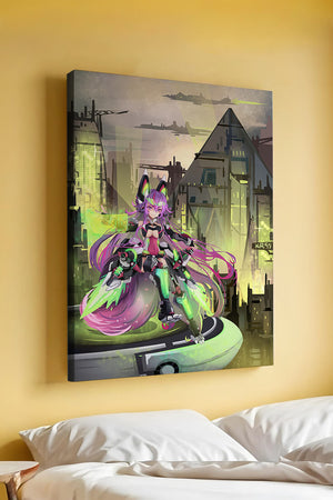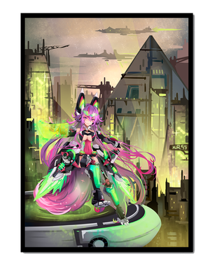 В этом произведении изображён эффектный персонаж аниме с ярко-розовыми волосами и характерными кошачьими ушками, органично вписанный в яркий киберпанк-город. В футуристическом мех-костюме персонаж излучает готовность и энергию, усиливая научно-фантастическую атмосферу сцены. Фон с возвышающимися геометрическими зданиями и светящимися неоновыми акцентами способствует ощущению футуристичности, а парящие транспортные средства добавляют городскому пейзажу сложность и глубину.