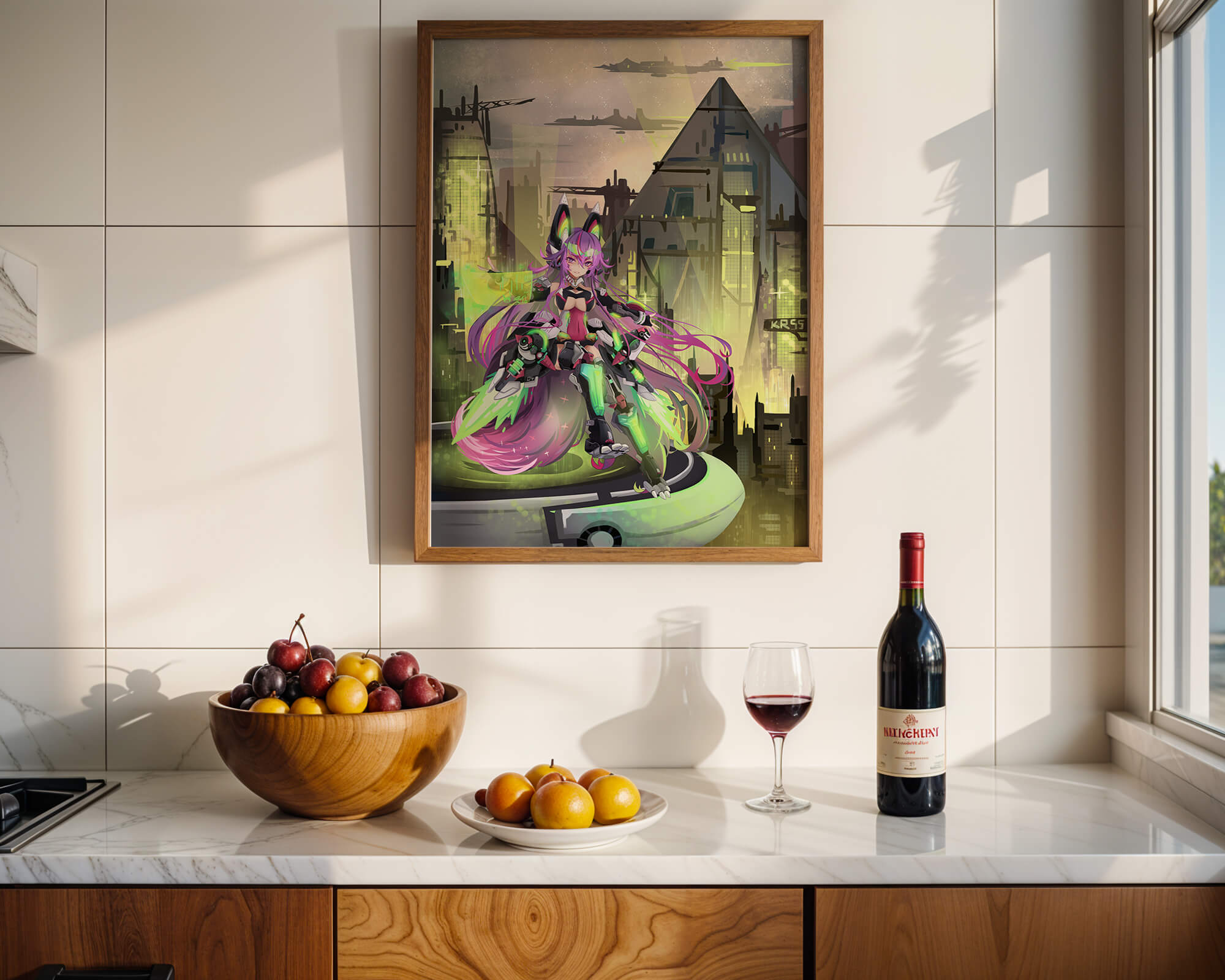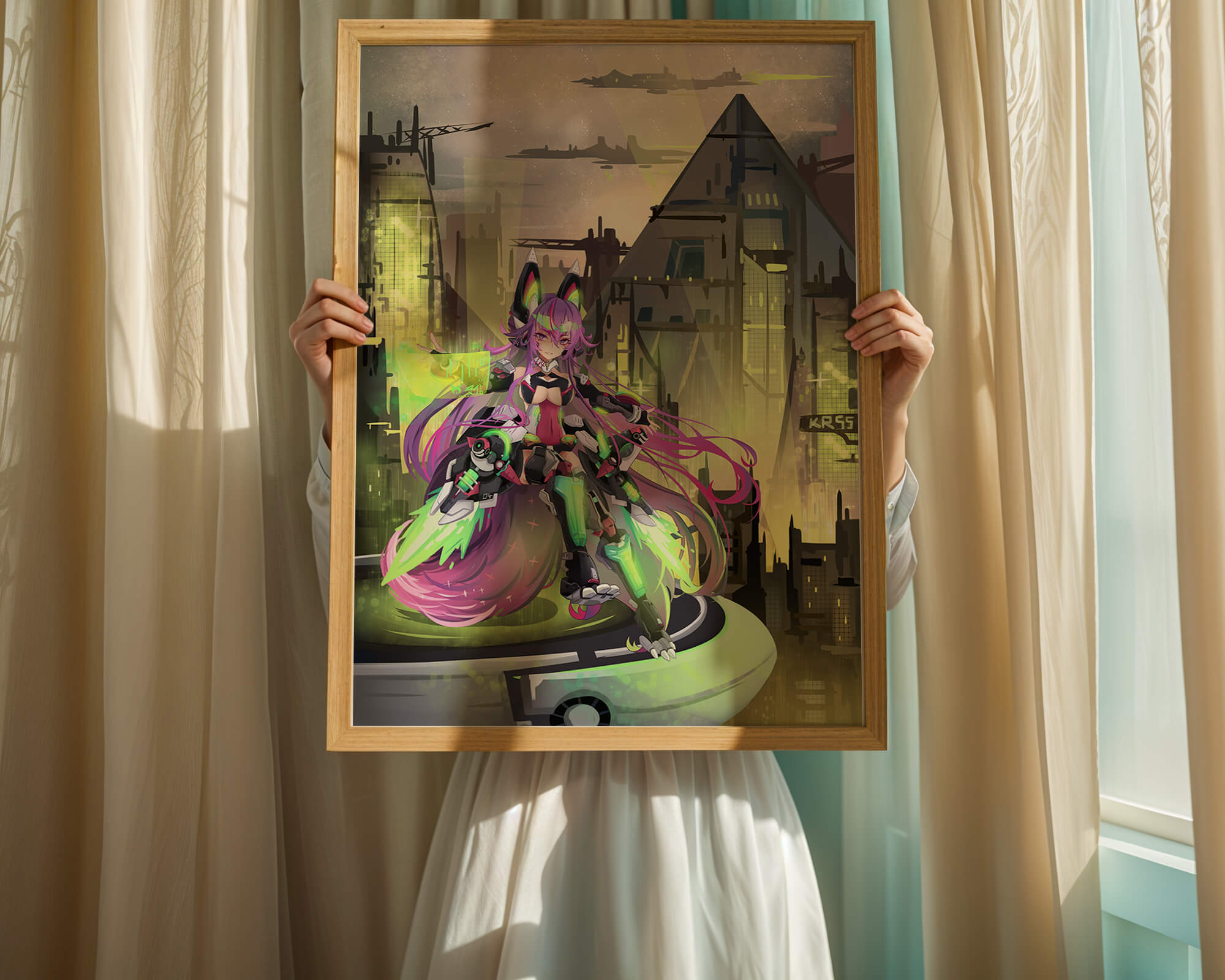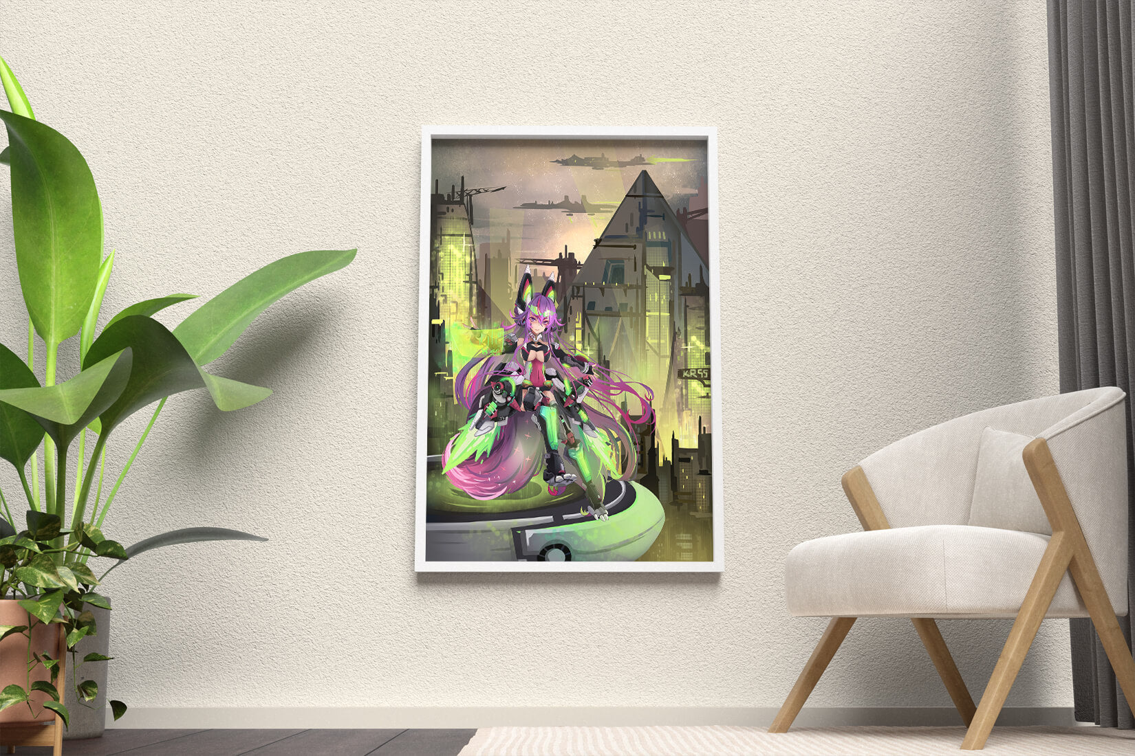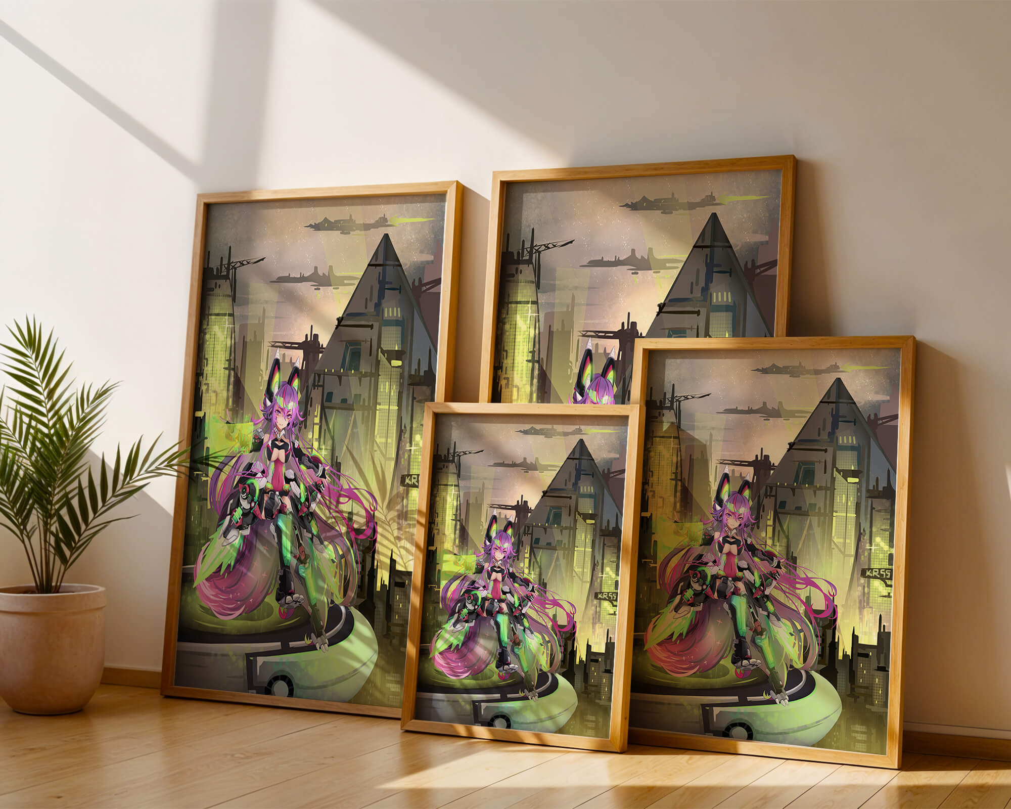 В этом произведении изображён эффектный персонаж аниме с ярко-розовыми волосами и характерными кошачьими ушками, органично вписанный в яркий киберпанк-город. В футуристическом мех-костюме персонаж излучает готовность и энергию, усиливая научно-фантастическую атмосферу сцены. Фон с возвышающимися геометрическими зданиями и светящимися неоновыми акцентами способствует ощущению футуристичности, а парящие транспортные средства добавляют городскому пейзажу сложность и глубину.