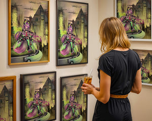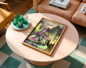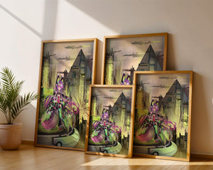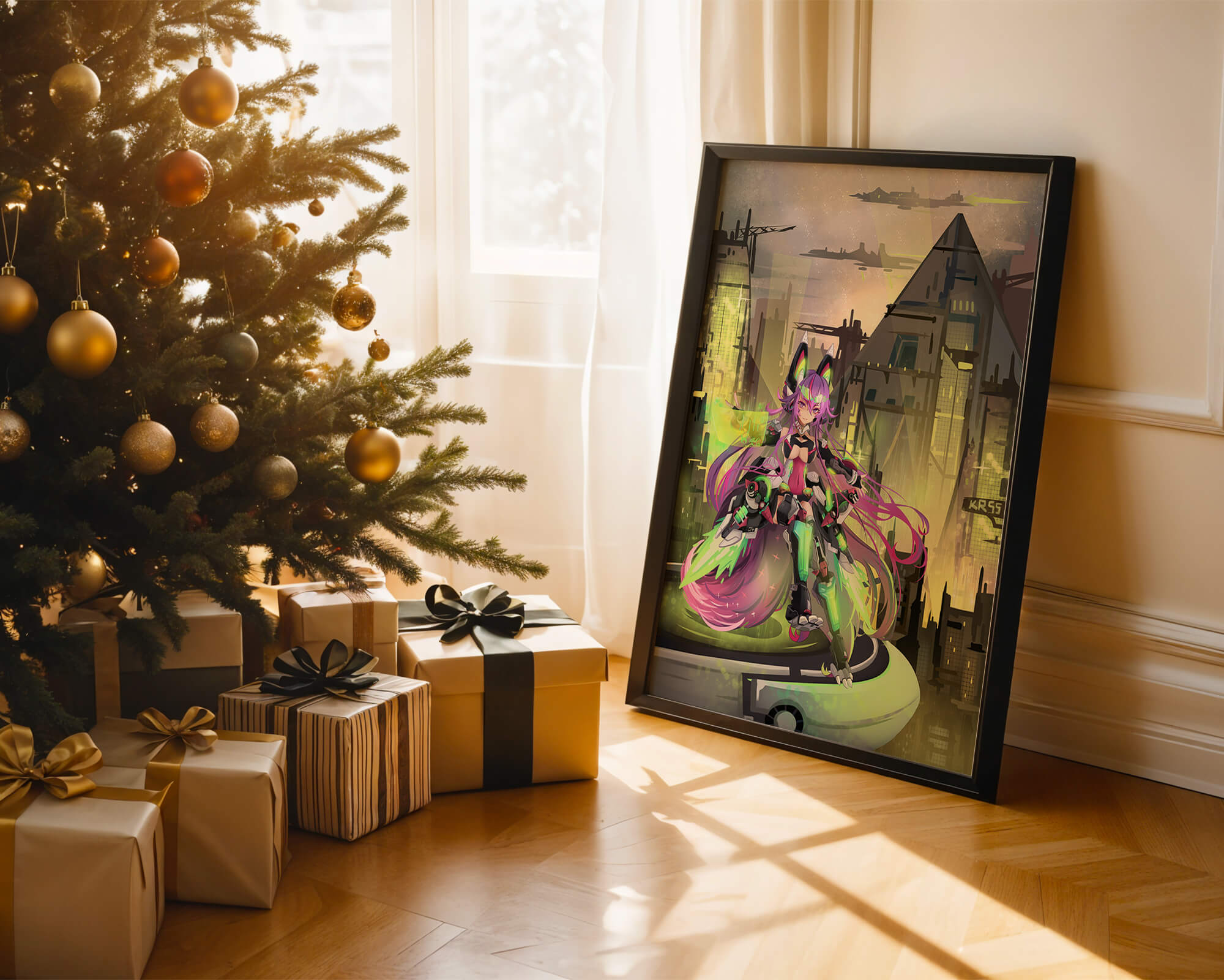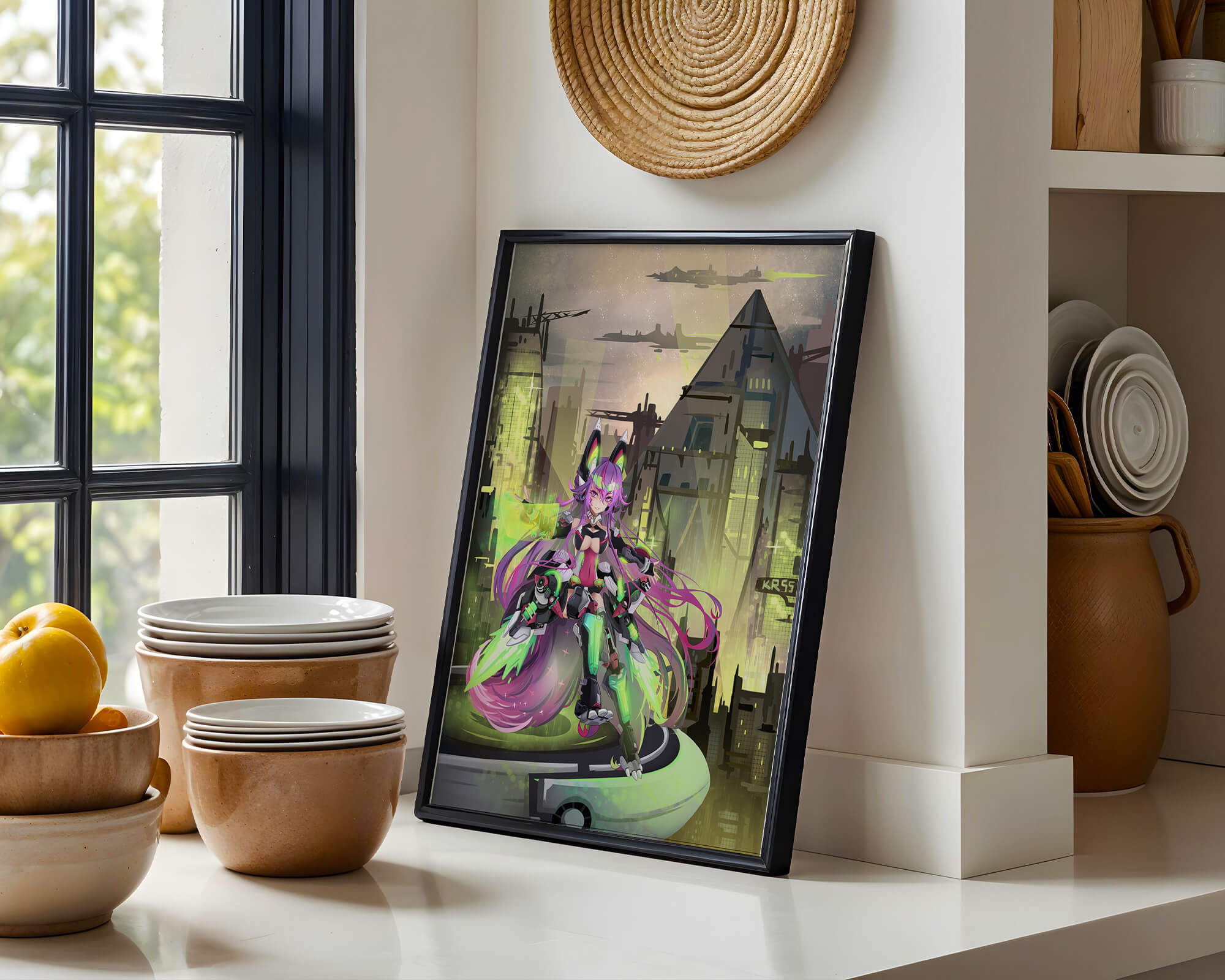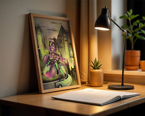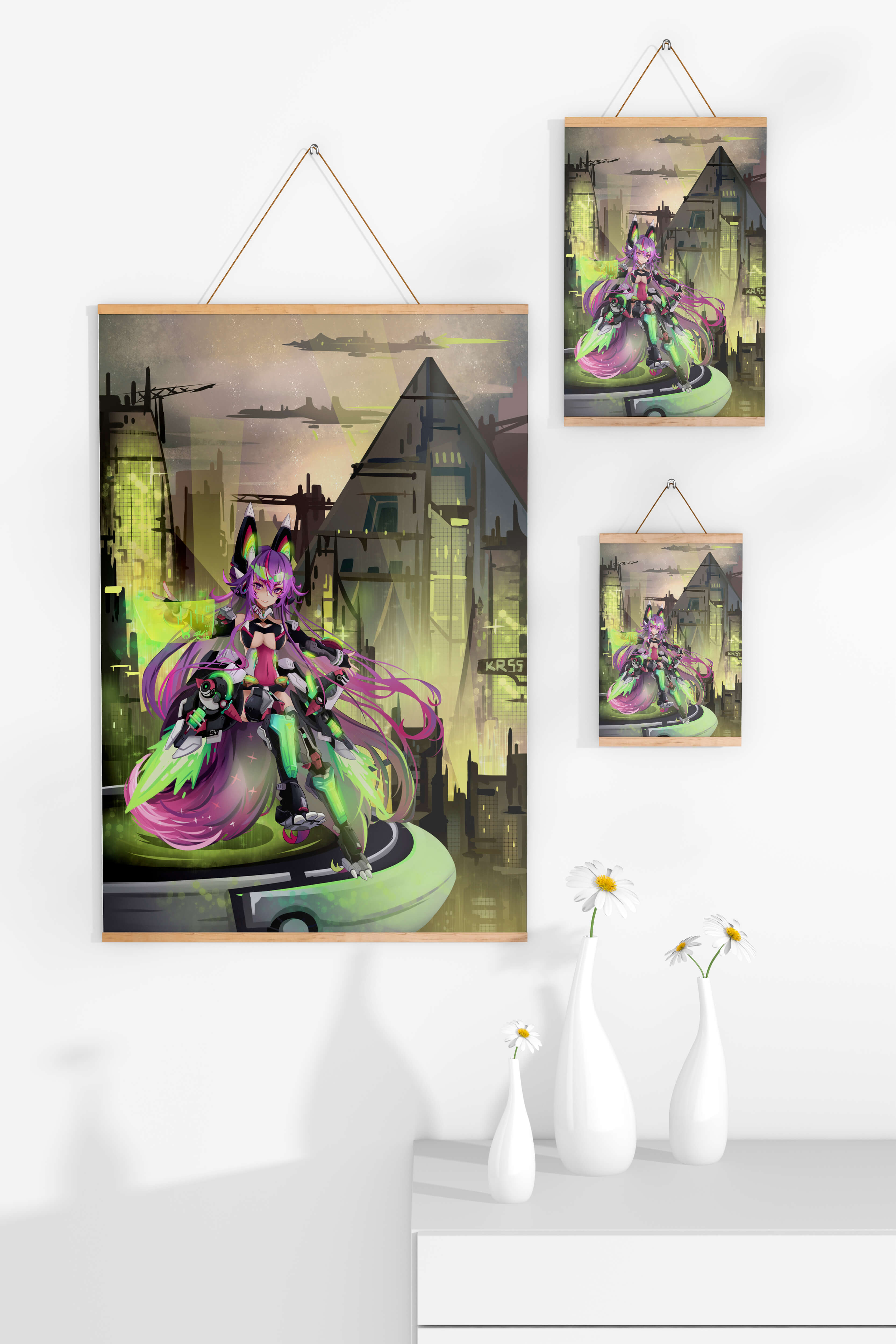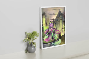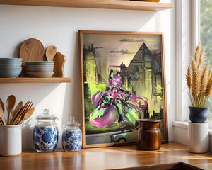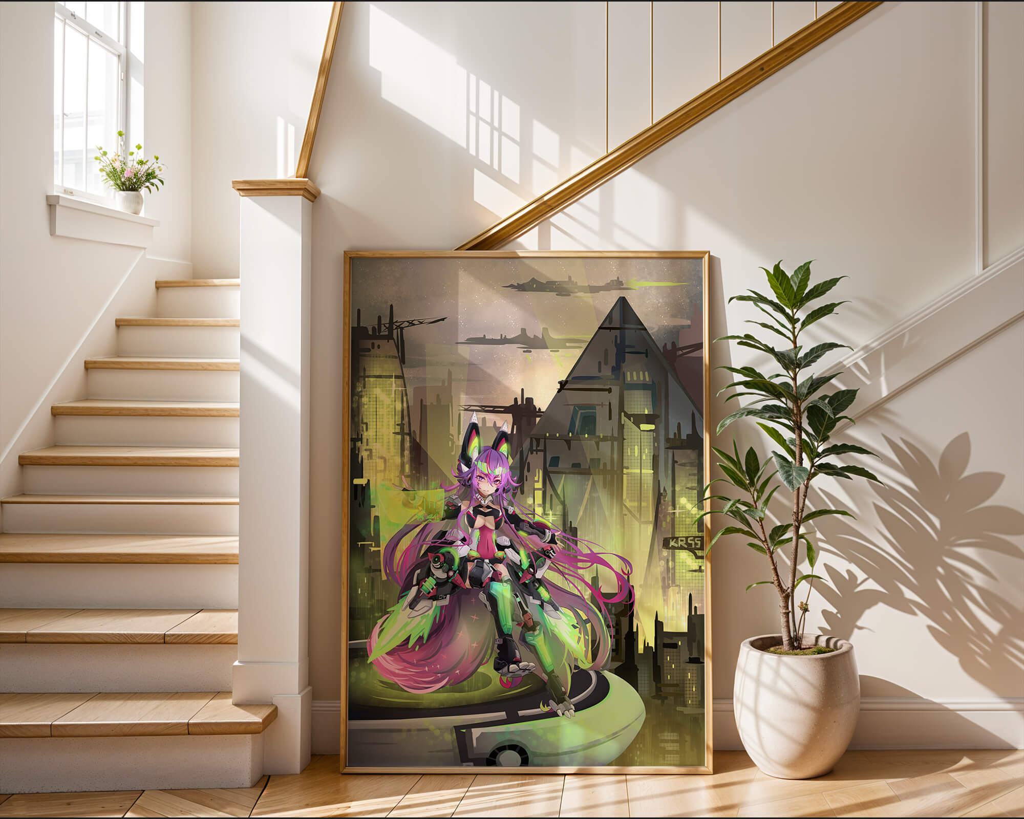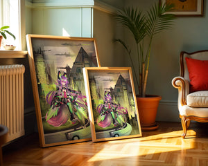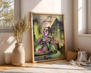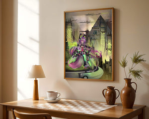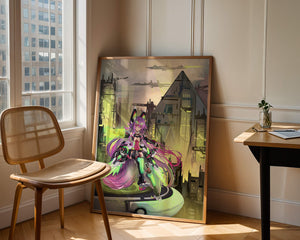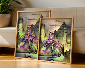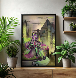 Сочетание насыщенных цветов и замысловатых деталей демонстрирует мастерское владение цифровыми художественными приёмами, вовлекая зрителя в мир, где технологии и воображение сходятся воедино. Это произведение является прекрасным воплощением современной эстетики аниме в сочетании с футуристической киберпанк-тематикой, делая его захватывающим и визуально привлекательным дополнением к любой коллекции.