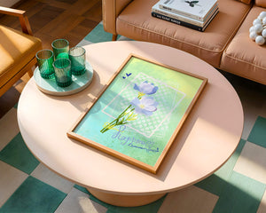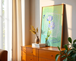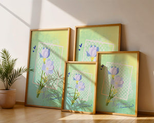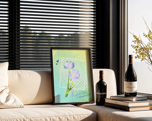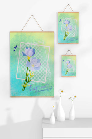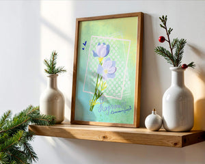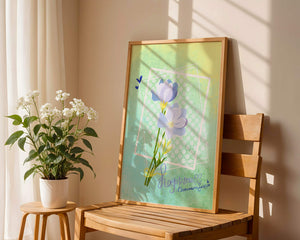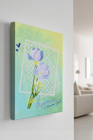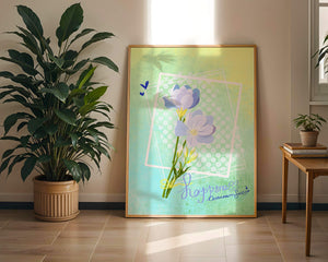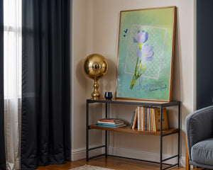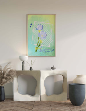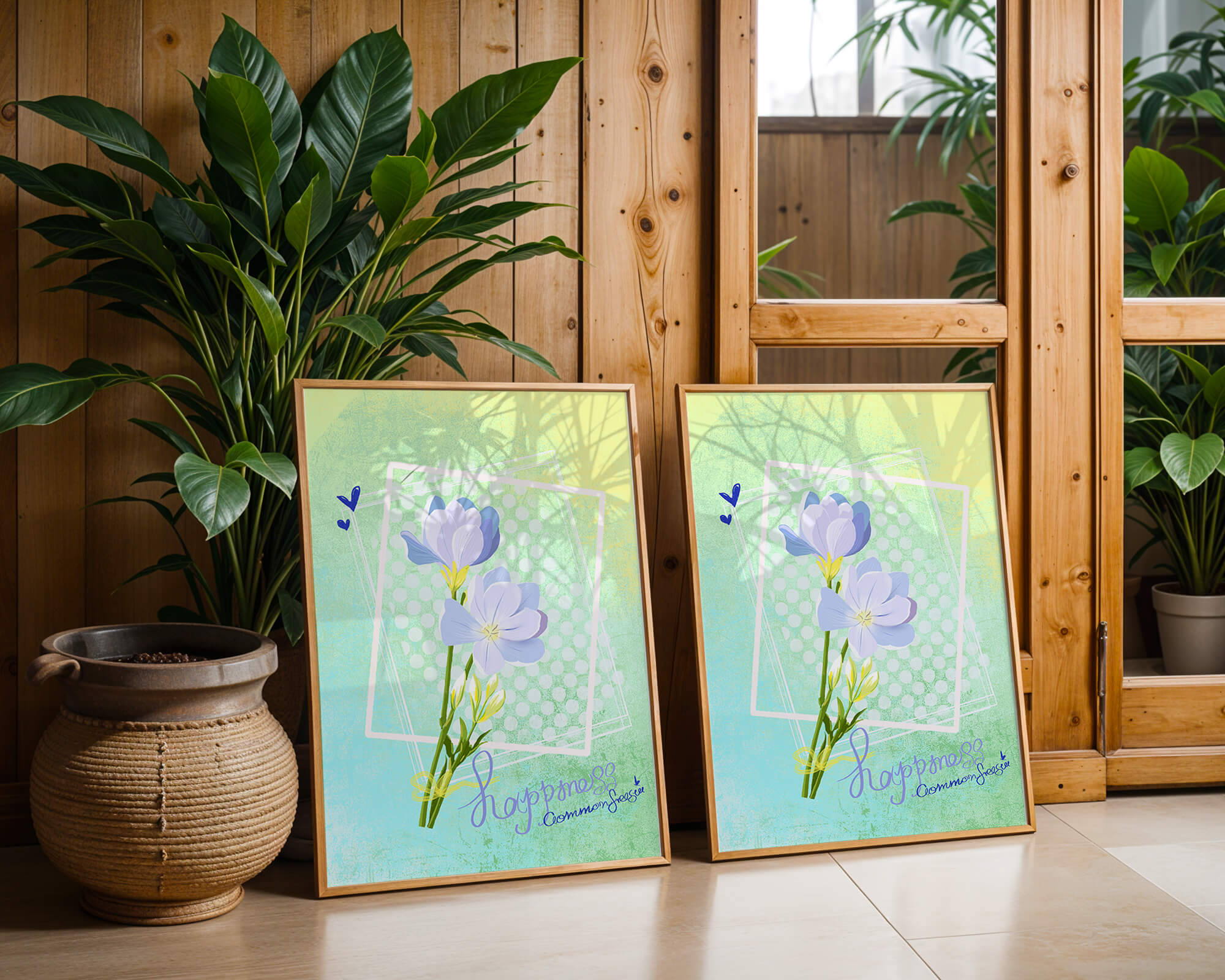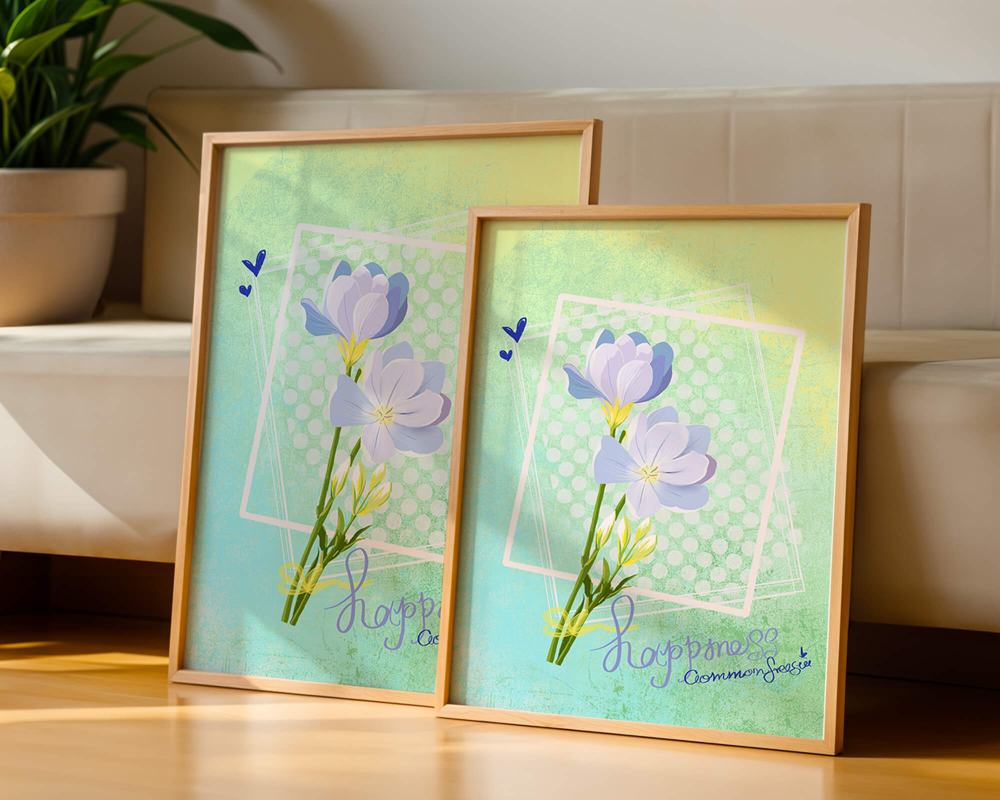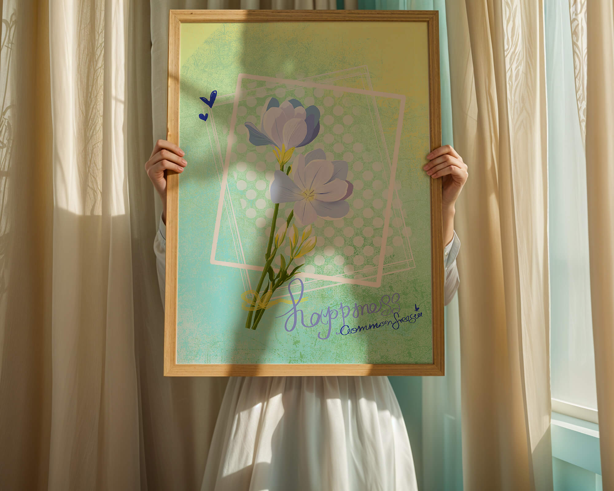 Центральным элементом произведения являются цветы фрезии, изображенные в мягком и элегантном стиле. Их светло-голубые лепестки выделяются на слоистом фоне, создавая ощущение глубины и гармонии. Плавный изгиб стеблей и бутонов цветов добавляет динамики и естественности в иллюстрацию. Фон с сочетанием пастельных цветов и тонкой текстурой усиливает успокаивающую и жизнерадостную атмосферу произведения. Использование горошка придает игривое и ретро-ощущение, а рукописный шрифт в правом нижнем углу пишет "Счастье" и "Обыкновенная фрезия" в жизнерадостной и непринужденной манере. Это произведение станет очаровательным дополнением любого современного жилого пространства, принося с собой суть весенней радости и элегантности.| Тип |