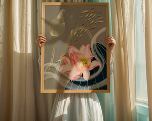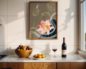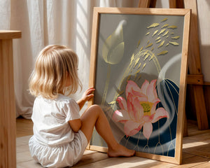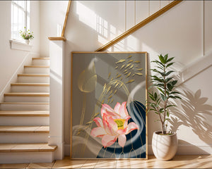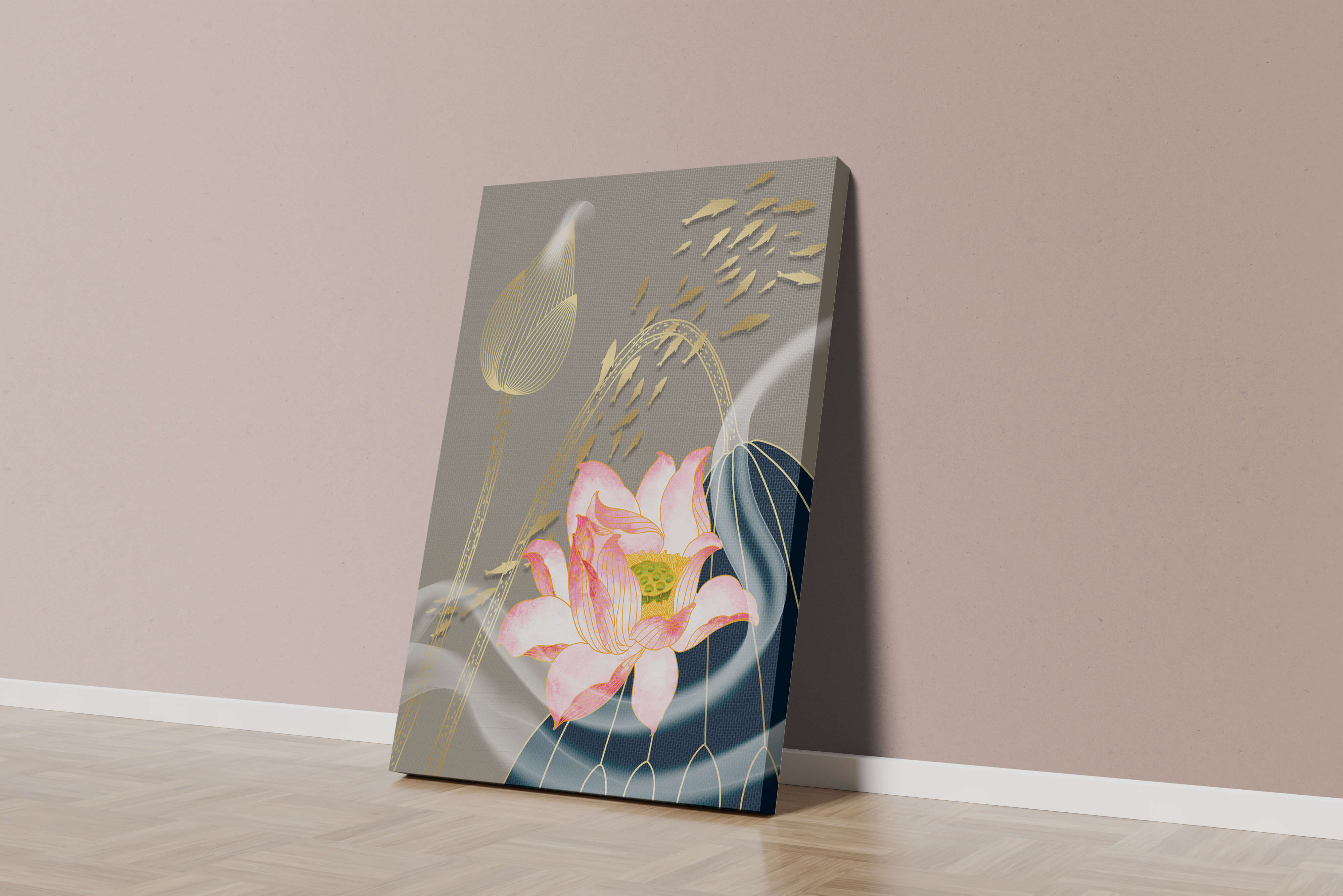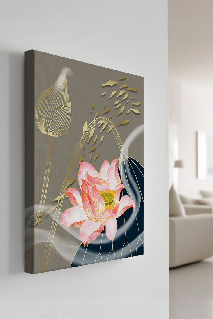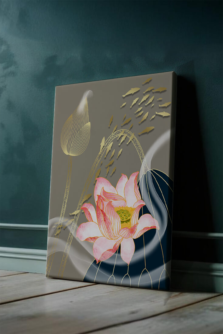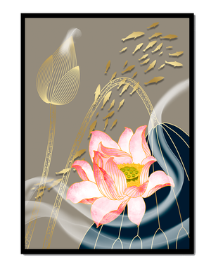 Эта композиция содержит красиво детализированный розовый лотос в качестве центрального элемента, подчеркнутый сложной линией, придающей ему ощущение жизни и движения. Лотос дополняется распускающимся цветком, выполненным в элегантных золотых контурах, добавляя изысканность к дизайну. Золотые рыбы грациозно плавают вокруг цветочных элементов, переплетаясь с мягкими и плавными волнами, которые добавляют динамичную энергию к композиции. Использование золота и спокойного серого фона подчеркивает умиротворяющую и спокойную атмосферу изображения, делая его идеальным дополнением к современному домашнему декору.| Тип |