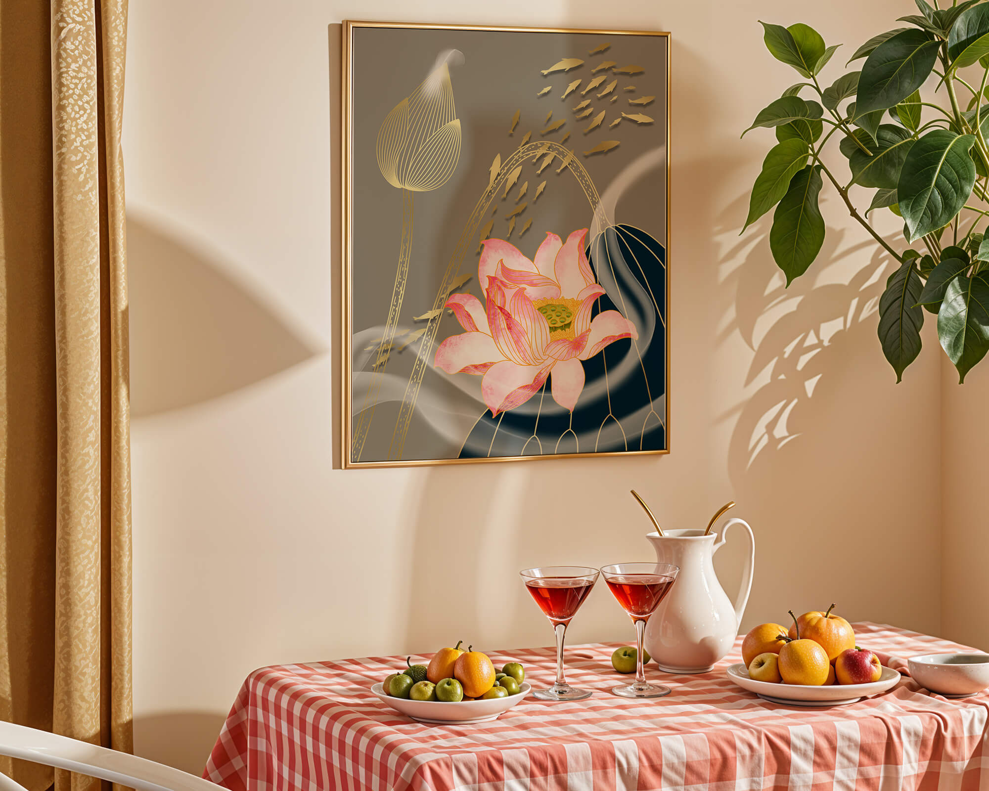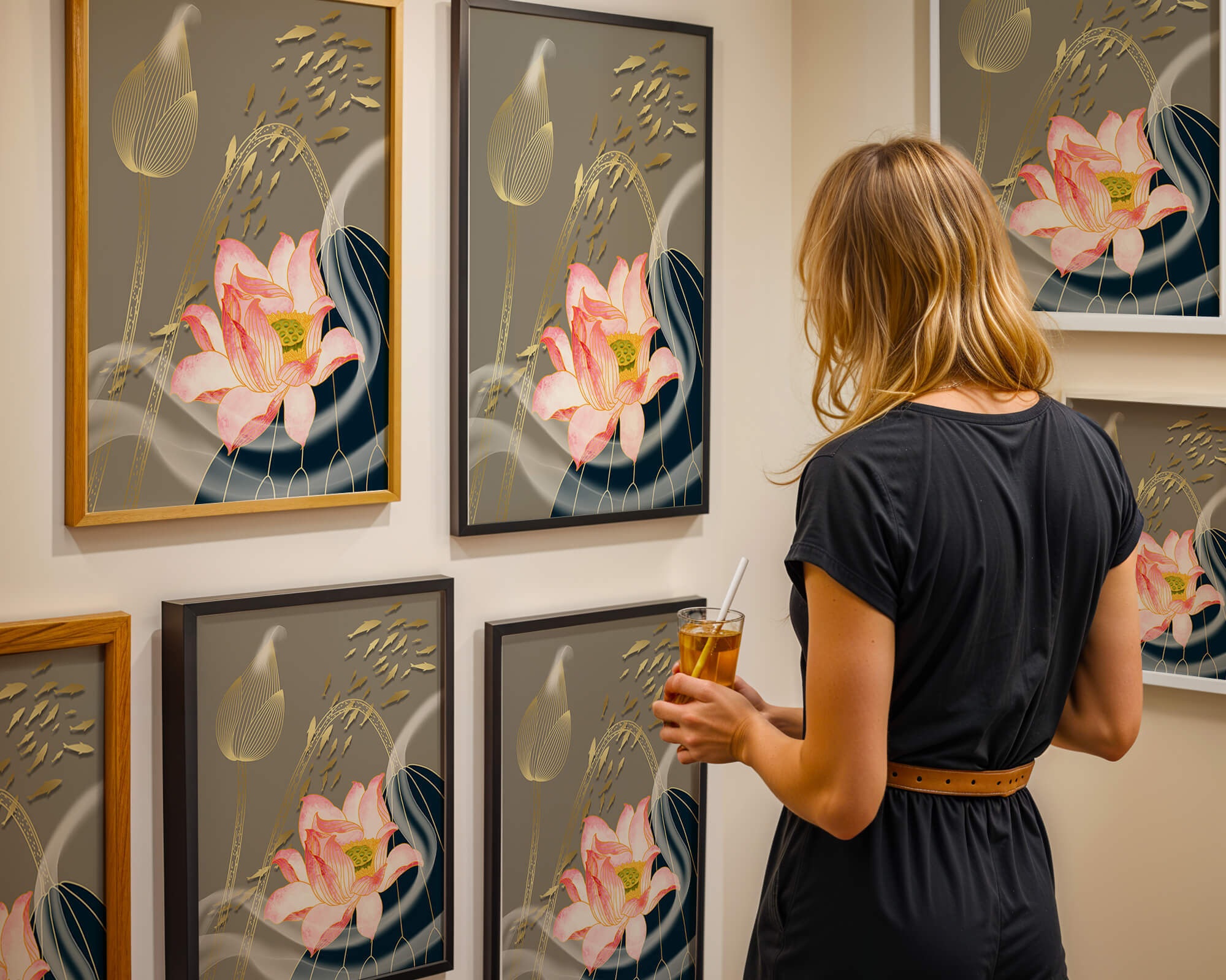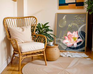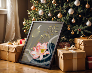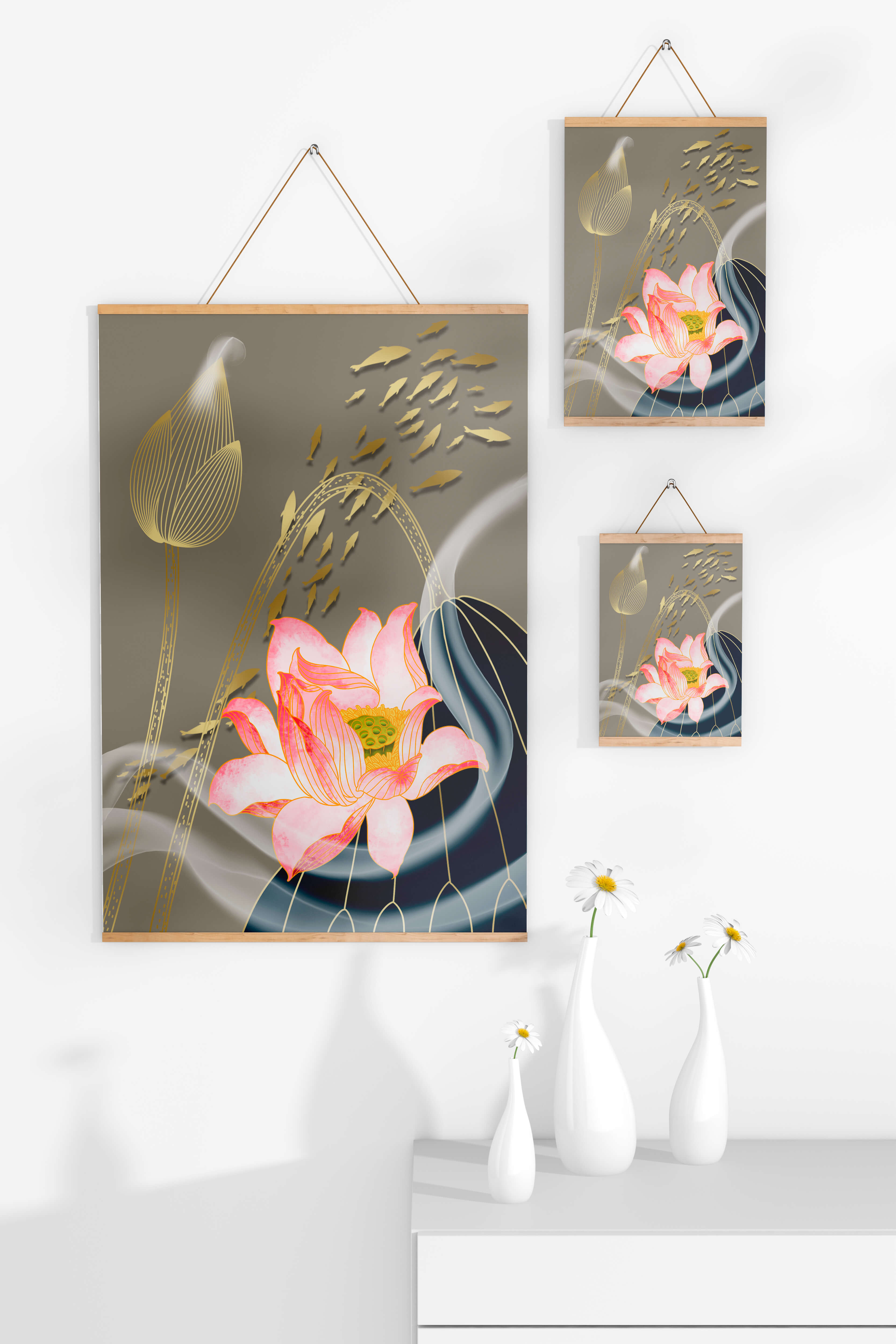 Эта композиция содержит красиво детализированный розовый лотос в качестве центрального элемента, подчеркнутый сложной линией, придающей ему ощущение жизни и движения. Лотос дополняется распускающимся цветком, выполненным в элегантных золотых контурах, добавляя изысканность к дизайну. Золотые рыбы грациозно плавают вокруг цветочных элементов, переплетаясь с мягкими и плавными волнами, которые добавляют динамичную энергию к композиции. Использование золота и спокойного серого фона подчеркивает умиротворяющую и спокойную атмосферу изображения, делая его идеальным дополнением к современному домашнему декору.| Тип |